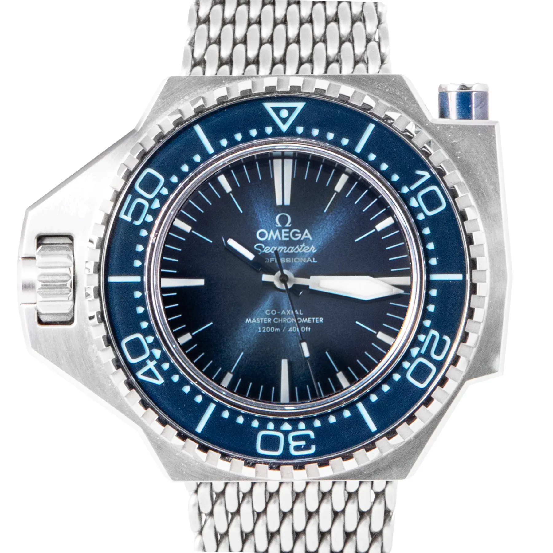 This Pre-owned Omega Seamaster Ploprof 1200M 55mm x 45 mm, steel case, blue dial, sapphire crystal bezel and steel mesh bracelet is in excellent mint condition. Mechanised by Omega calibre 8912 automatic movement. Includes box, extra rubber strap, and sales warranty card dated October 2024.