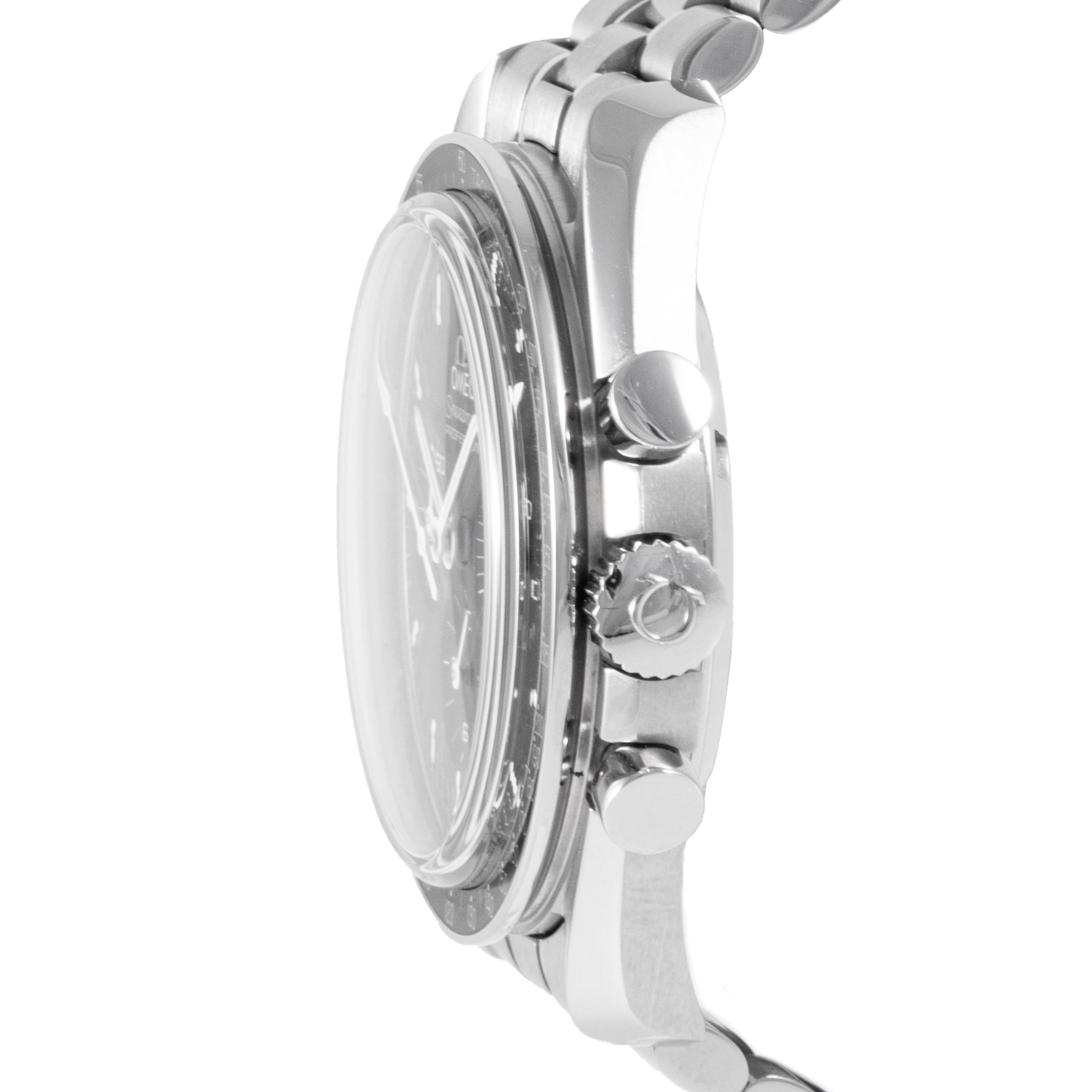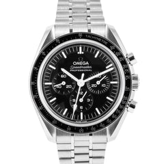 This Pre-owned Omega Speedmaster Moonwatch Professional 42mm, steel case, black dial, aluminium bezel and steel bracelet with 21 links is in very good condition. Mechanised by Omega calibre 3861 manual movement. Includes box, extra black leather strap, sales warranty card dated September 2021 and 2 years Timepiece360 warranty.