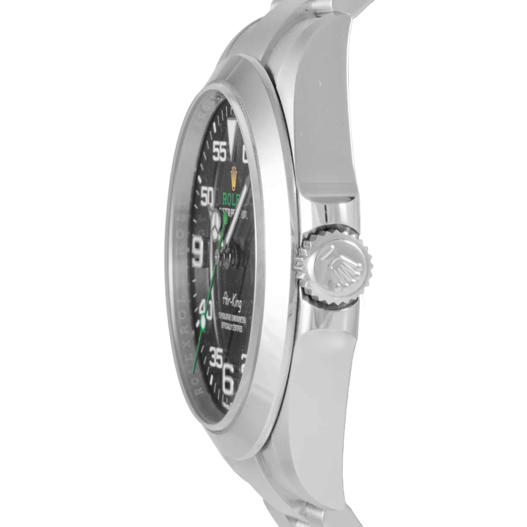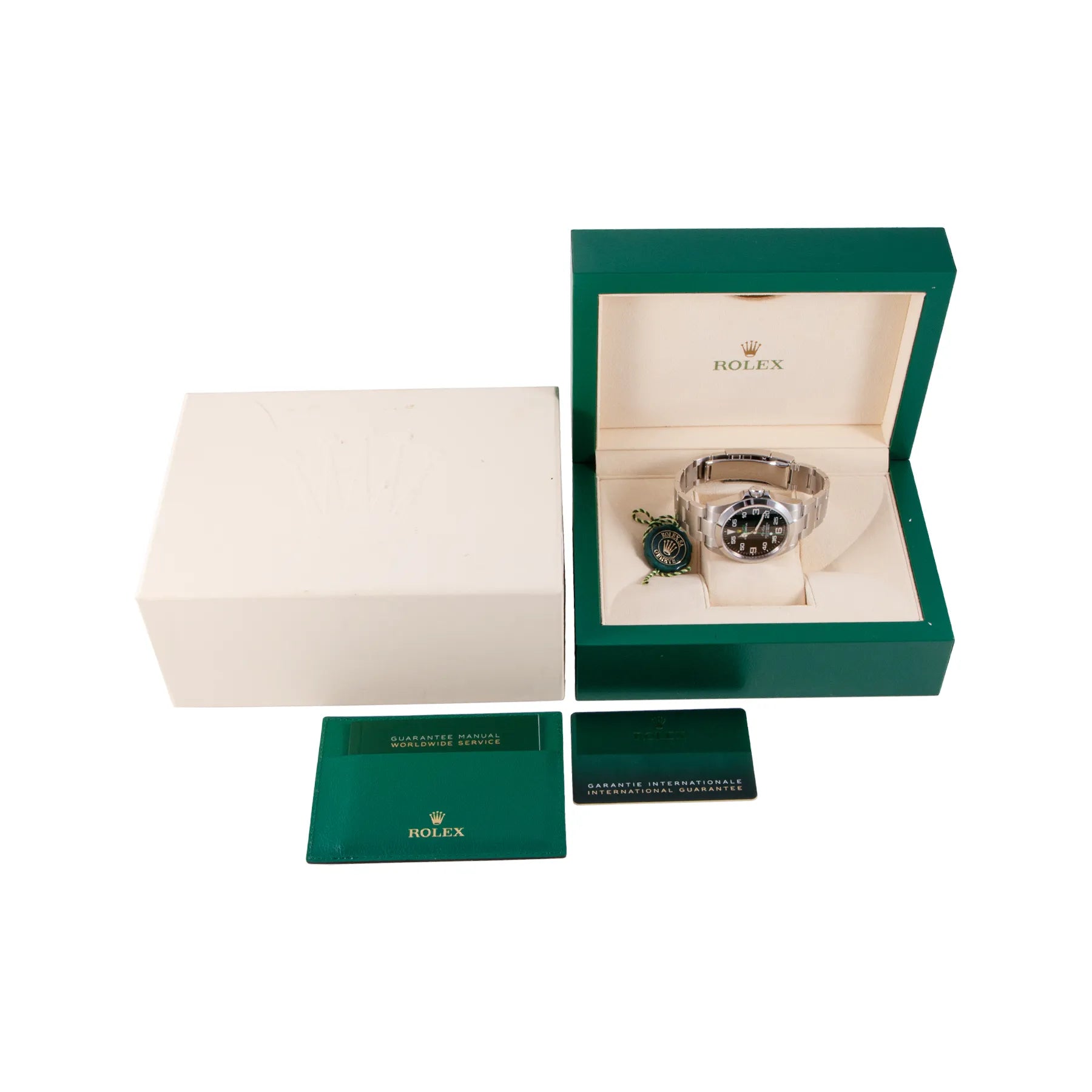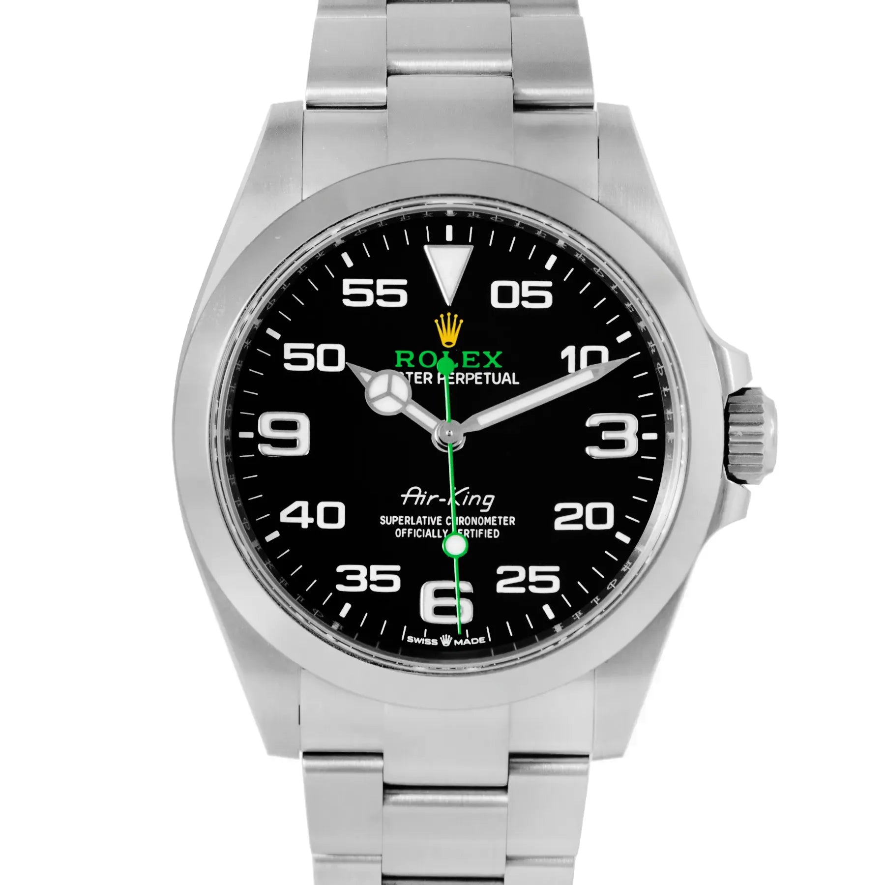 This Rolex Air-King 40mm, steel case, black dial, steel bezel and steel oyster bracelet with 12 links in very good condition. Mechanized by Rolex calibre 3230 automatic movement. Includes box and Rolex sales warranty card dated October 2023.