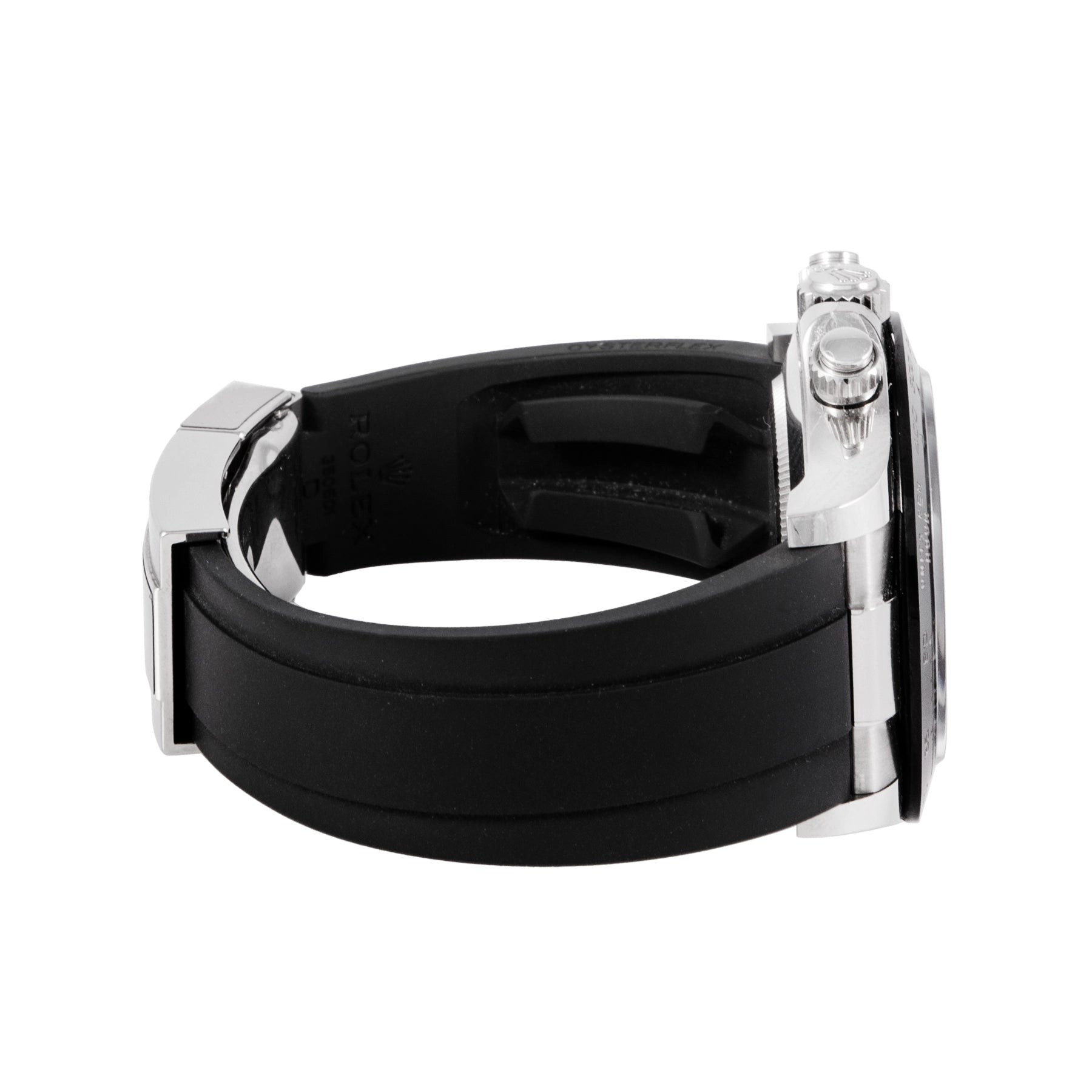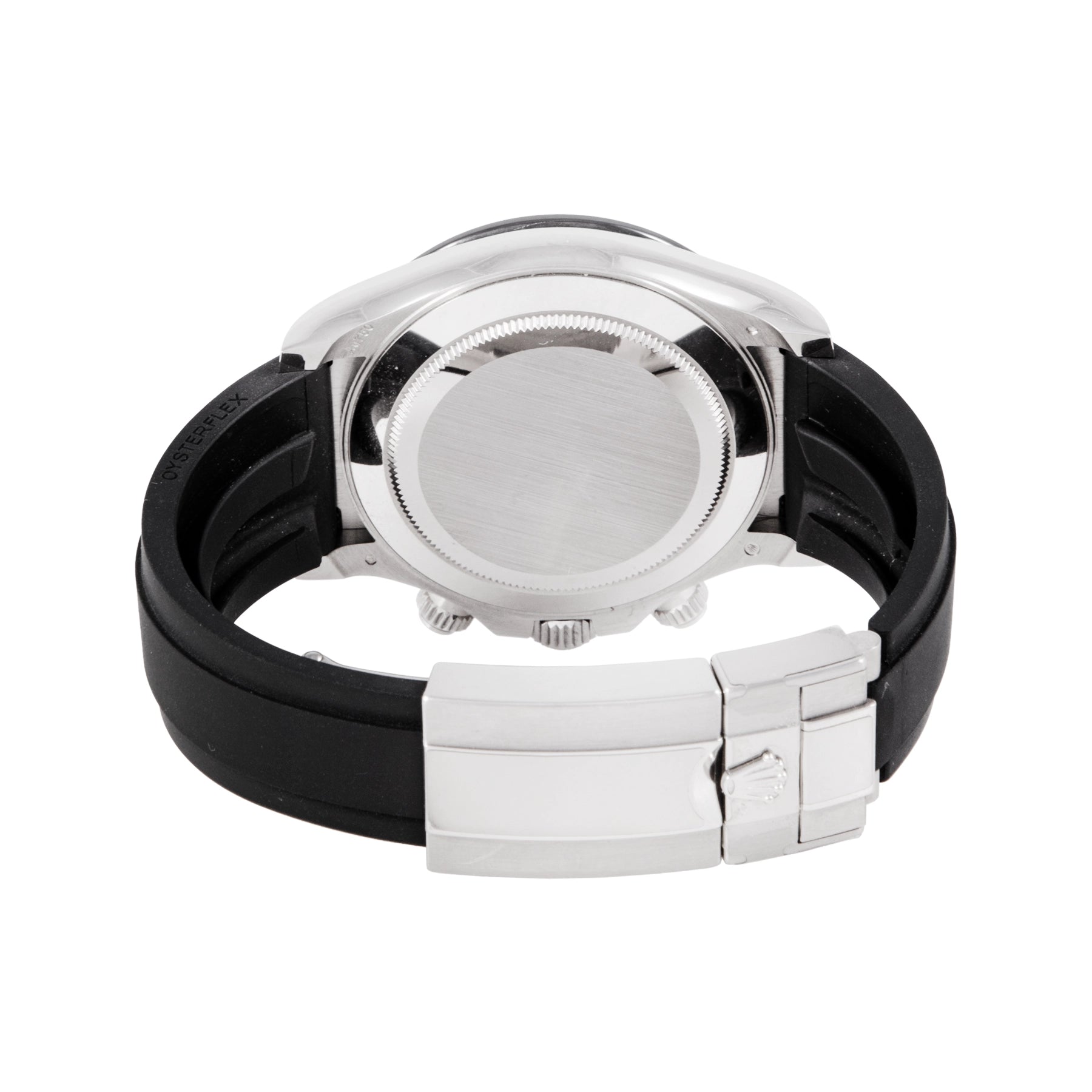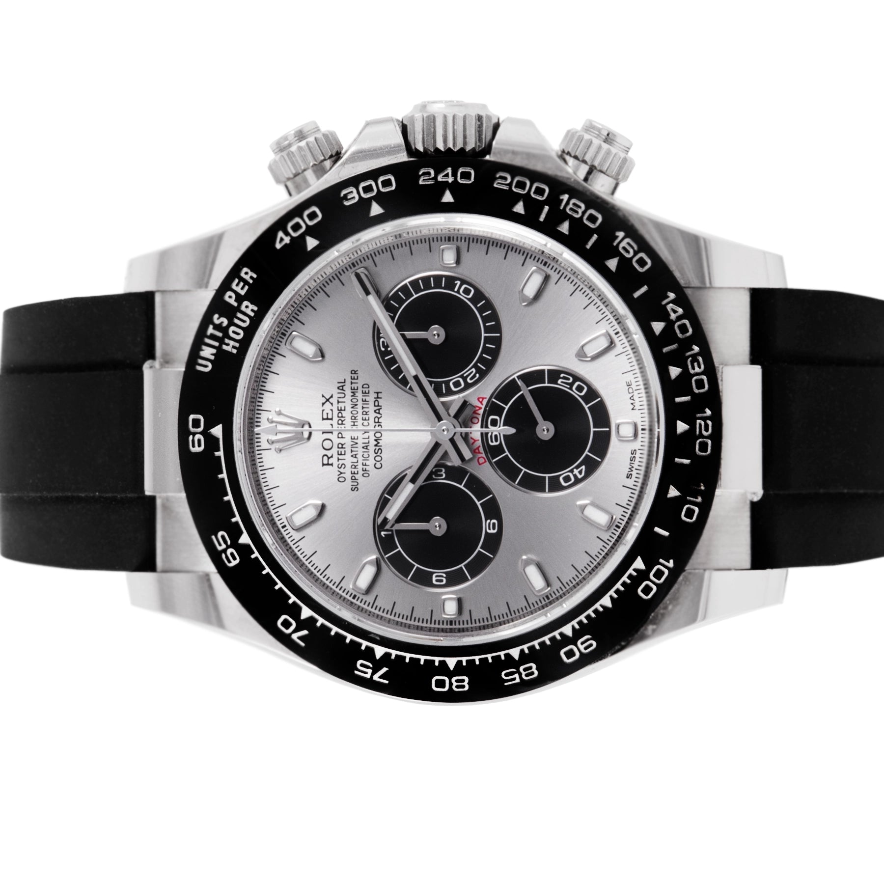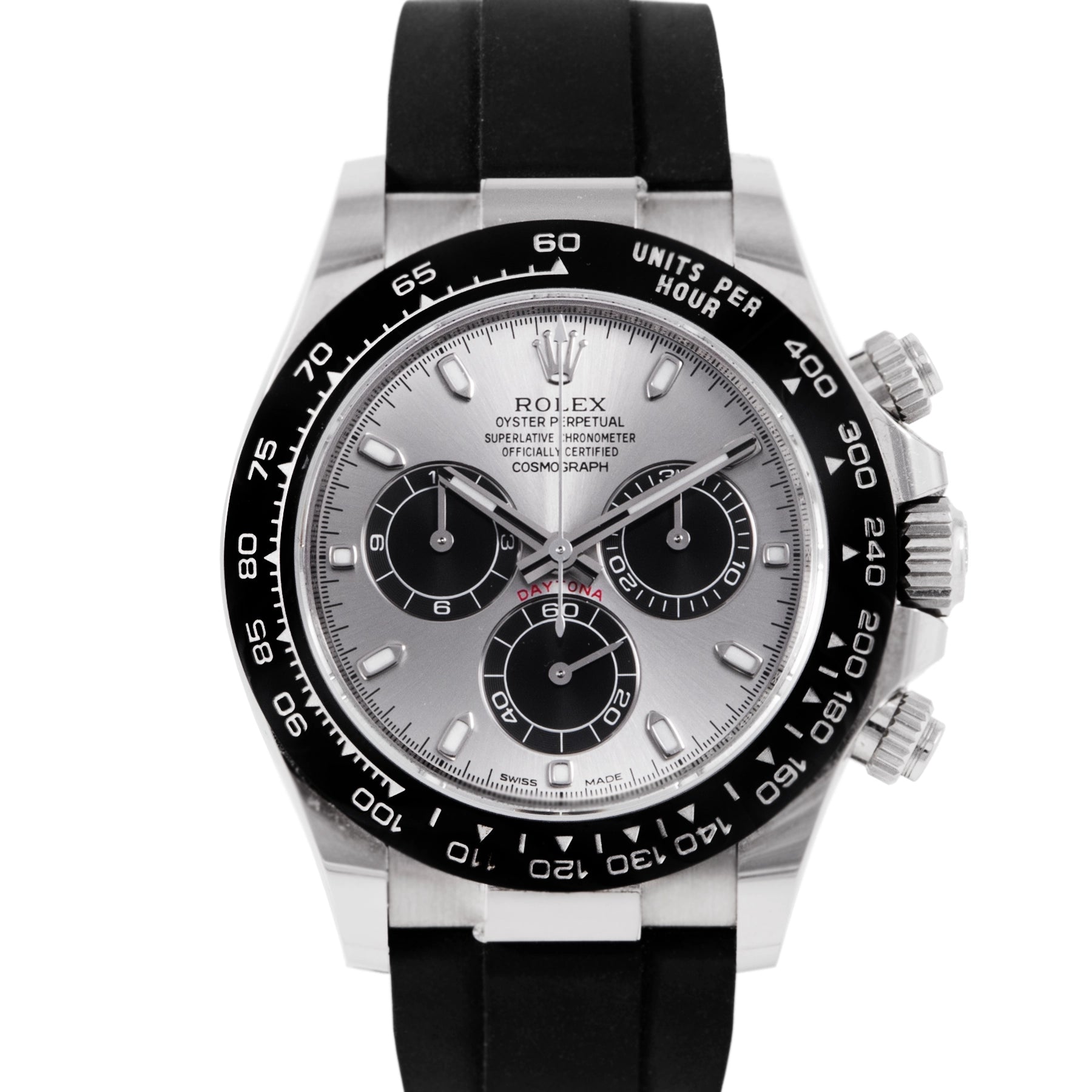 This Pre-owned Rolex Cosmograph Daytona 40mm, white gold case, silver dial, ceramic bezel and black oysterflex strap is in excellent condition. Mechanised by Rolex calibre 4131 automatic movement. Includes box and Rolex sales warranty card dated December 2022.