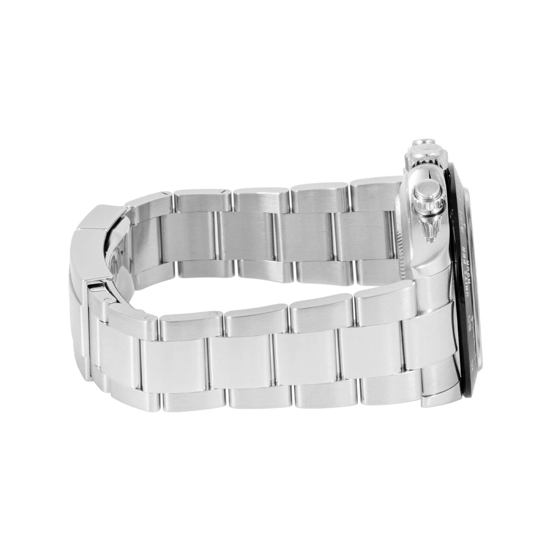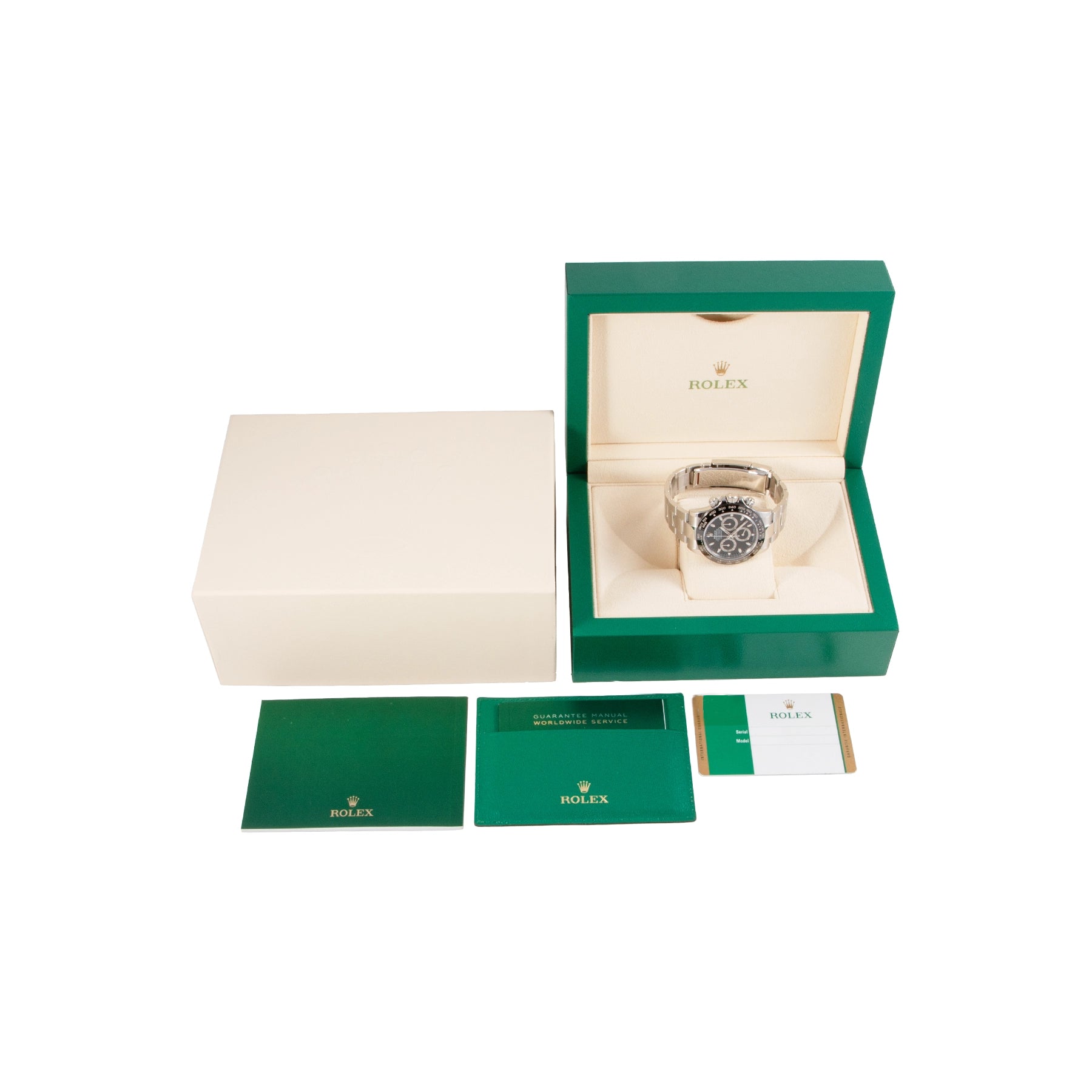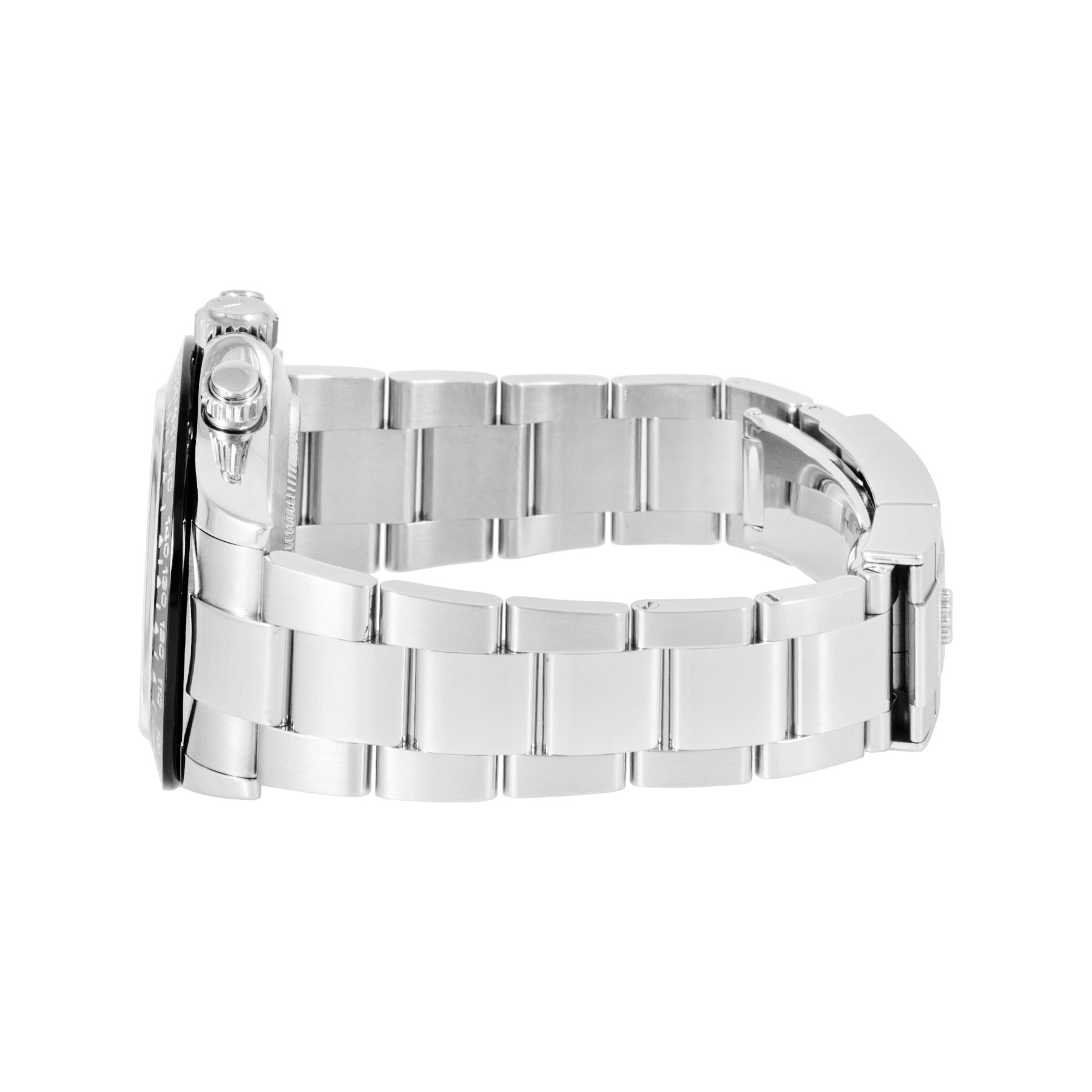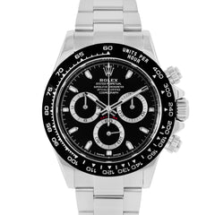 This Pre-owned Rolex Cosmograph Daytona 40mm, steel case, black dial, ceramic bezel and steel joyster bracelet with 11 links is in excellent condition. Mechanised by Rolex calibre 4130 automatic movement. Includes box, sales warranty card dated March 2020, and 2 years Timepiece360 warranty.