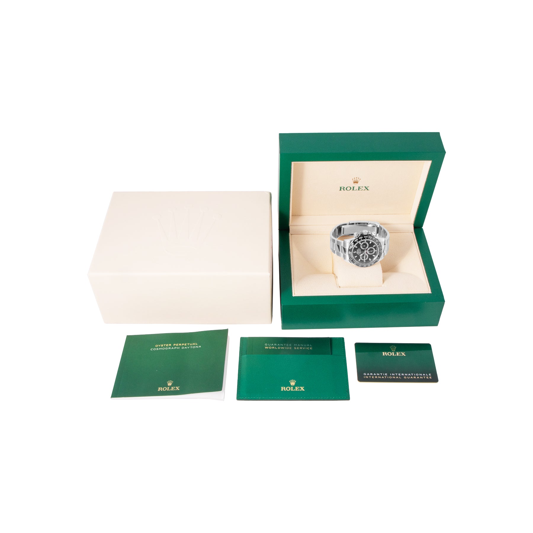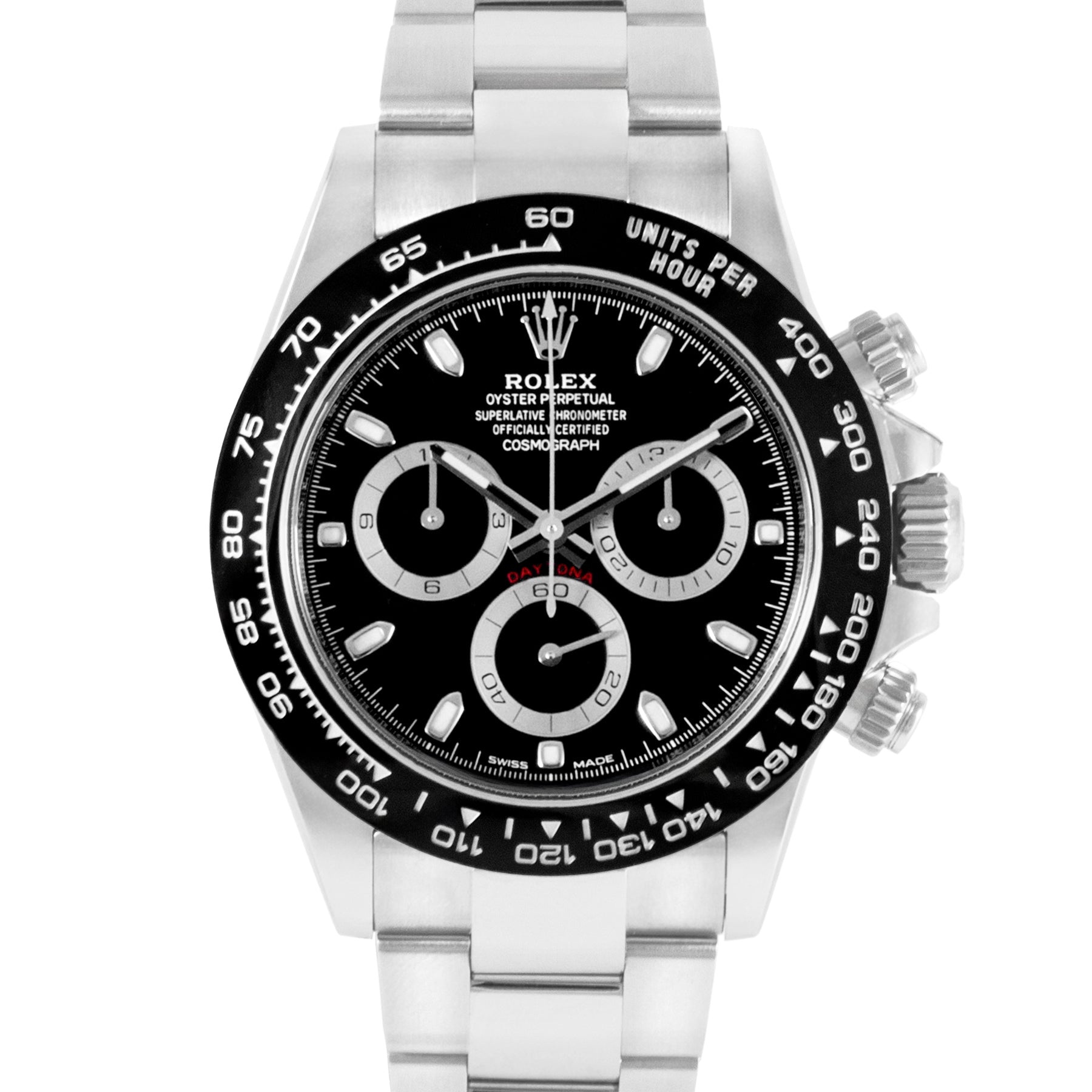 This Rolex Cosmograph Daytona 40mm, steel case, black dial, ceramic bezel and steel oyster bracelet with 12 links in unworn condition. Mechanised by Rolex Caliber 4130 automatic movement. Includes box, Rolex sales warranty card dated April 2018 and 2 years Timepiece360 warranty.