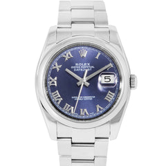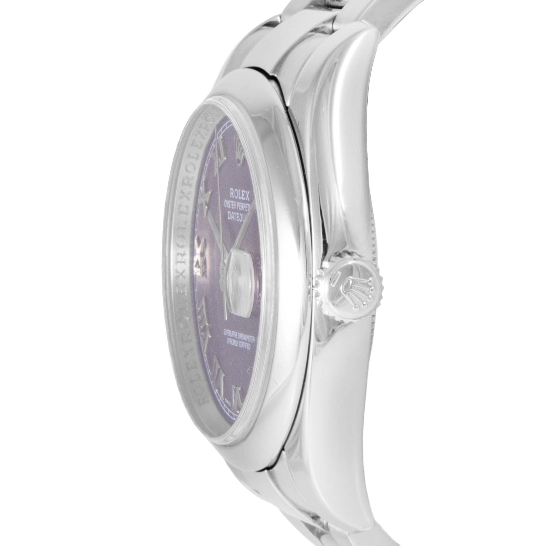 This Pre-owned Rolex Datejust 36mm, steel case, re-painted purple dial, steel bezel and steel oyster bracelet with 11 links is in excellent condition. Mechanised by Rolex caliber 3135 automatic movement. The year of production is 2007 as determined by the serial number starting with "Z". Includes box and 2 years Timepiece360 warranty.