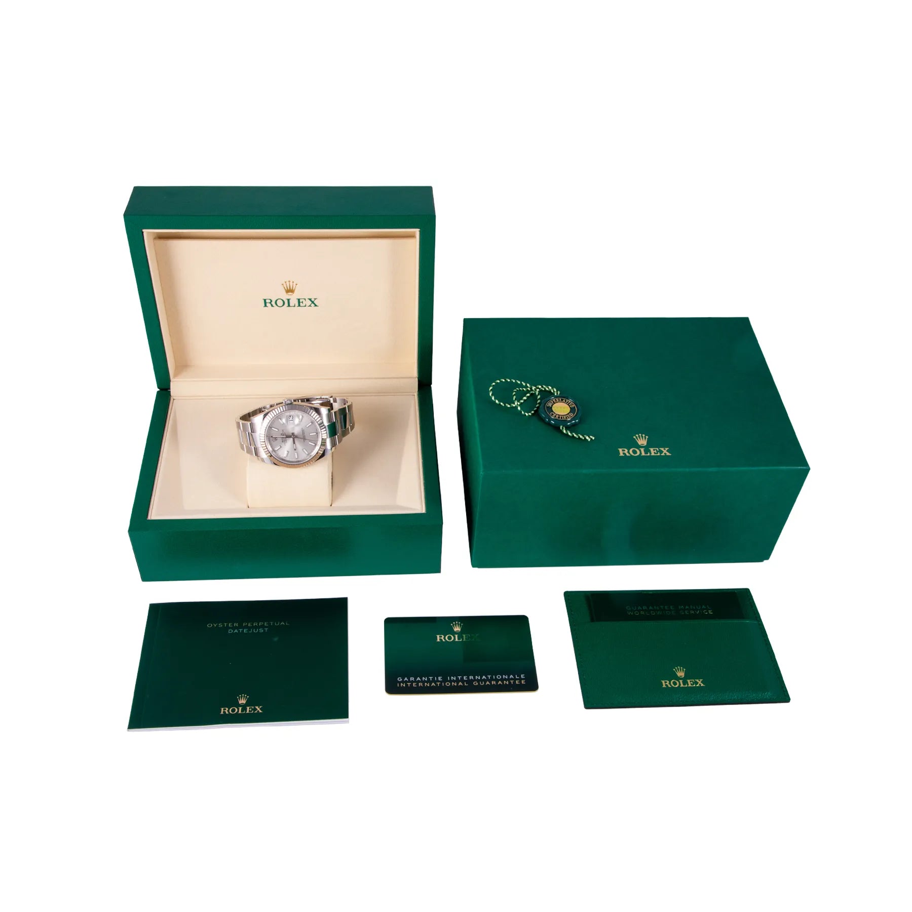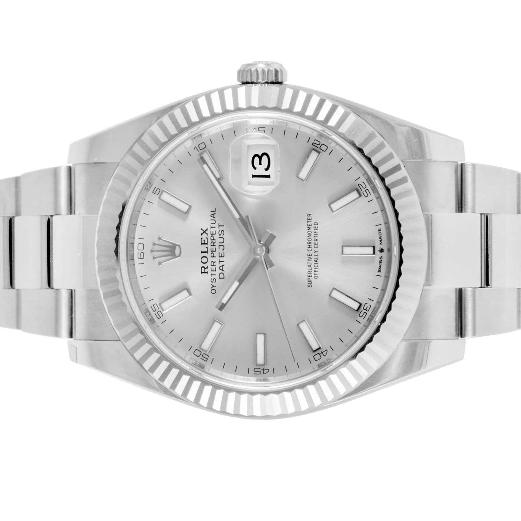 This Rolex Datejust 41mm steel case, white dial, fluted white gold bezel and steel oyster bracelet with 12 links in an unworn condition. Mechanised by Rolex calibre 3235 automatic movement. Includes box and sales warranty card dated January 2025.