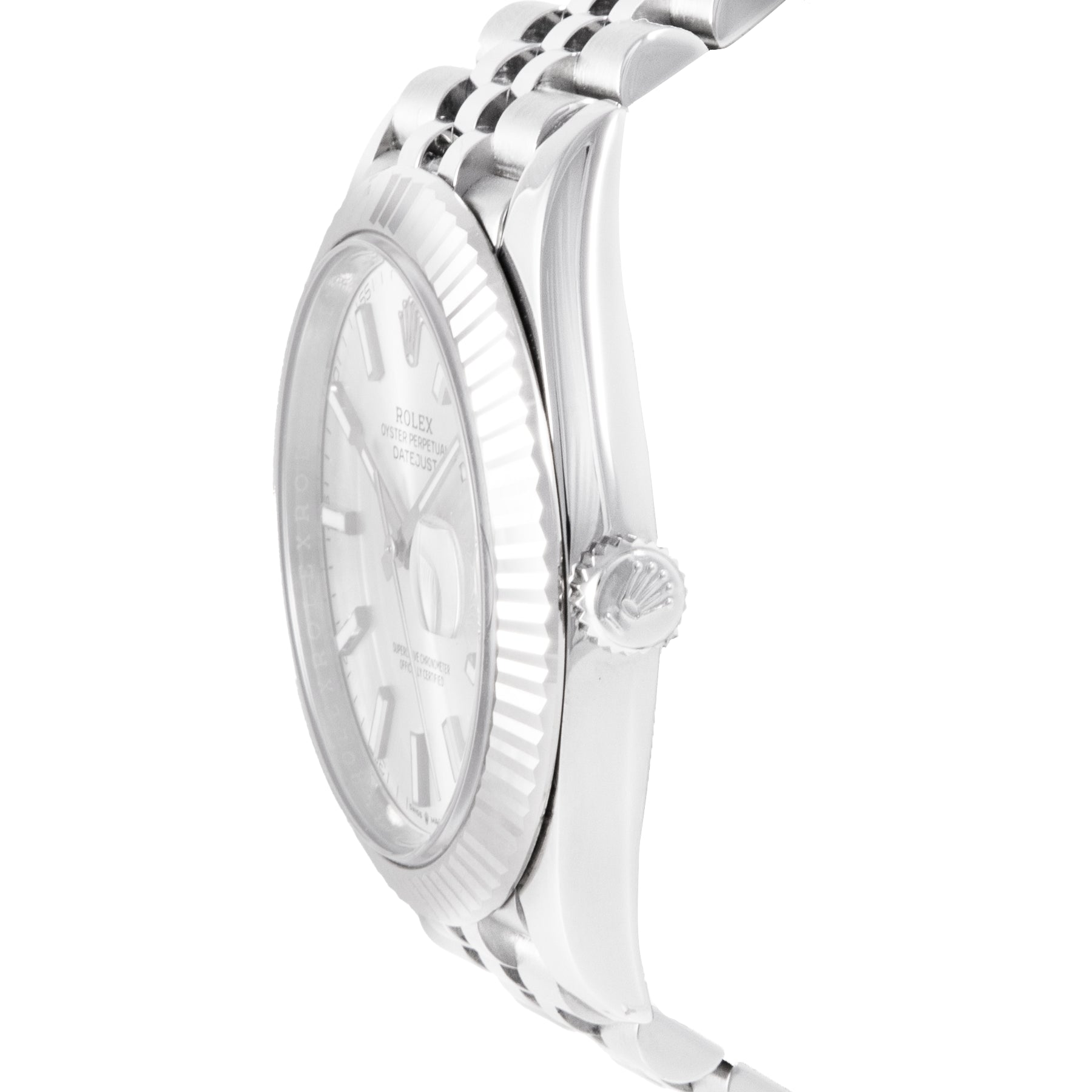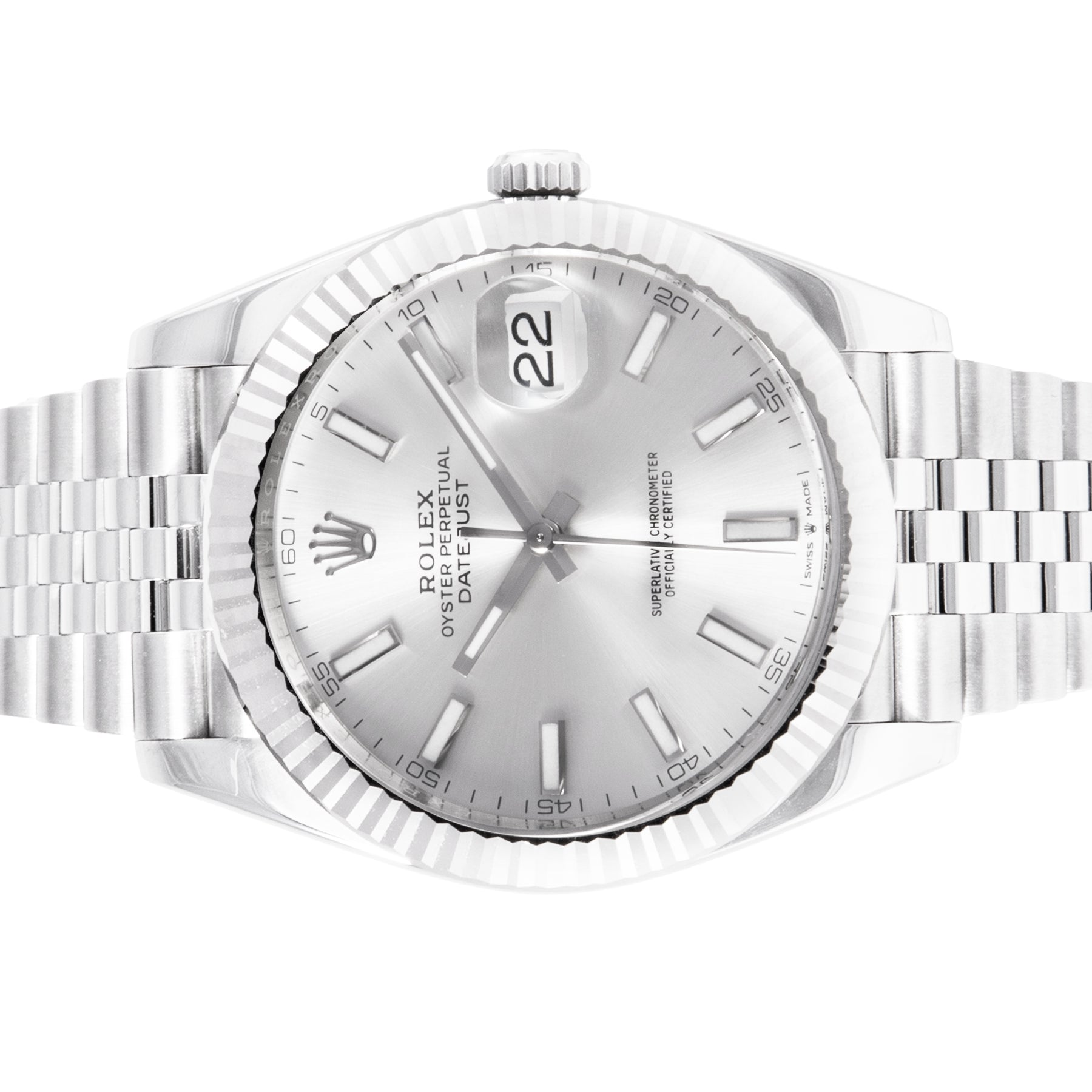 This Pre-owned Rolex Datejust 41mm steel case, silver dial, white gold bezel and steel jubilee bracelet with 19 links is in very good condition. Mechanised by Rolex calibre 3235 automatic movement. Includes box, Rolex sales warranty card dated March 2020 and 2 years Timepiece360 warranty.