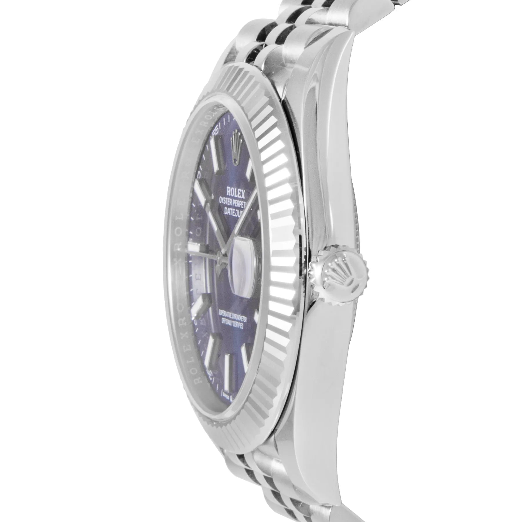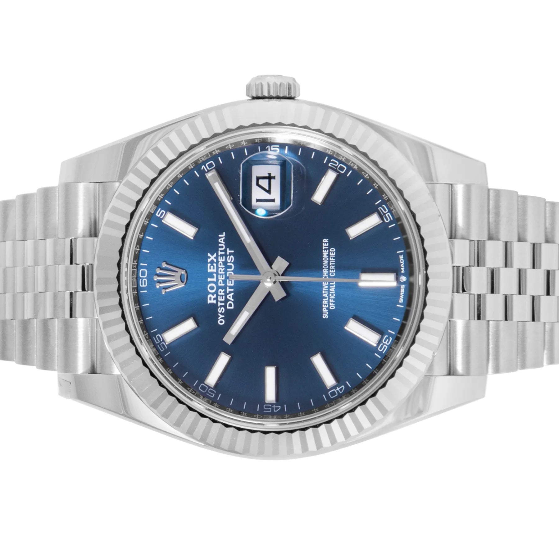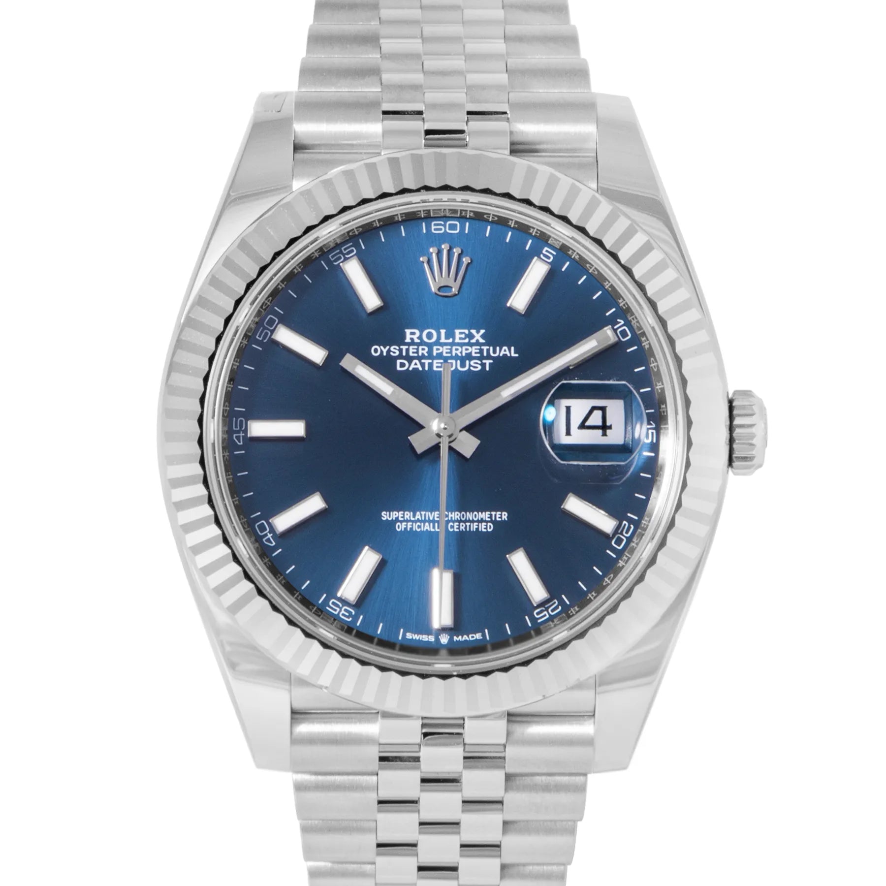 This Rolex Datejust 41mm, steel case, blue dial, white gold bezel and steel jubilee bracelet with 20 links in unworn condition. Mechanised by Rolex calibre 3235 automatic movement. Includes box and Rolex sales warranty card dated February 2026.