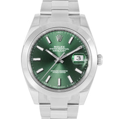 This Rolex Datejust 41mm, steel case, green dial, steel bezel and steel oyster bracelet with 12 links is in excellent condition. Mechanised by Rolex calibre 3235 automatic movement. Includes box and sales warranty card dated November 2025.