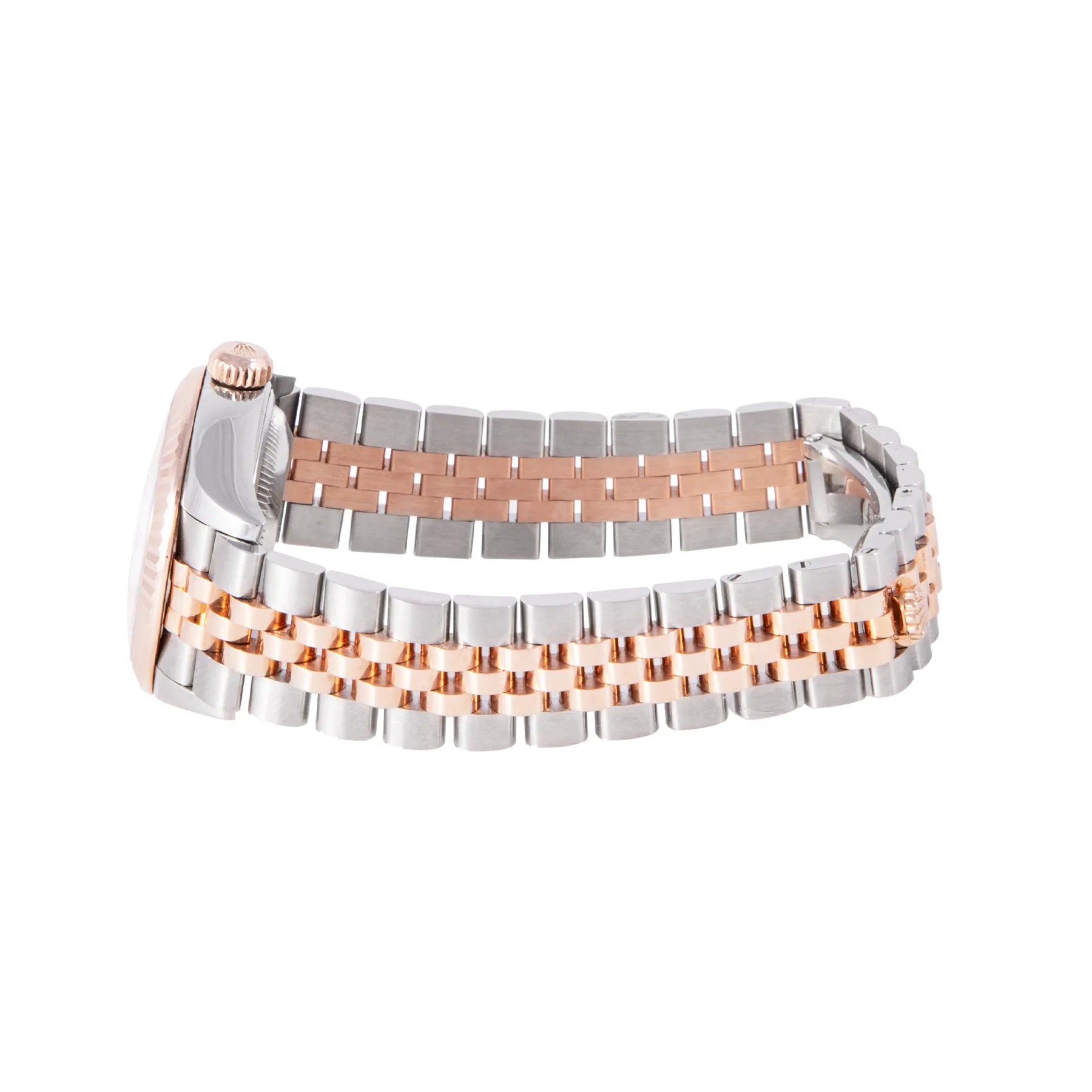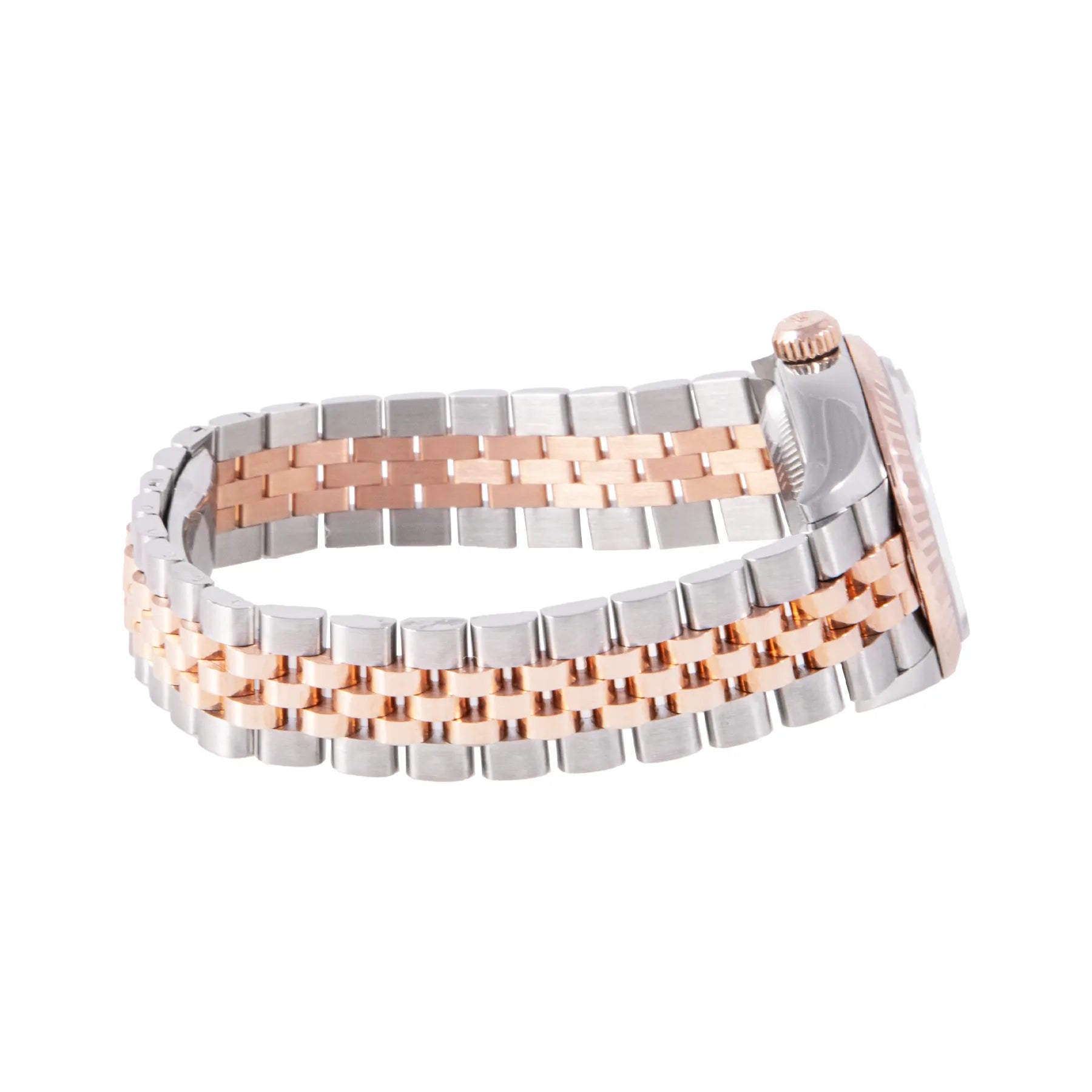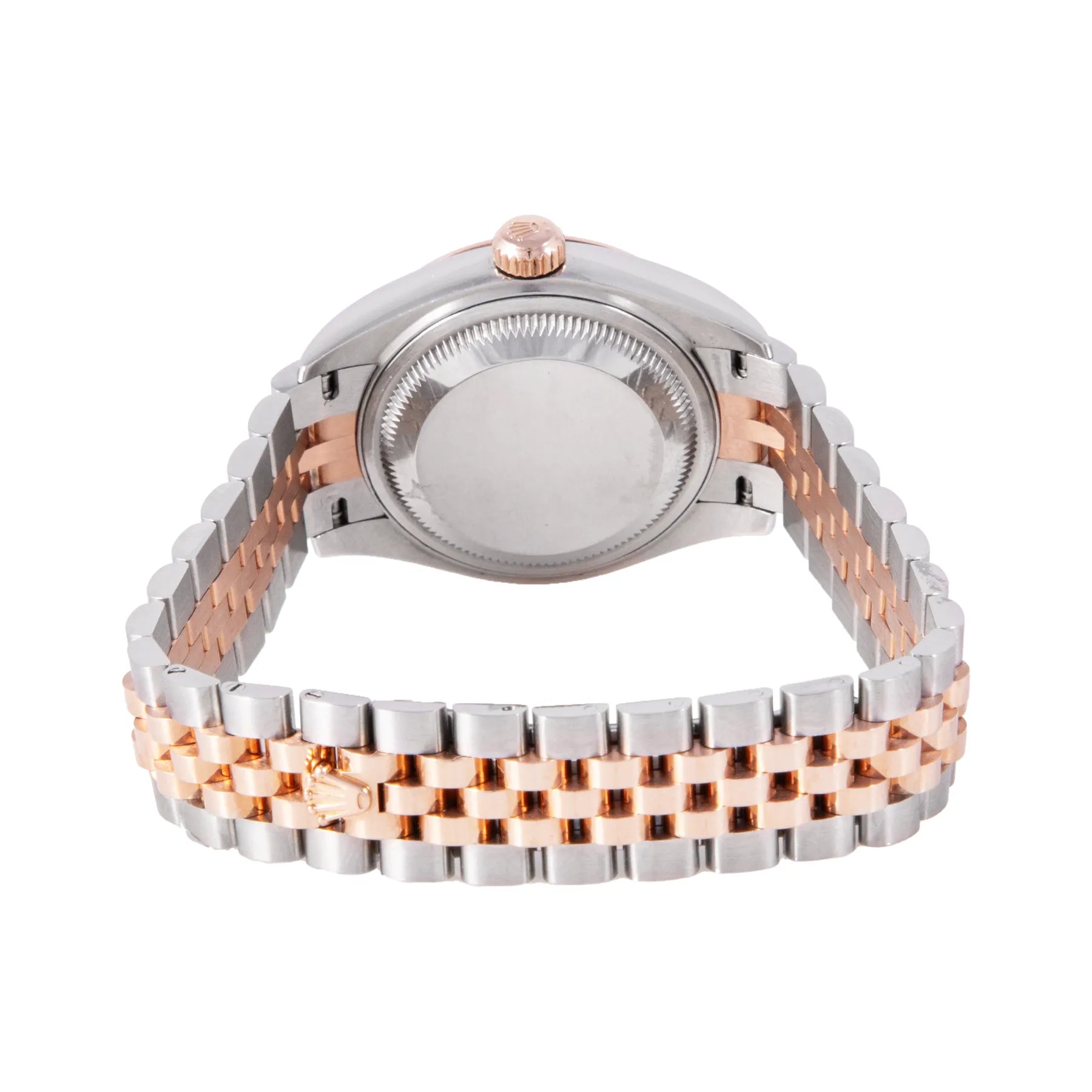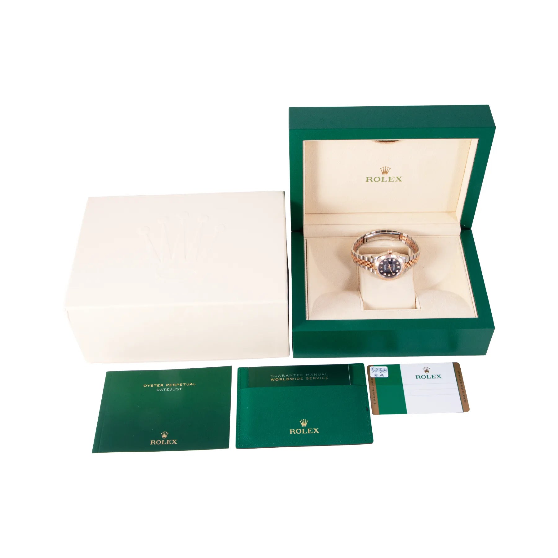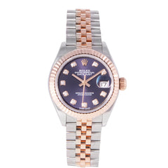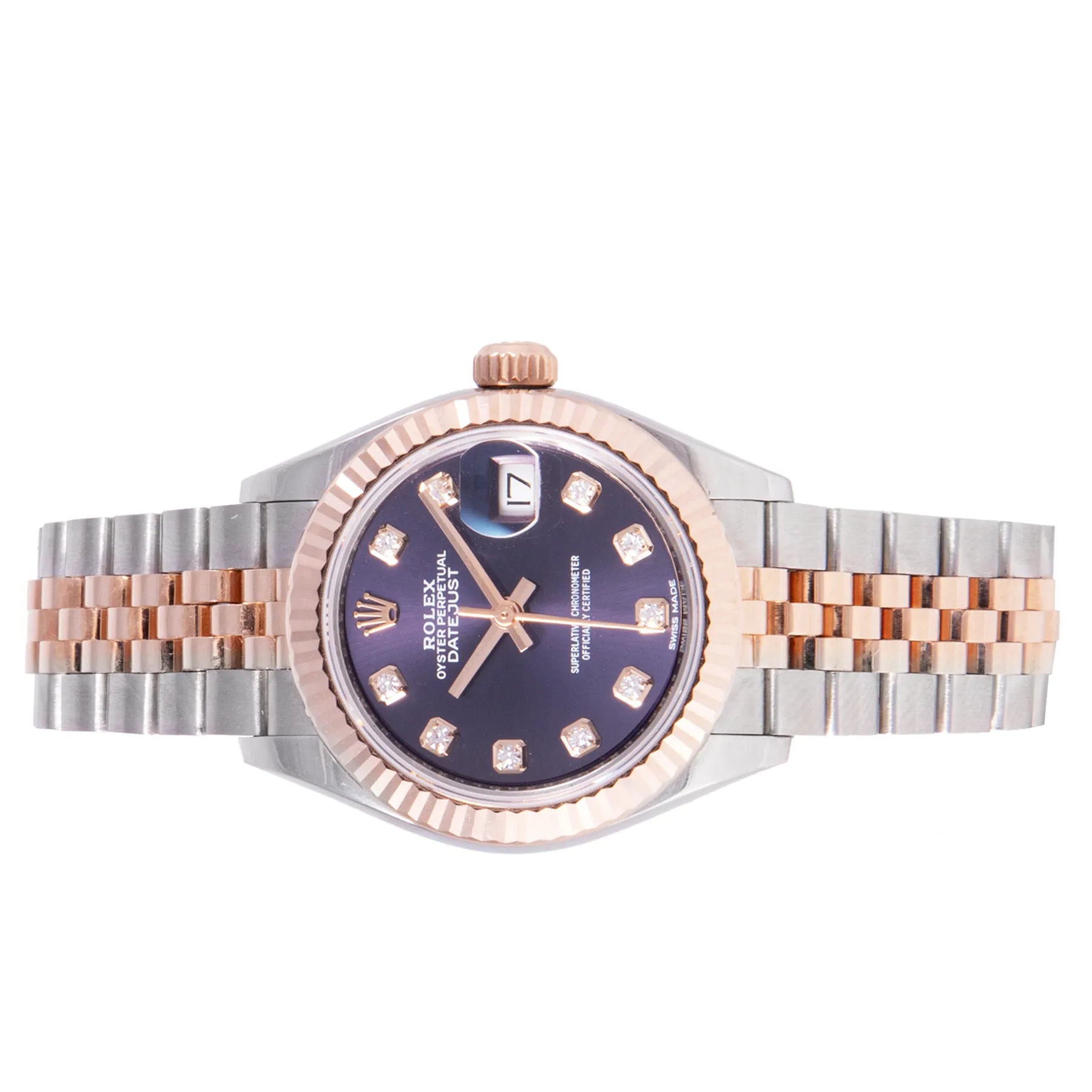 This Pre-owned Rolex Lady-Datejust 28mm steel & rose gold case, purple diamond dial, rose gold bezel and steel & rose gold jubilee bracelet with 22 links is in very good condition. Mechanised by Rolex caliber 2236 automatic movement. Includes box, Rolex sales warranty card dated November 2017 and 2 years Timepiece360 warranty.