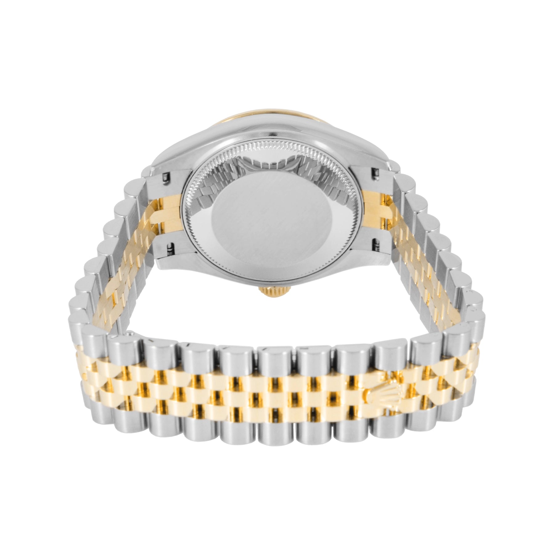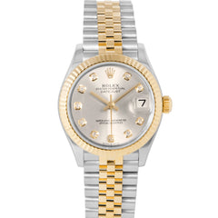 This Pre-owned Rolex Datejust 31mm, steel & yellow gold case, silver diamond dial, yellow gold bezel, and steel & yellow gold jubilee bracelet with 24 links is in excellent condition. Mechanised by Rolex calibre 2236 automatic movement. Includes box, Rolex sales warranty card dated October 2019, and 2 years Timepiece360 warranty.