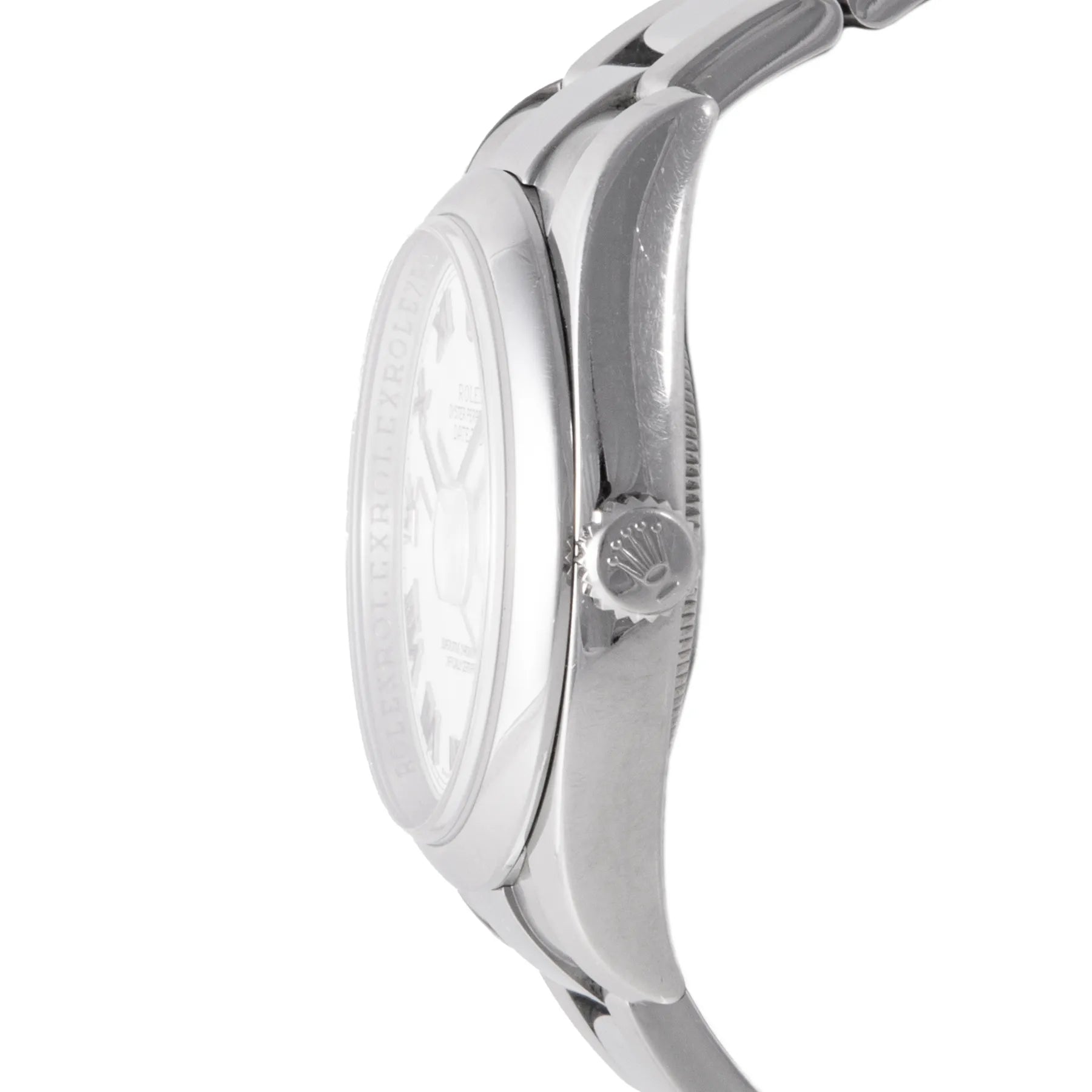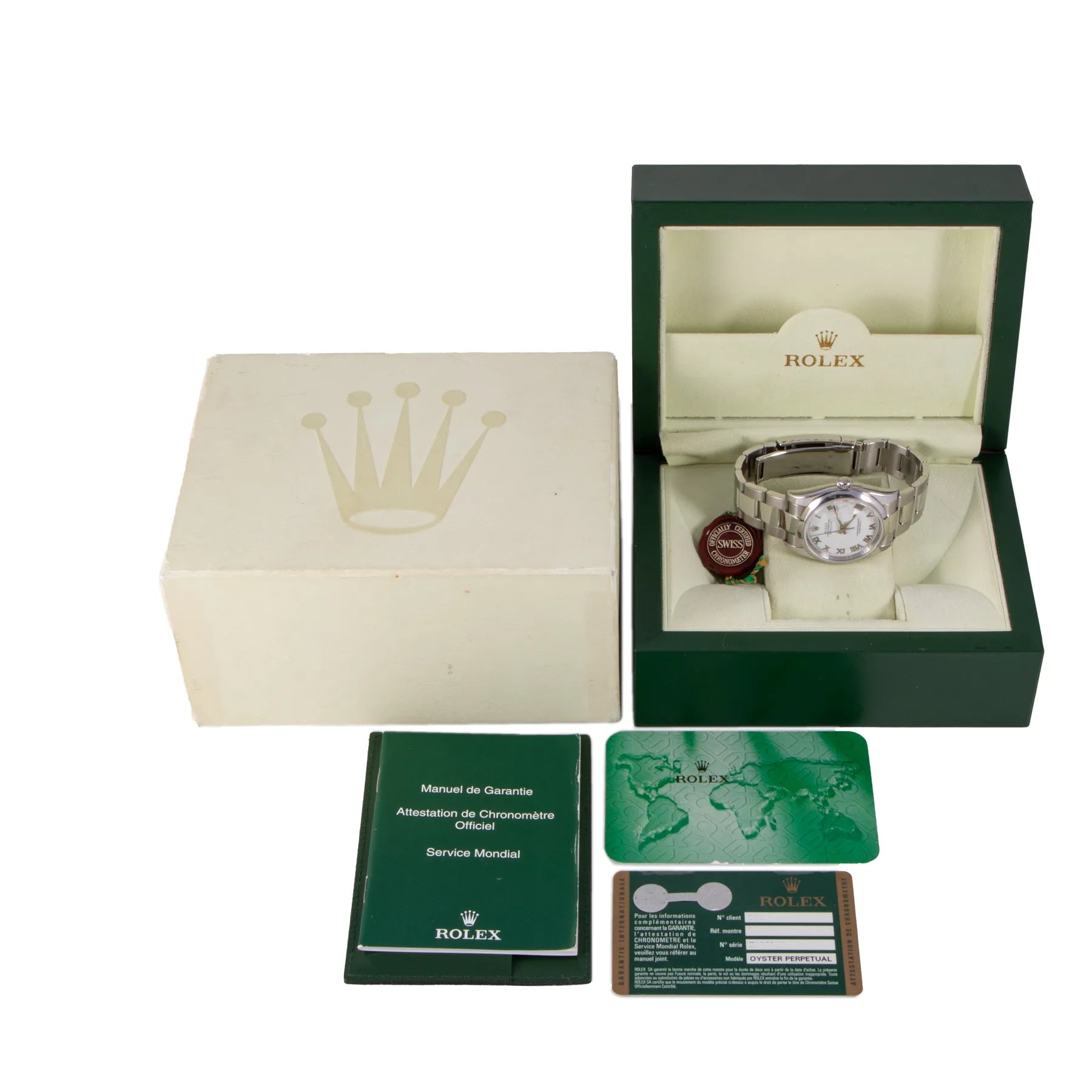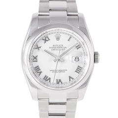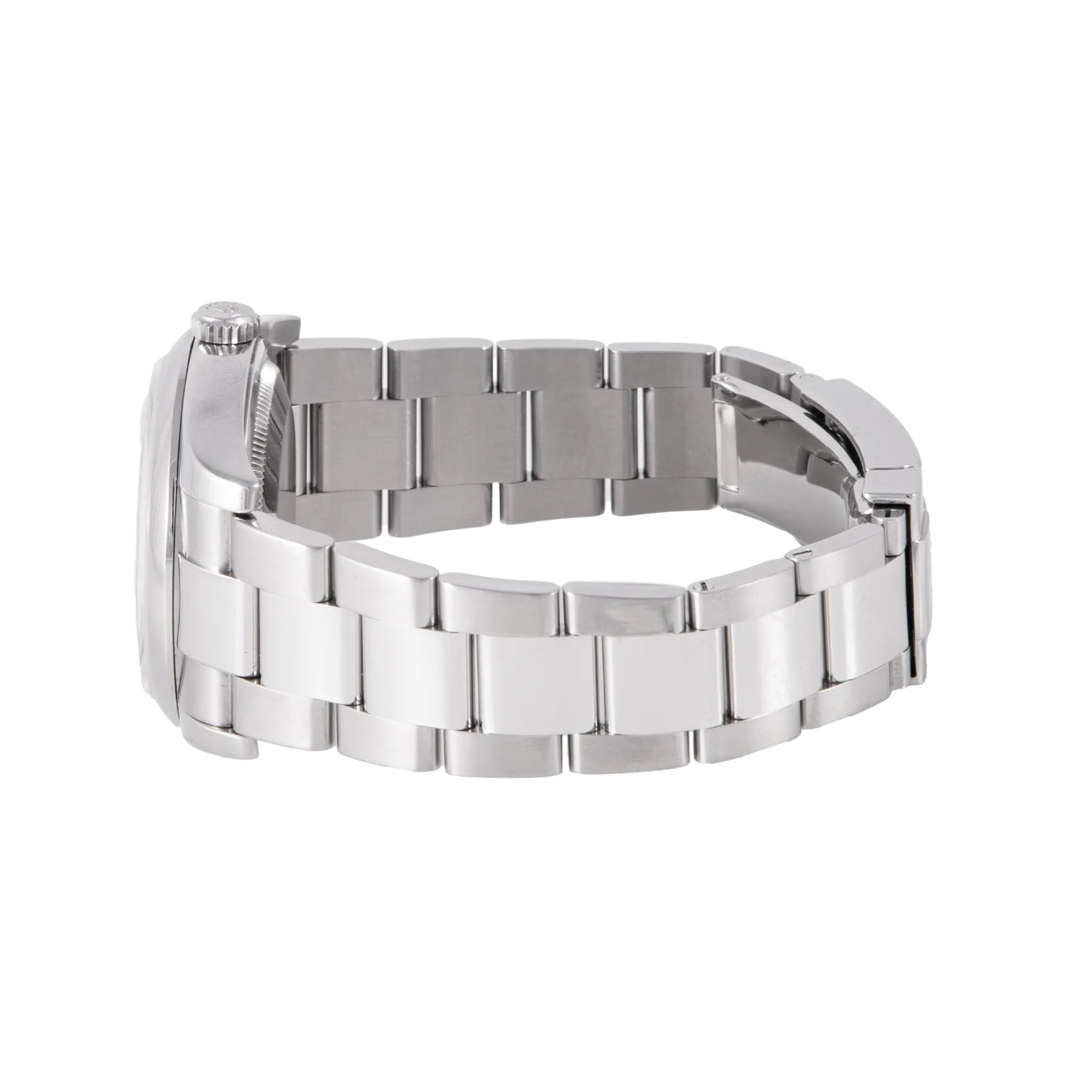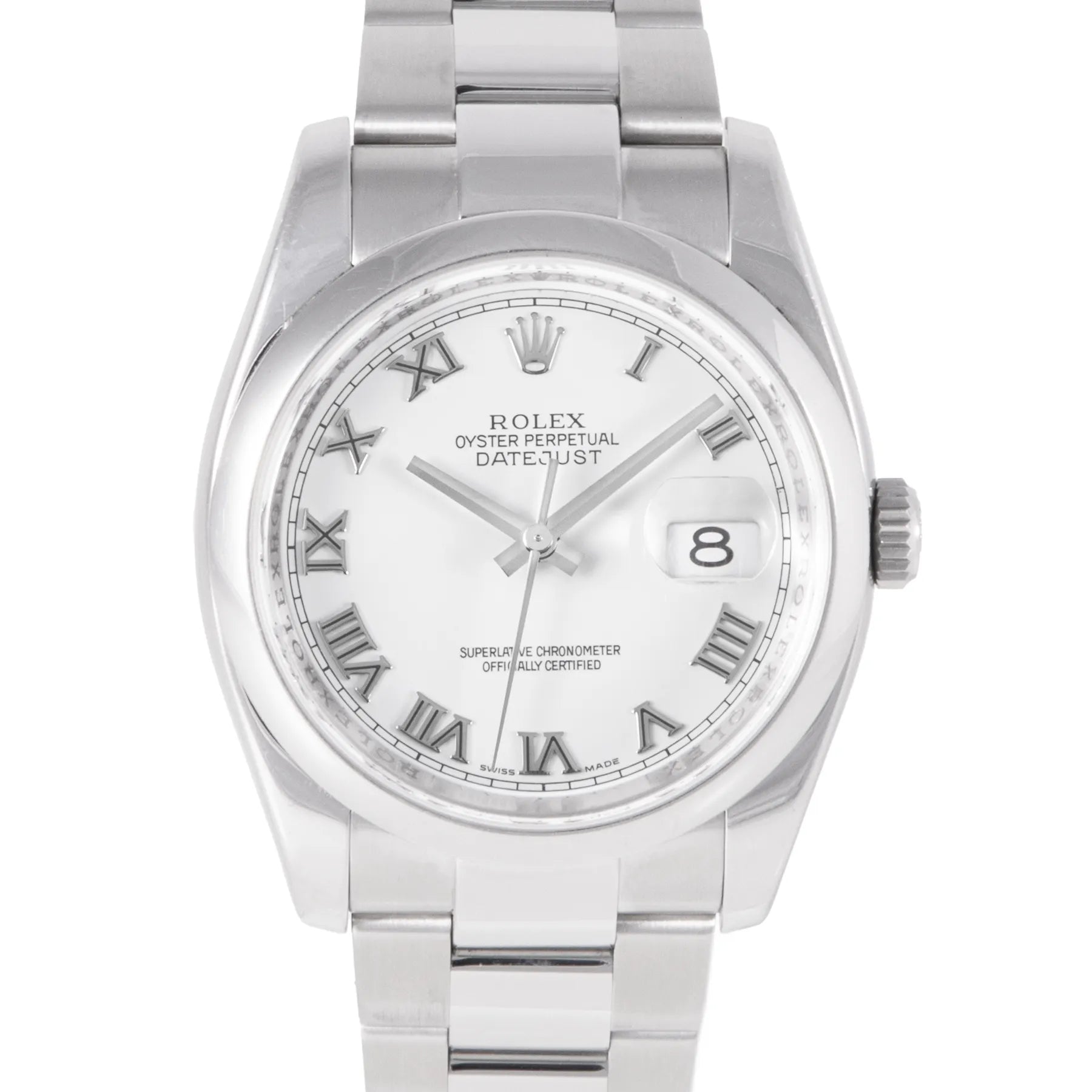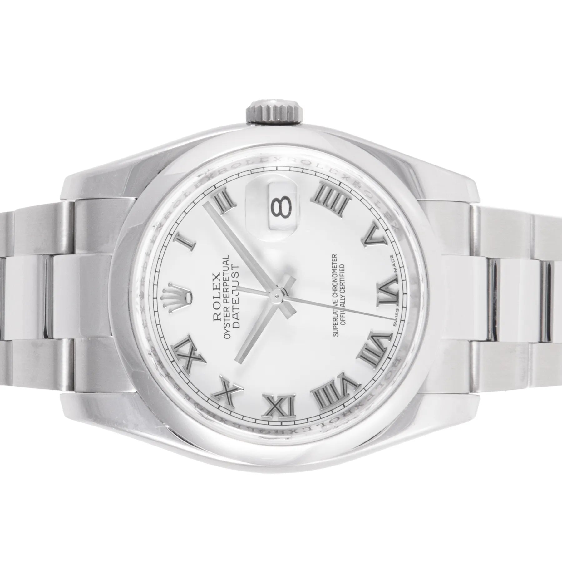 This Pre-owned Rolex Datejust 36mm, steel case, white dial, steel bezel and steel oyster bracelet with 11 links is in very good condition. Mechanised by Rolex calibre 3135 automatic movement. Includes box, sales warranty card dated August 2007, and 2 years Timepiece360 warranty.