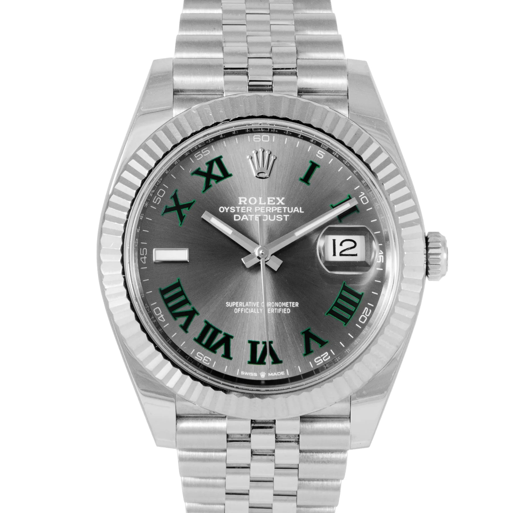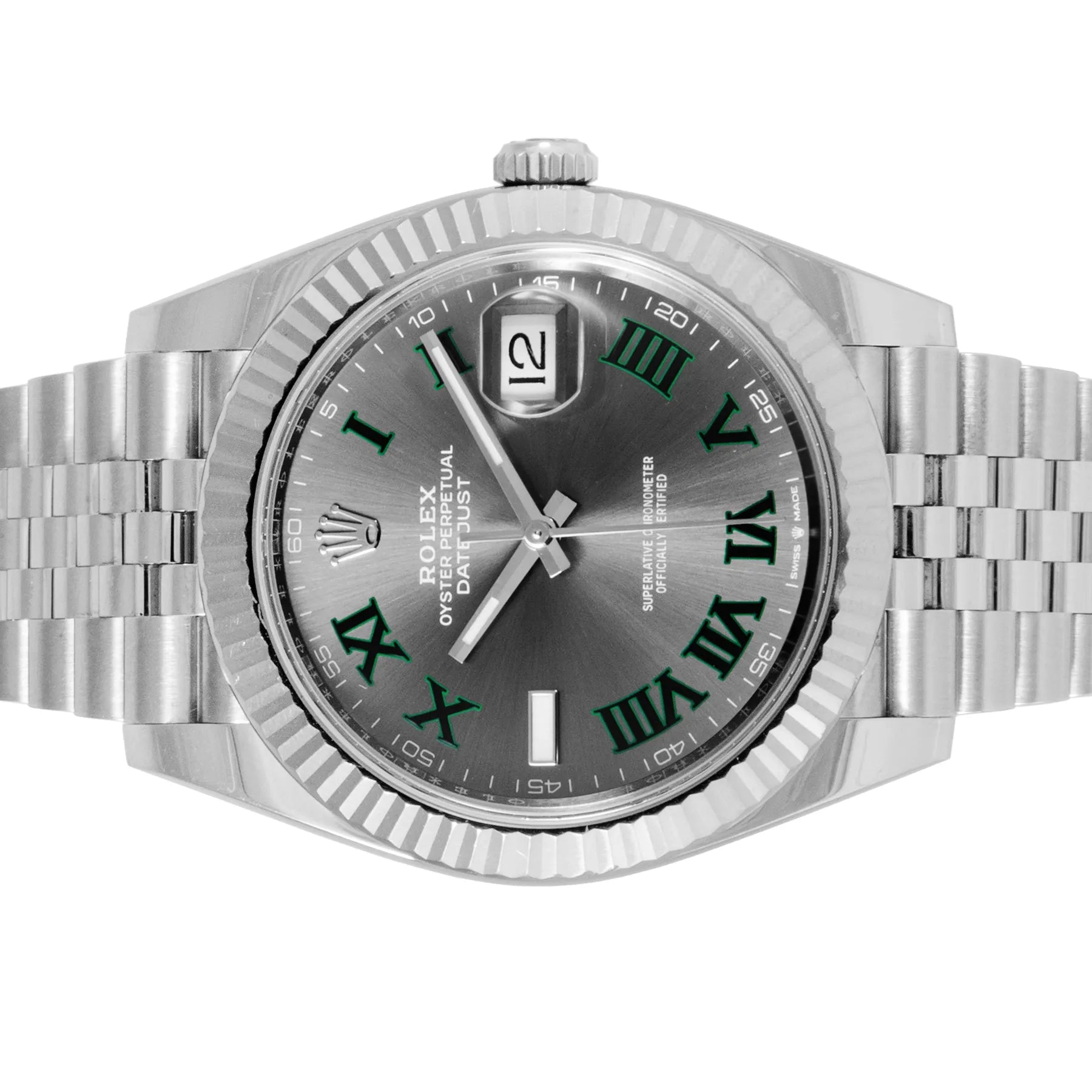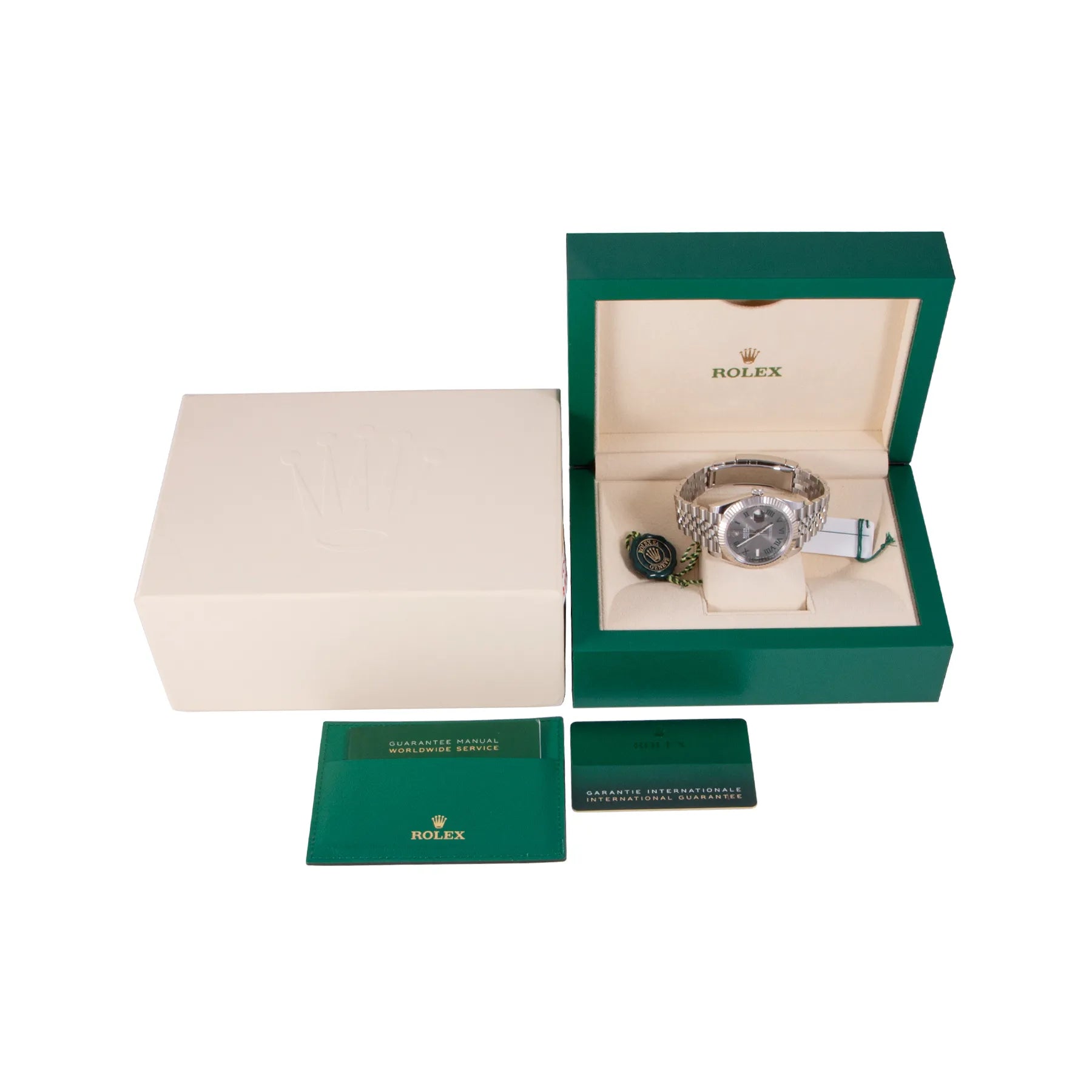 This Pre-owned Rolex Datejust "Wimbledon" 41mm, steel case, slate grey dial, white gold bezel and steel jubilee bracelet with 20 links is in very good condition. Mechanised by Rolex calibre 3235 automatic movement. Includes box and Rolex sales warranty card dated November 2023.