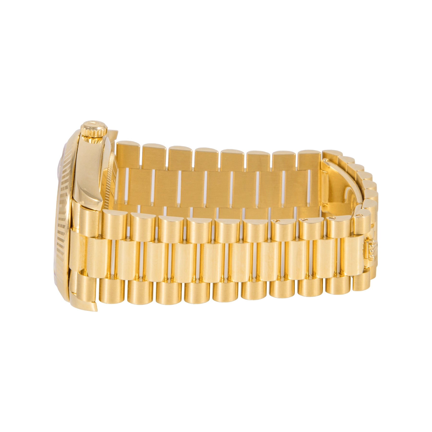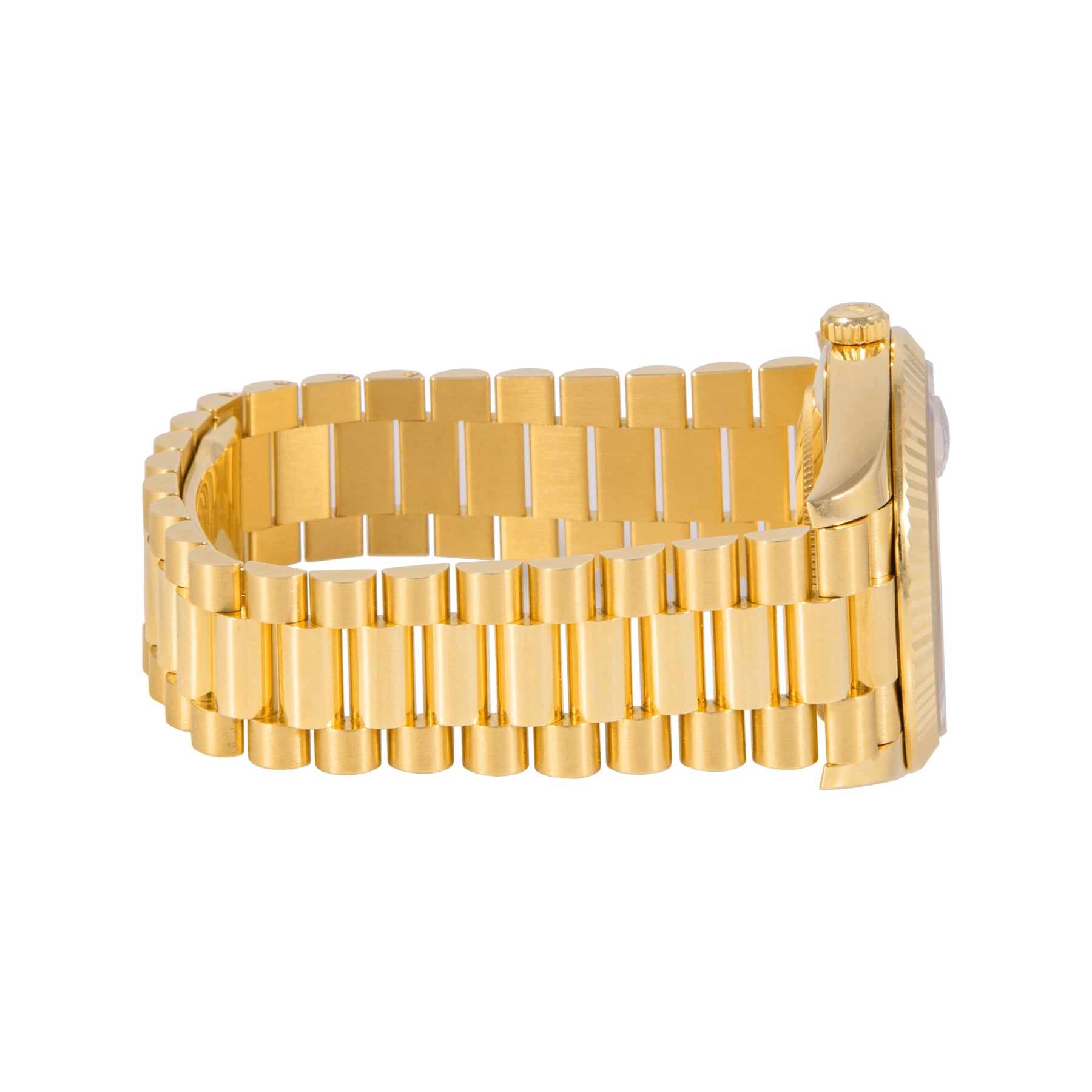 This Pre-owned Rolex Day-Date 40mm, yellow gold case, champagne dial, yellow gold bezel and yellow gold bracelet with 22 links is in very good condition. Mechanised by Rolex calibre 3255 automatic movement. Includes box, sales warranty card dated March 2020 and 2 years Timepiece360 warranty.