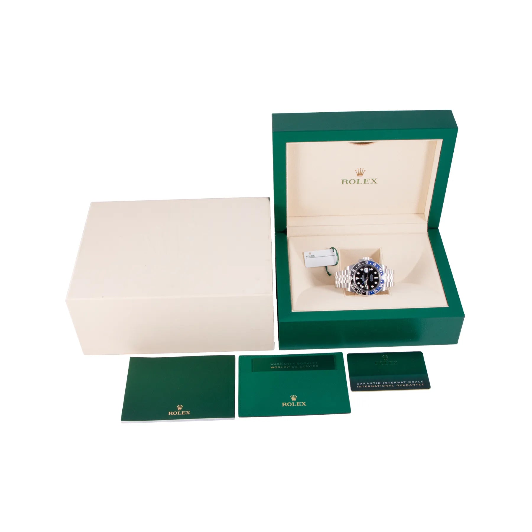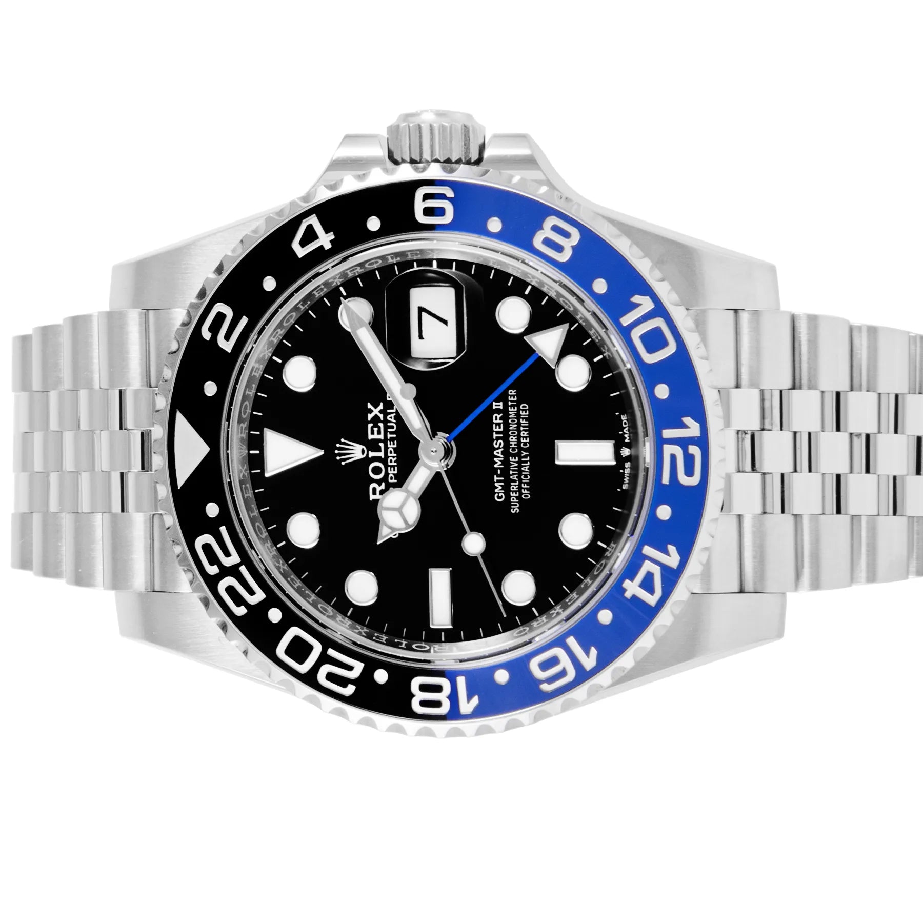 This Pre-owned Rolex GMT-Master II "Batgirl" 40mm, steel case, black dial, ceramic bezel and steel jubilee bracelet with 17 links is in excellent condition. Mechanised by Rolex calibre 3285 automatic movement. Includes box and Rolex sales warranty card dated January 2024.