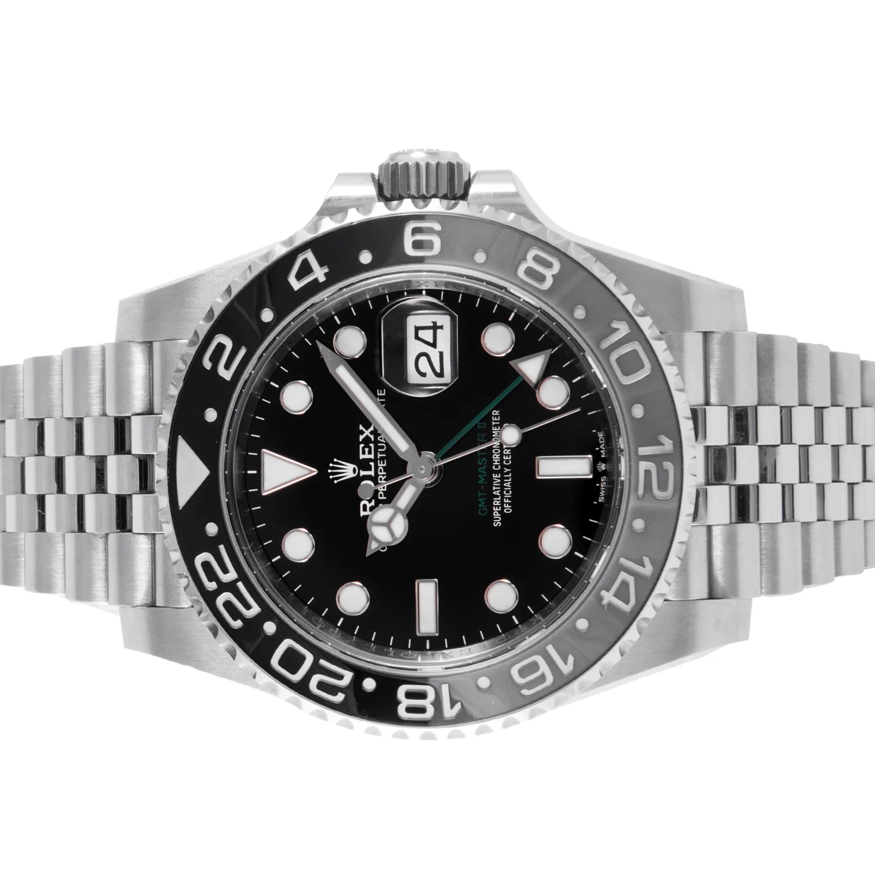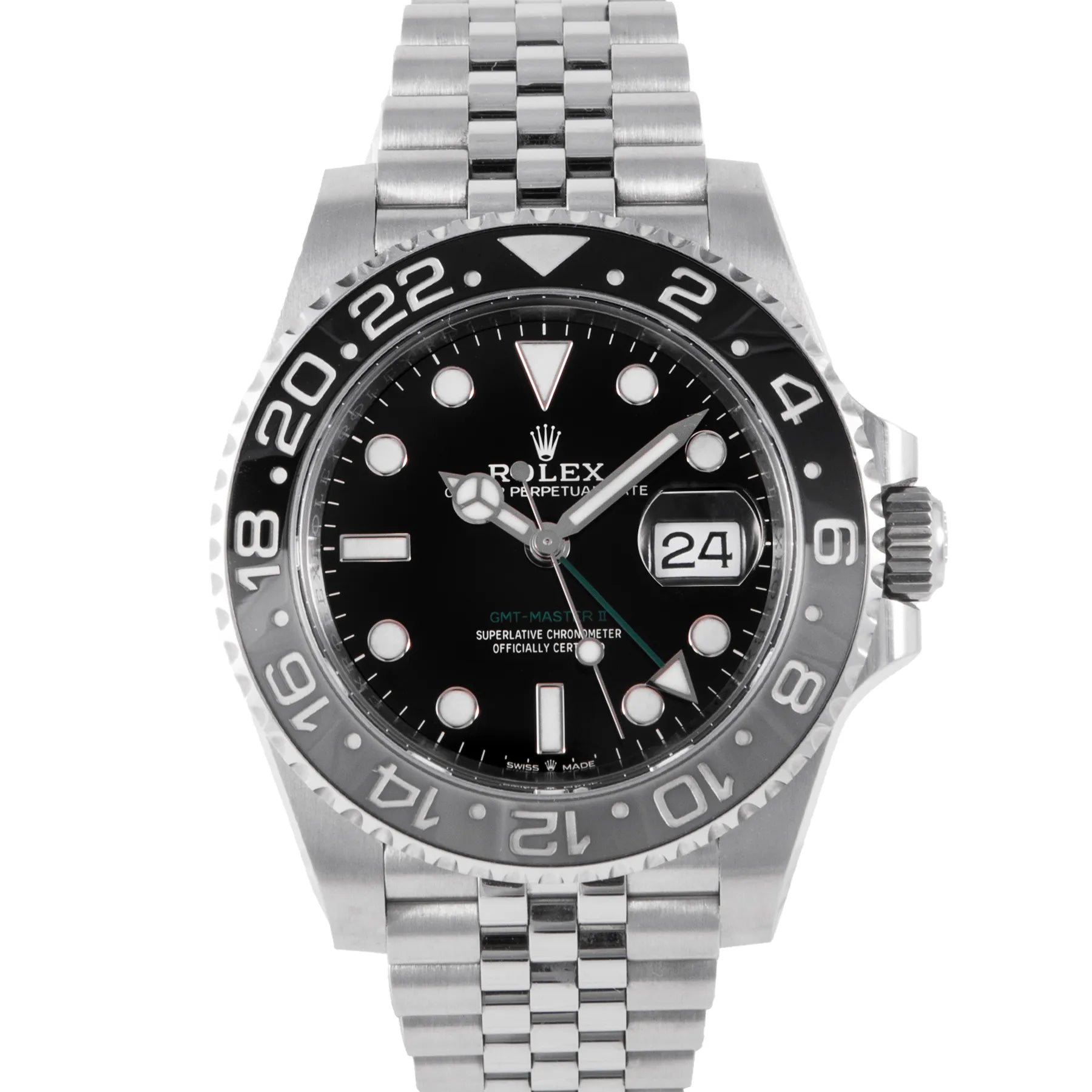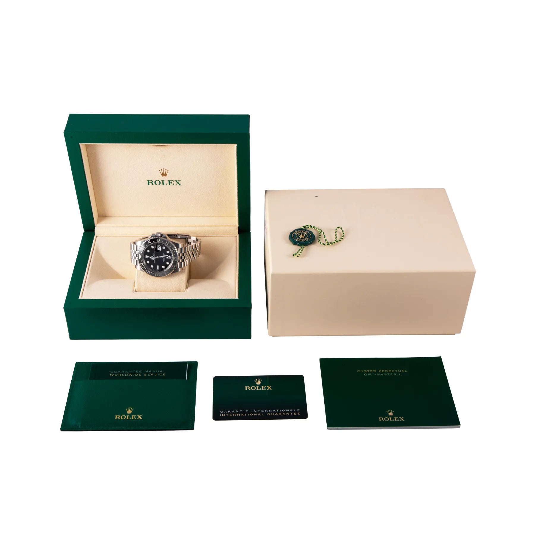 This Pre-owned Rolex GMT-Master II "Bruce Wayne" 40mm, steel case, black dial, ceramic bezel and steel jubilee bracelet with 17 links is in very good condition. Mechanised by Rolex calibre 3285 automatic movement. Includes box and Rolex sales warranty card dated August 2024.