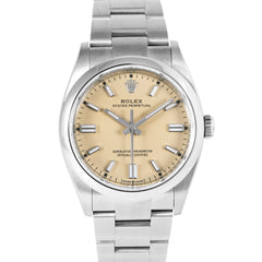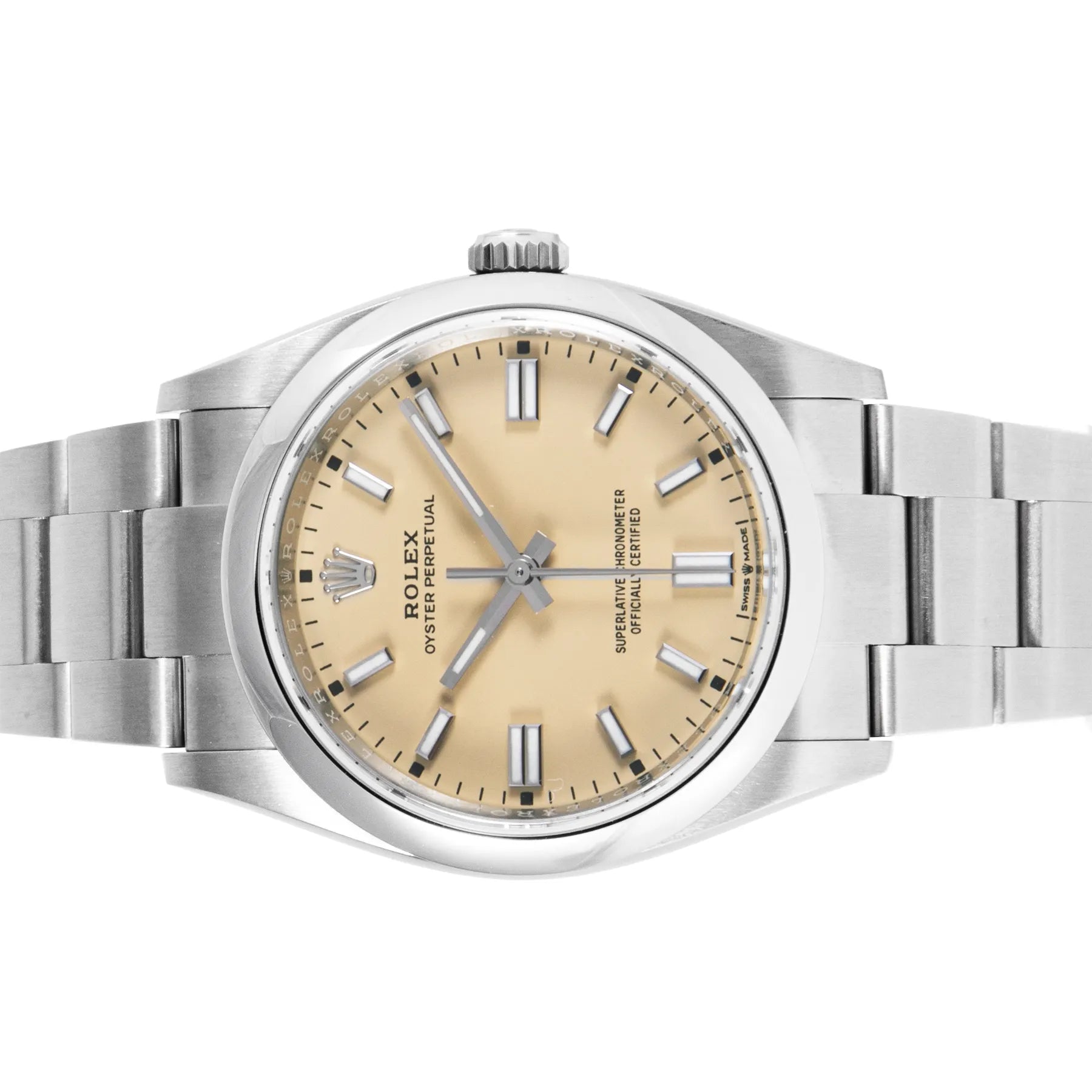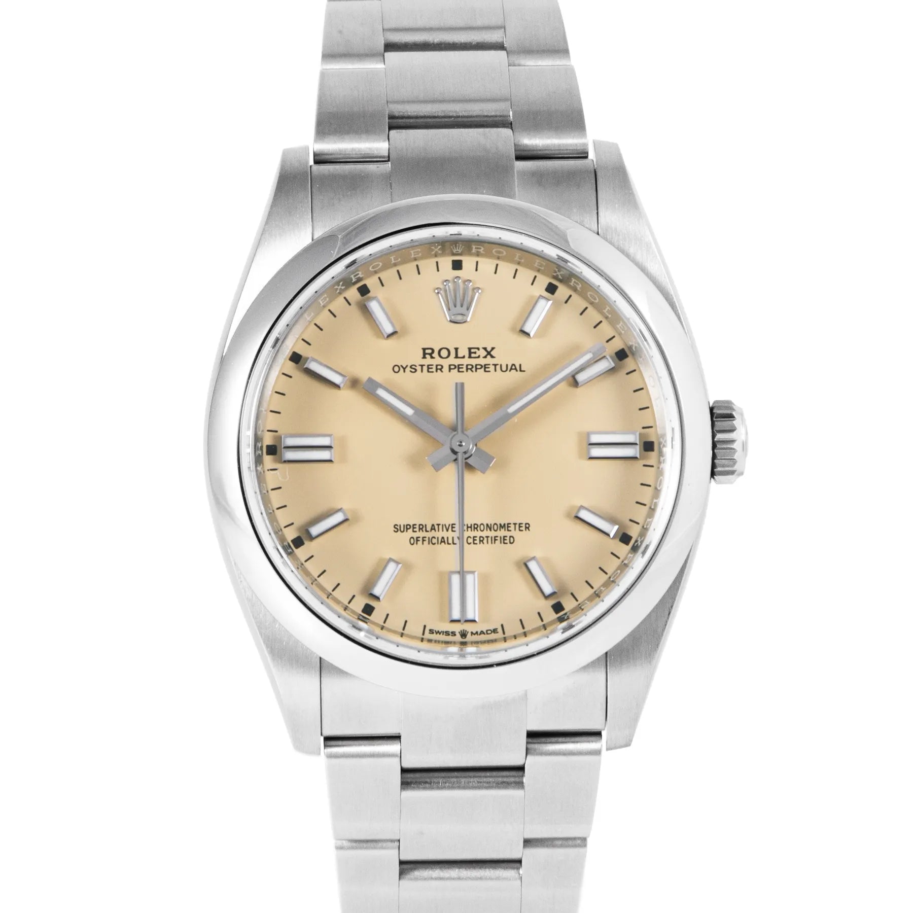 This Rolex Oyster Perpetual 36mm, steel case, beige dial, steel bezel and oyster steel bracelet with 12 links in an unworn condition. Mechanised by Rolex calibre 3230 automatic movement. Includes box and Rolex sales warranty card dated November 2025.