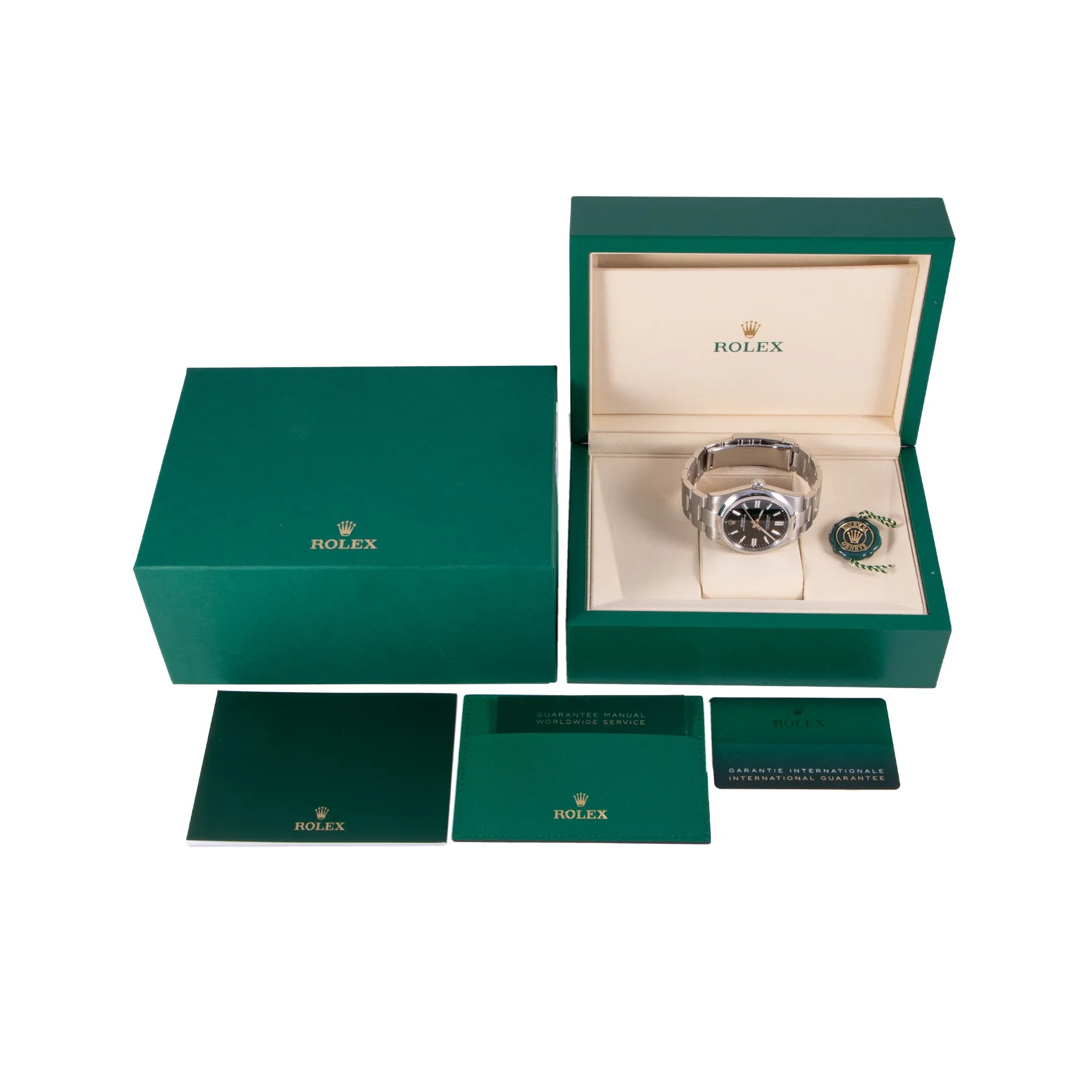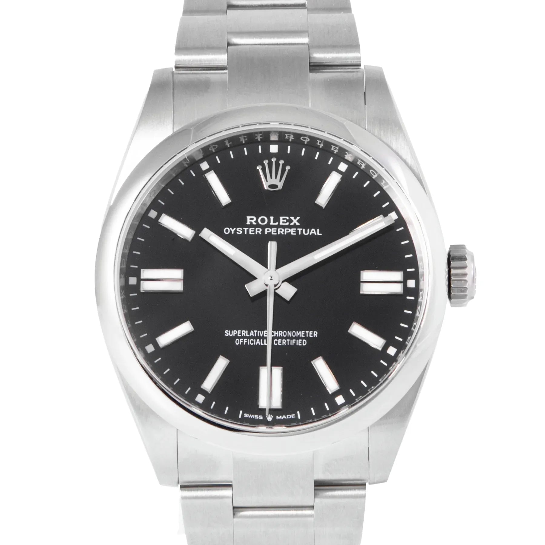 This Rolex Oyster Perpetual 41mm, steel case, black dial, steel bezel and steel oyster bracelet with 12 links in unworn condition. Mechanised by Rolex calibre 3230 automatic movement. Includes box and Rolex sales warranty card dated January 2026.