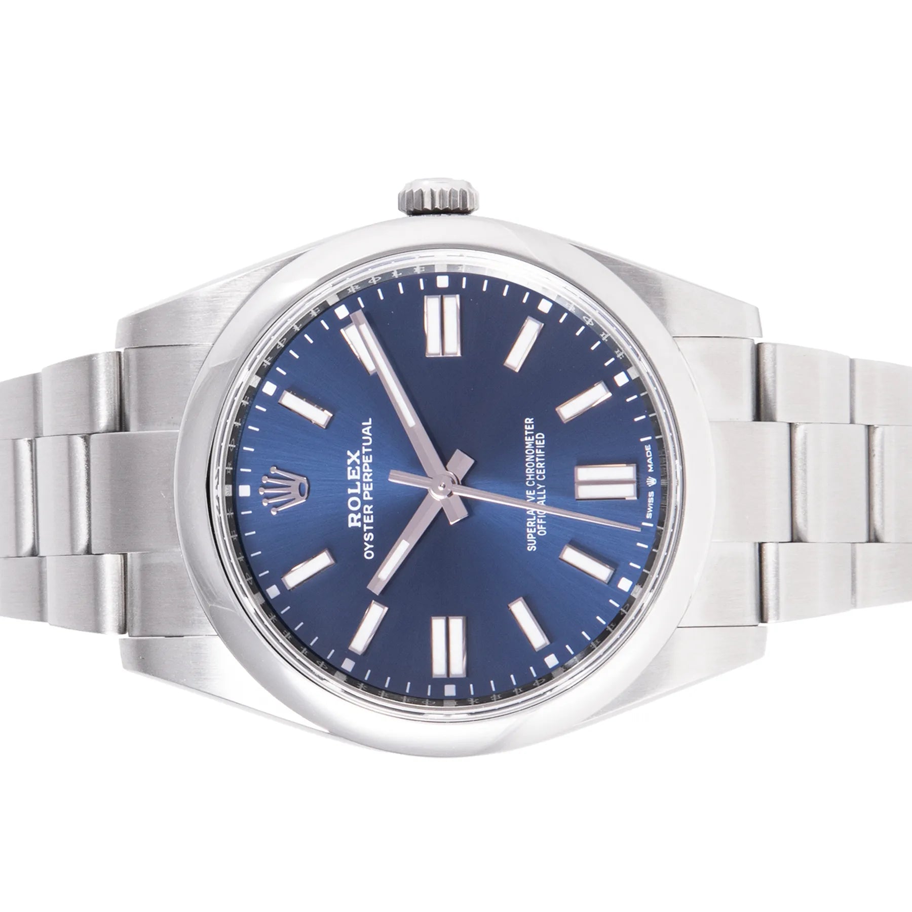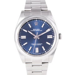 This Pre-owned Rolex Oyster Perpetual 41mm, steel case, blue dial, steel bezel and steel oyster bracelet with 12 links is in very good condition. Mechanised by Rolex calibre 3230 automatic movement. Includes box and Rolex sales warranty card dated September 2023.