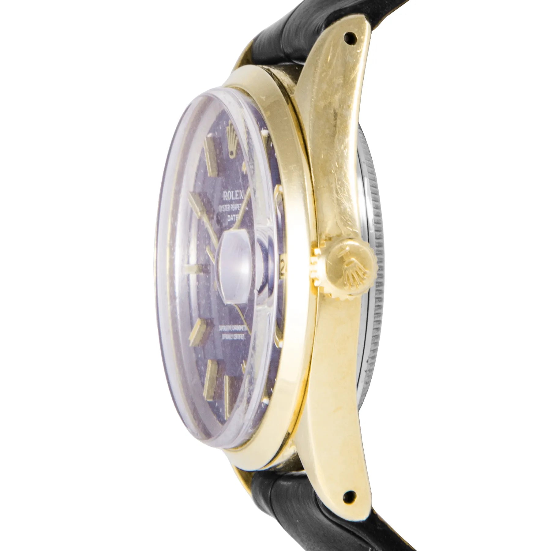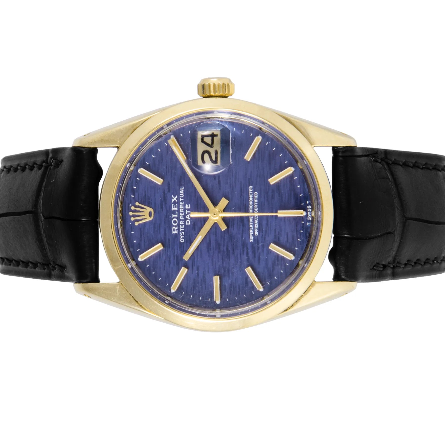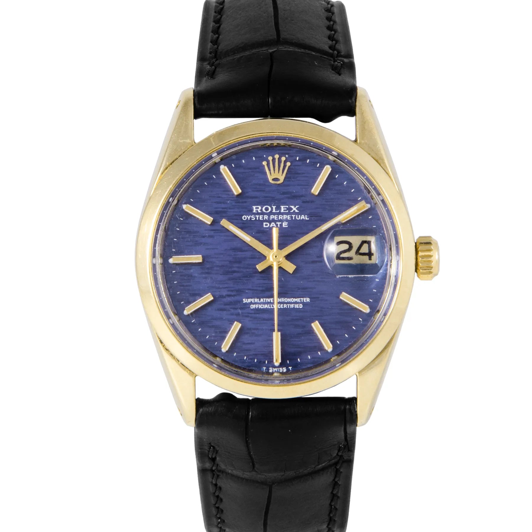 This Pre-owned Rolex Oyster Perpetual Date 34mm, replated yellow gold case, blue dial, replated yellow gold bezel and aftermarket black leather strap is in good condition. Mechanised by Rolex calibre 1570 automatic movement. The year of production is 1972 as determined by the serial number starting with "3". Includes 2 years Timepiece360 warranty.