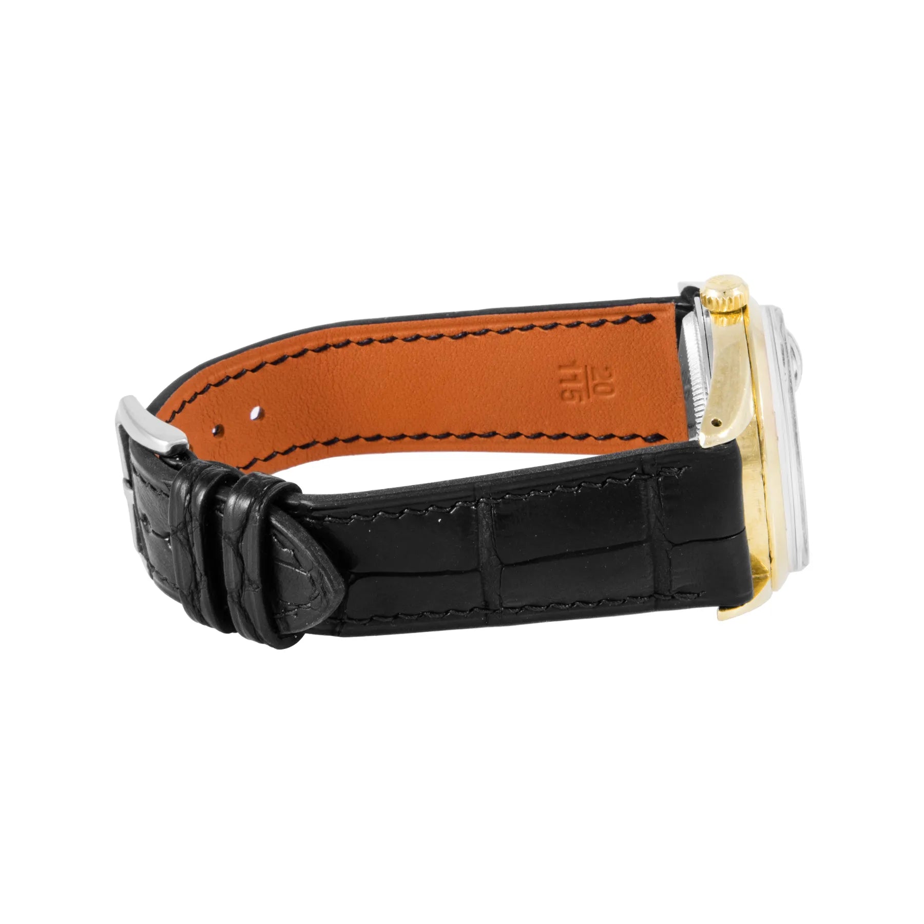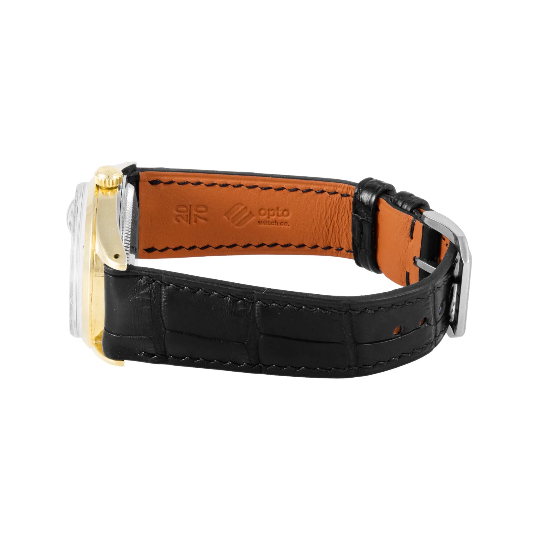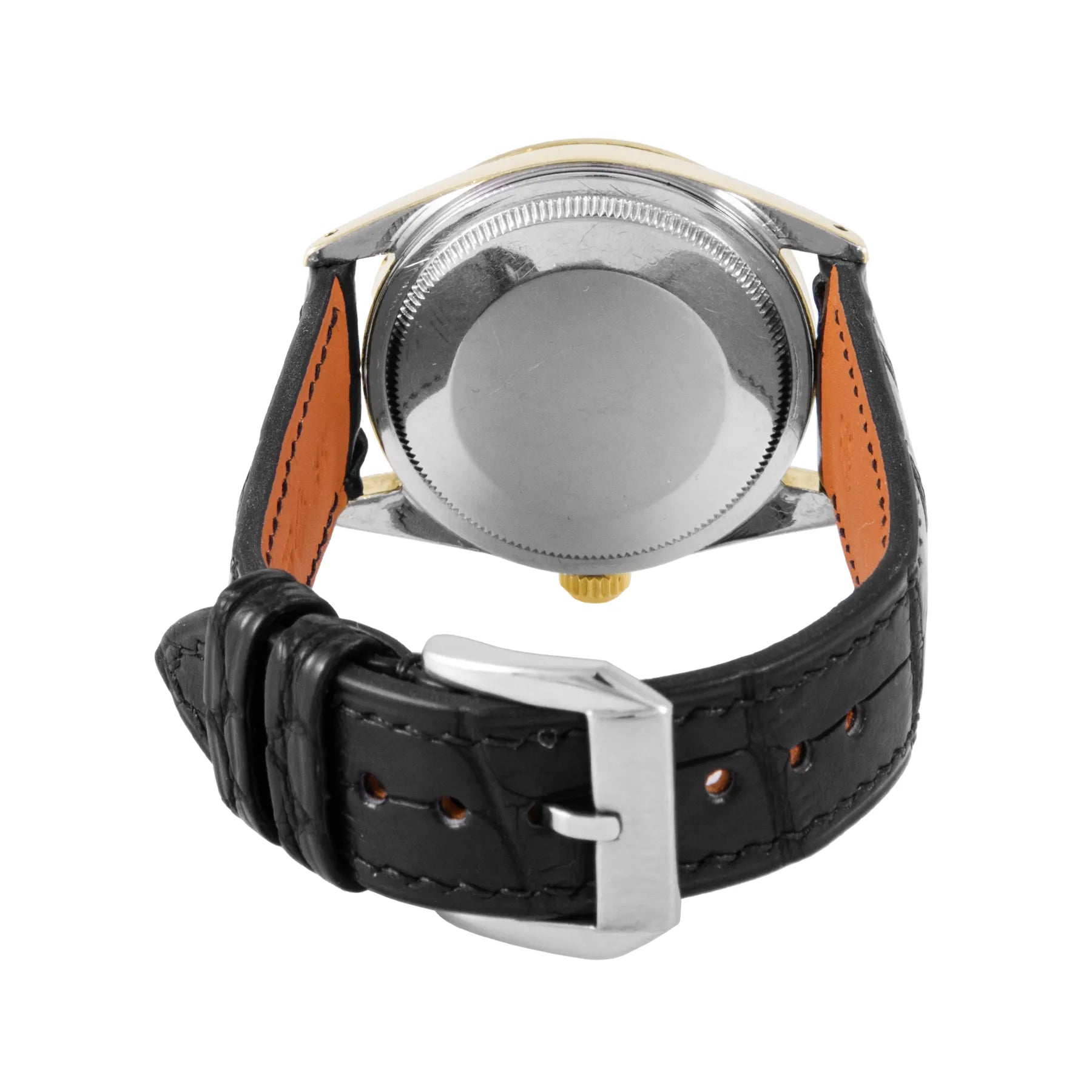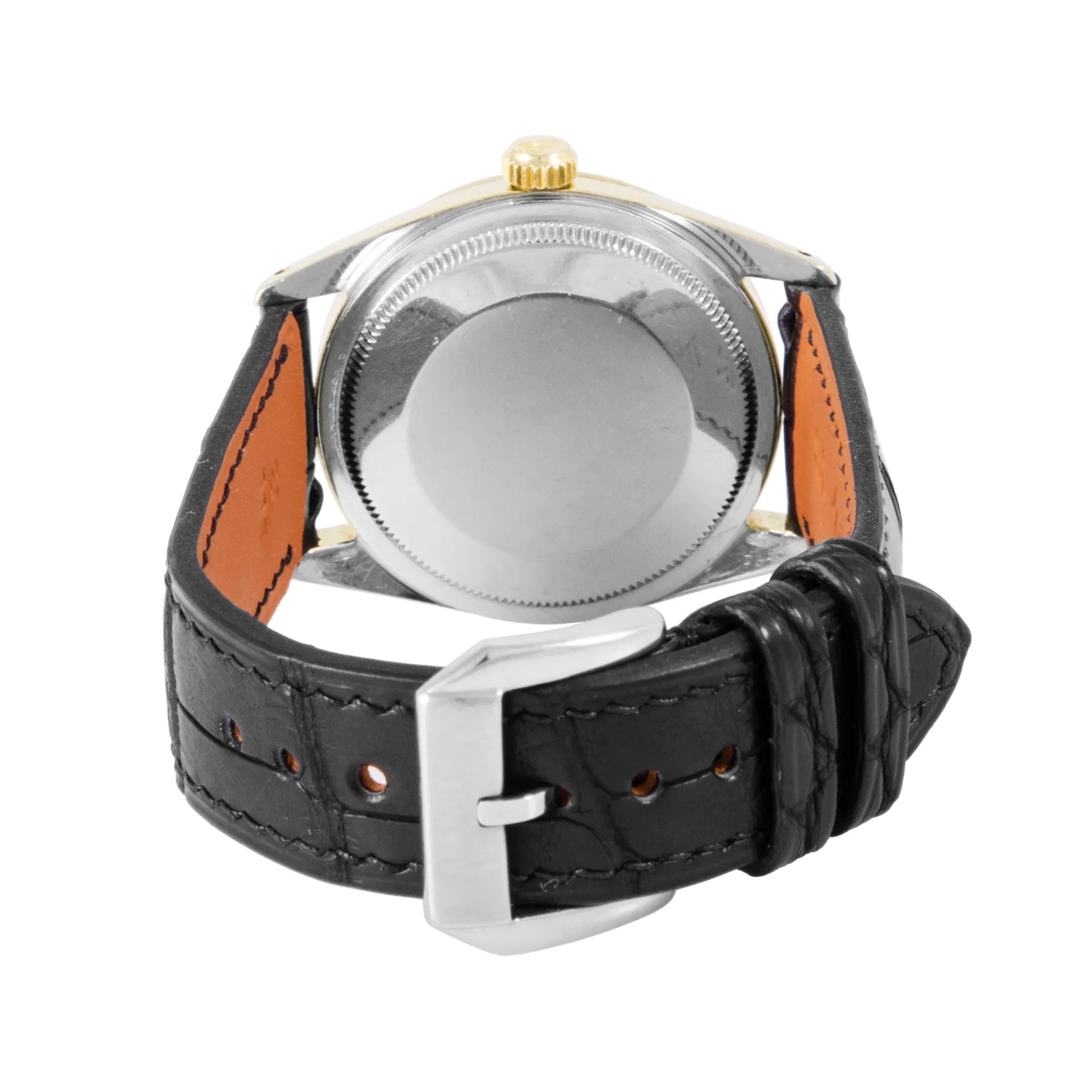 This Pre-owned Rolex Oyster Perpetual Date 34mm, replated yellow gold case, blue dial, replated yellow gold bezel and aftermarket black leather strap is in good condition. Mechanised by Rolex calibre 1570 automatic movement. The year of production is 1972 as determined by the serial number starting with "3". Includes 2 years Timepiece360 warranty.