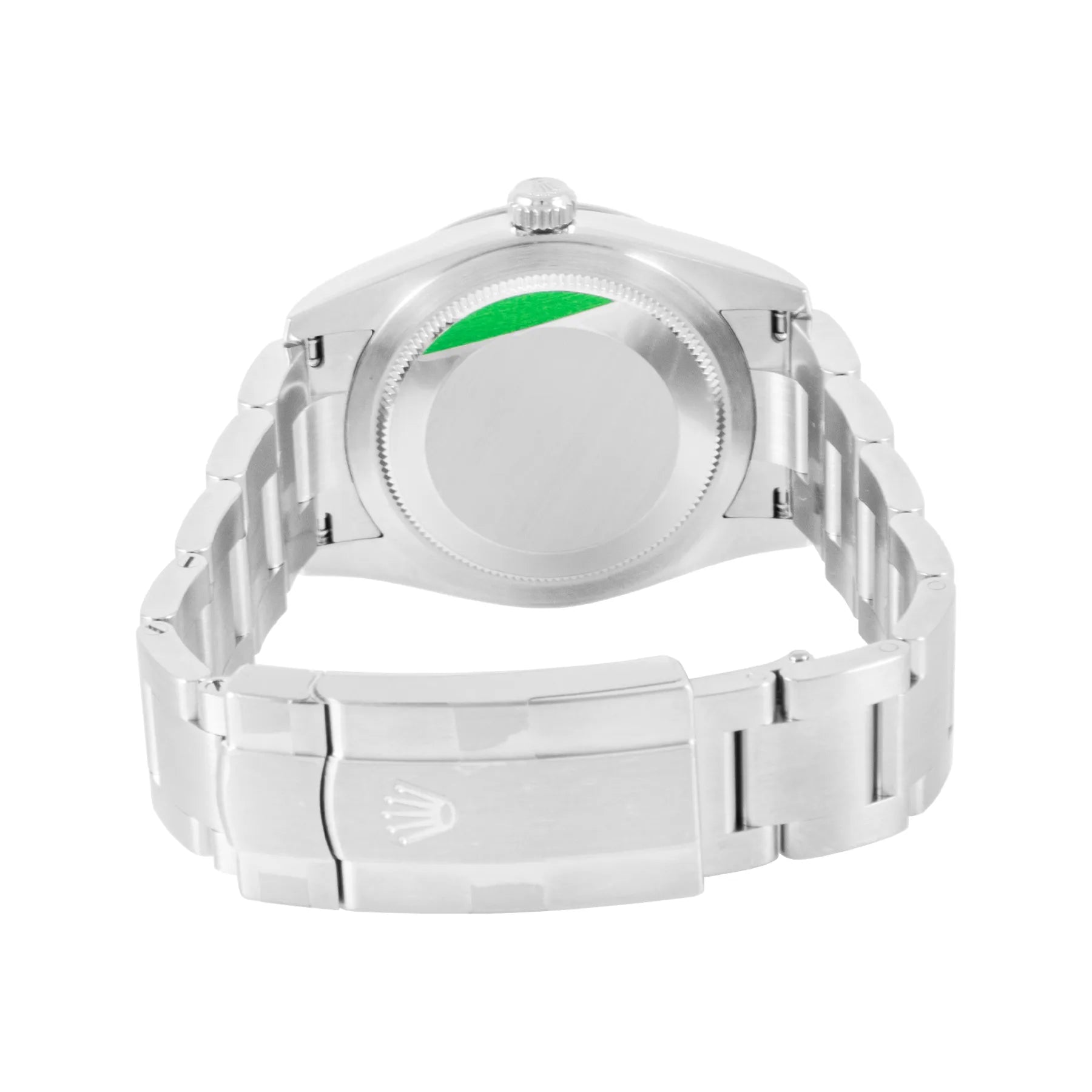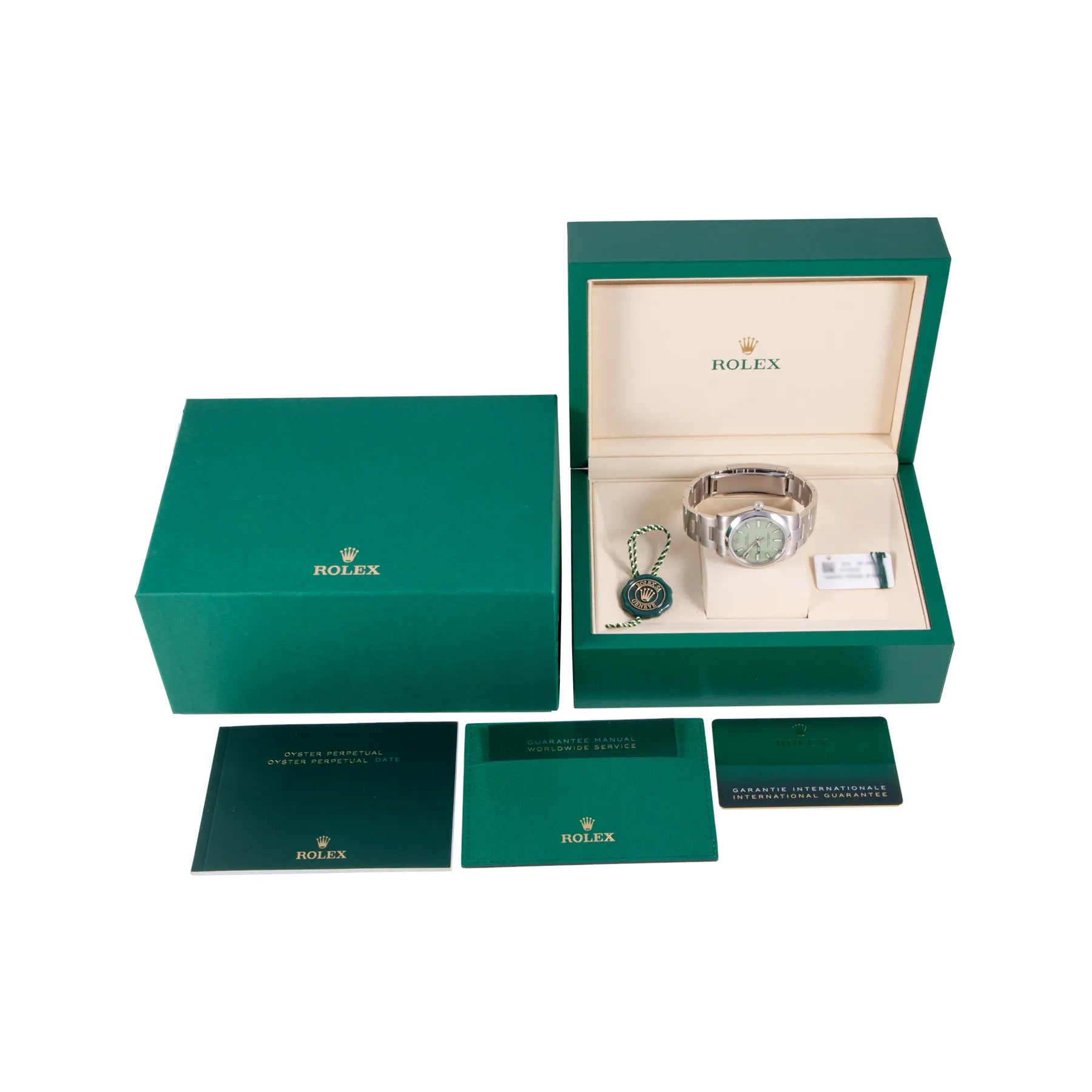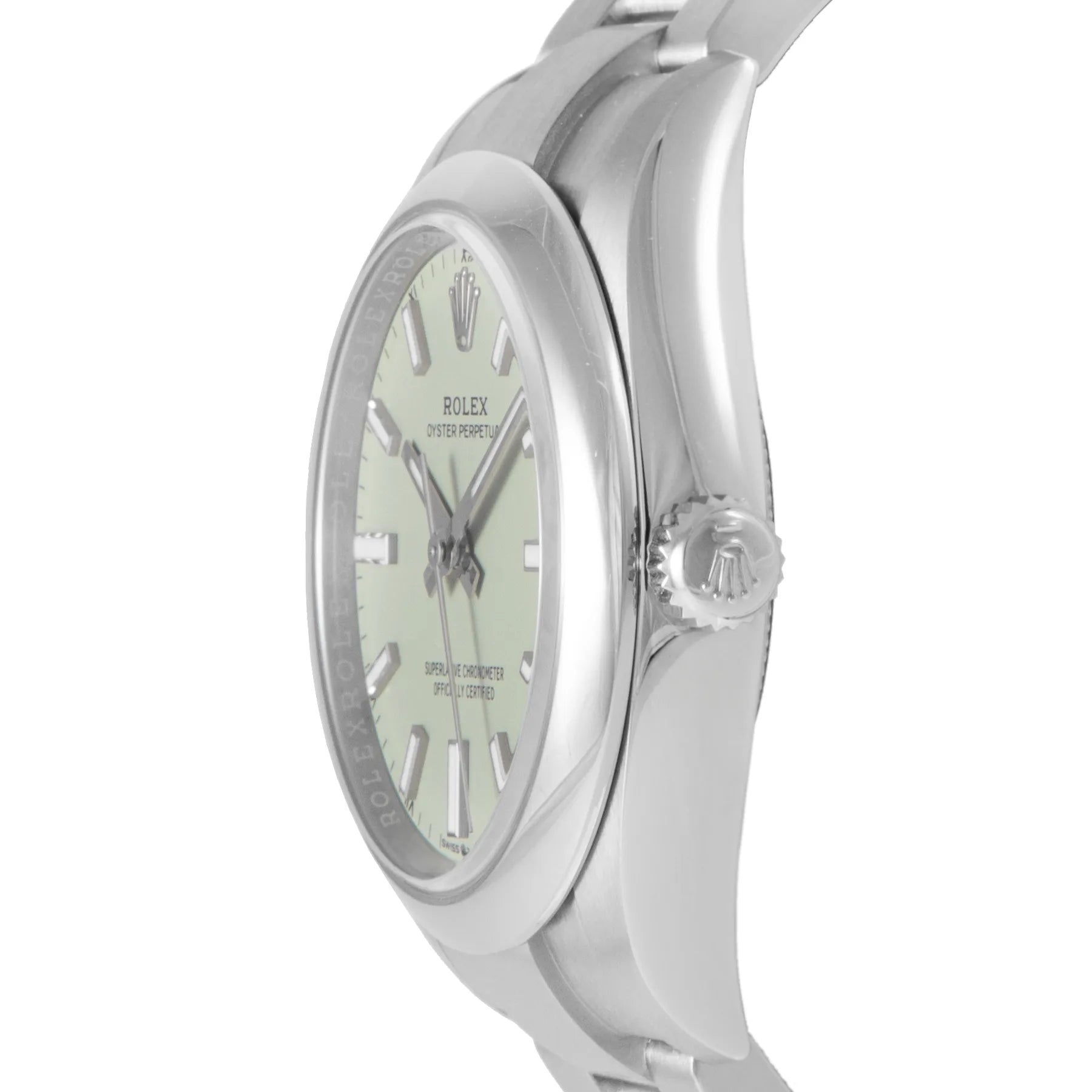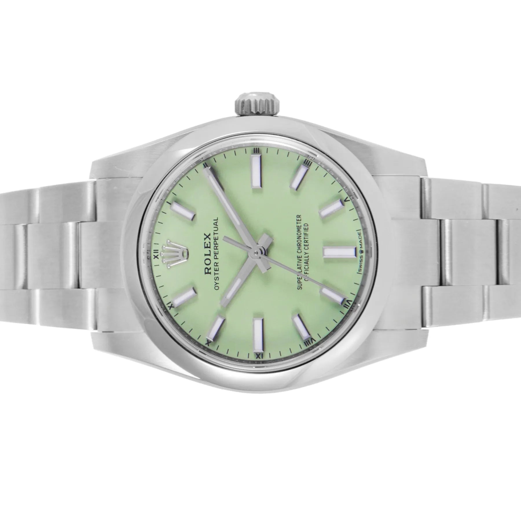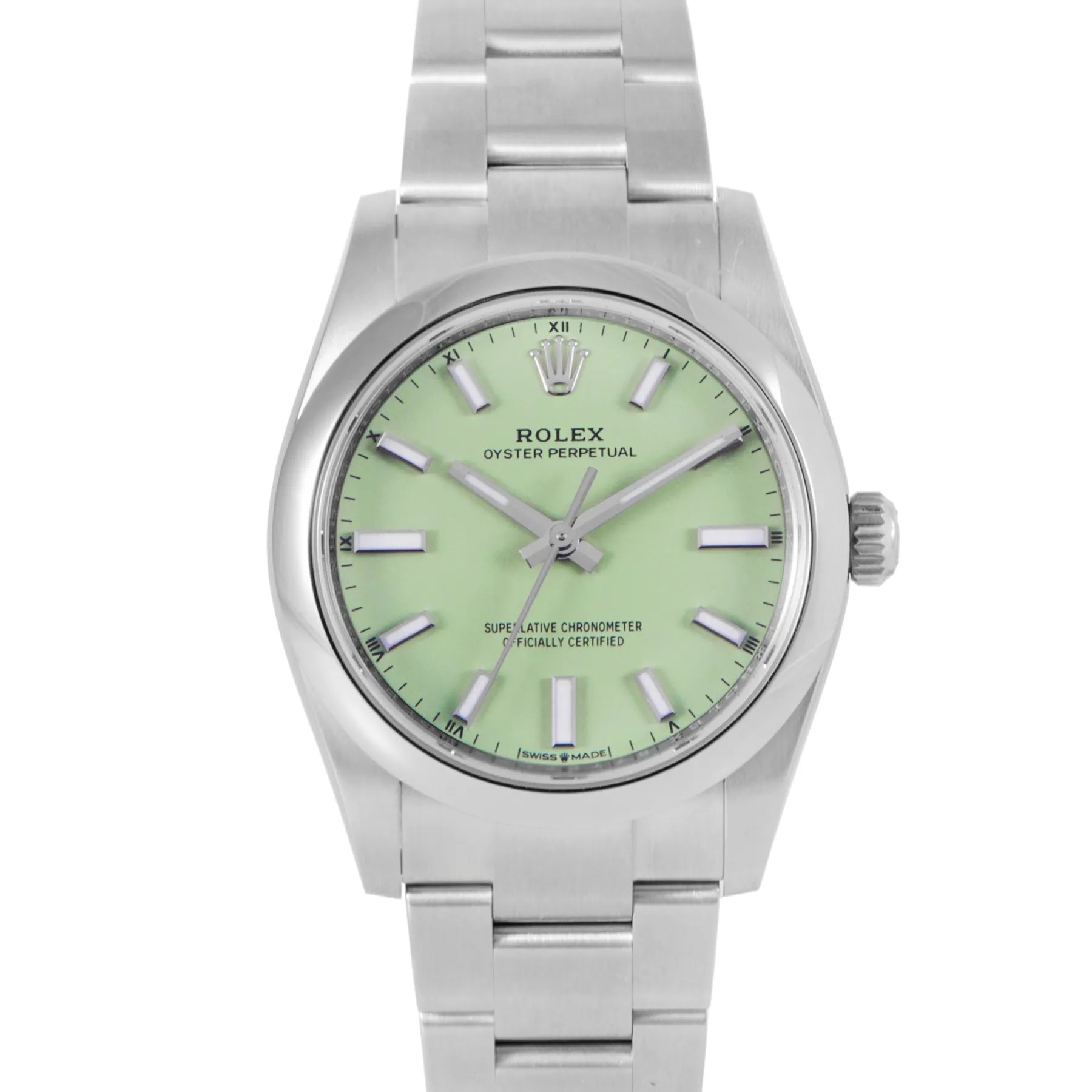 This Rolex Oyster Perpetual 34mm, steel case, pistachio dial, steel bezel and steel oyster bracelet with 12 links in unworn condition. Mechanised by Rolex calibre 2232 automatic movement. Includes box and Rolex sales warranty card dated January 2026.