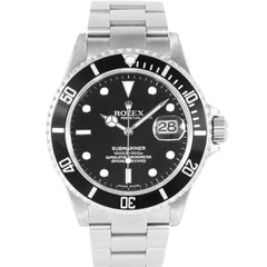 This Pre-owned Rolex Submariner Date 40mm, steel case, black dial, aluminium bezel and steel oyster bracelet with 11 links is in very good condition. Mechanised by Rolex calibre 3135 automatic movement. Includes box with generic cushion and sales warranty card dated February 2007 and 2 years Timepiece360 warranty.
