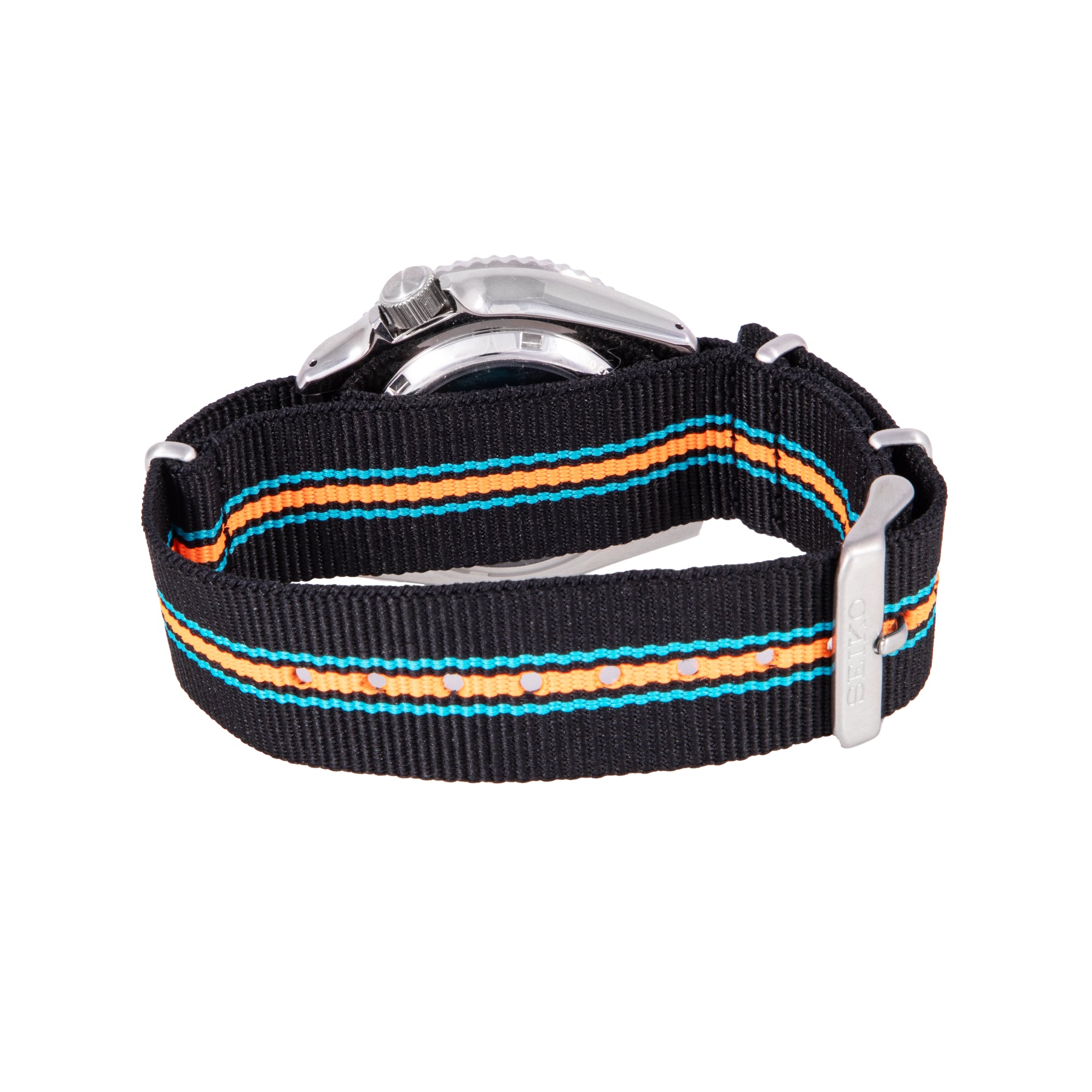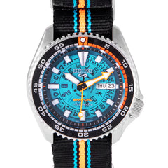 This Seiko 5 Sports SKX Series 42.5mm, steel case, blue dial, steel bezel and black nylon strap in an unworn condition. This watch is Limited Edition to 2025 pieces only. Mechanised by Seiko calibre 4R36 automatic with manual movement. Includes box and sales warranty card dated October 2025.
