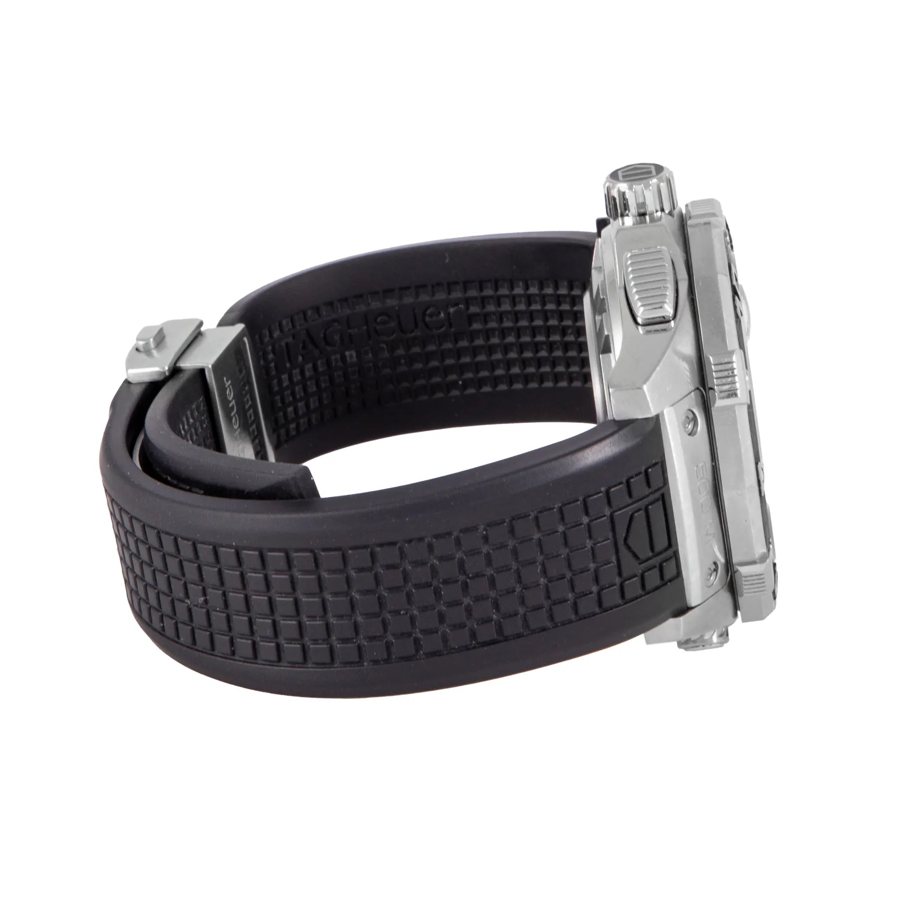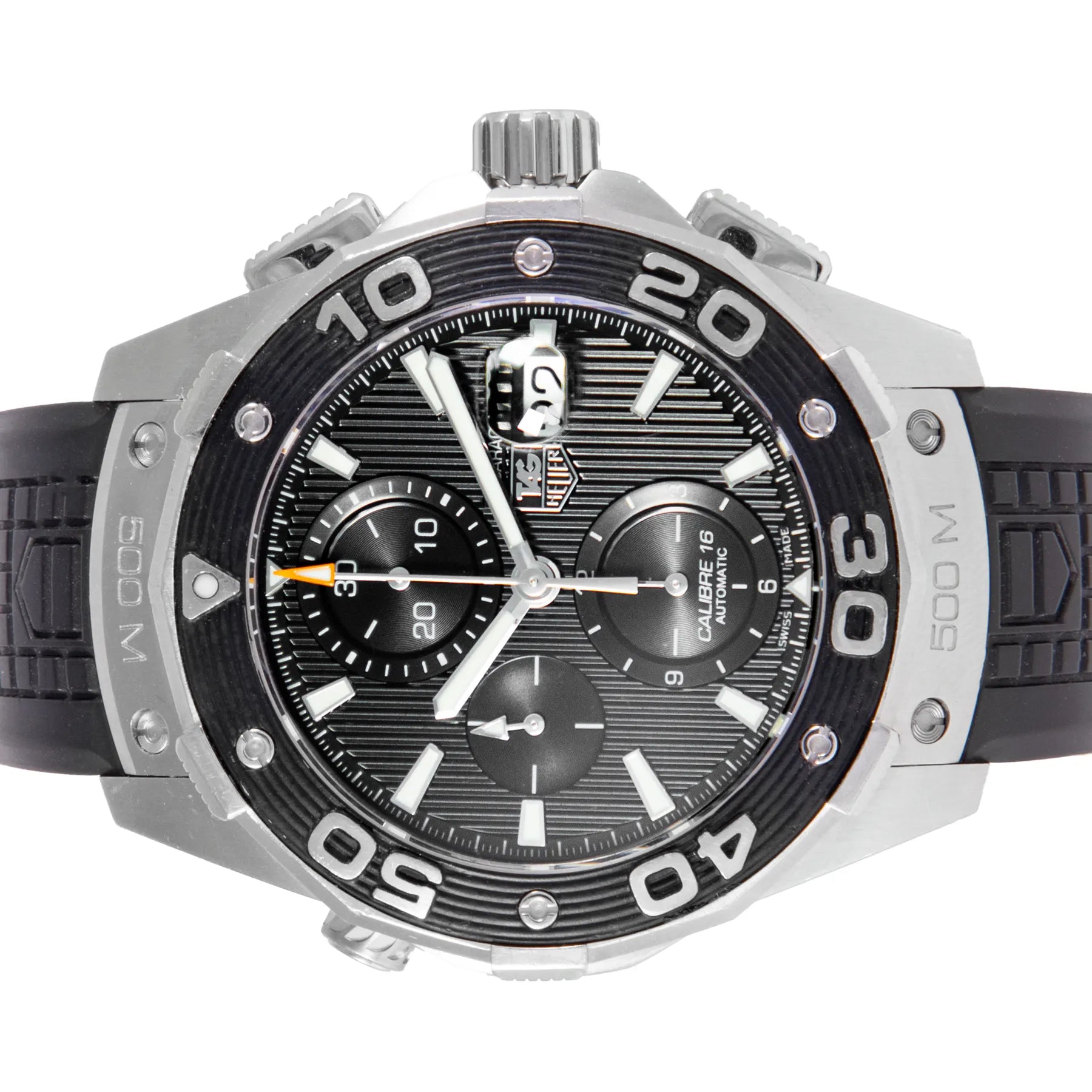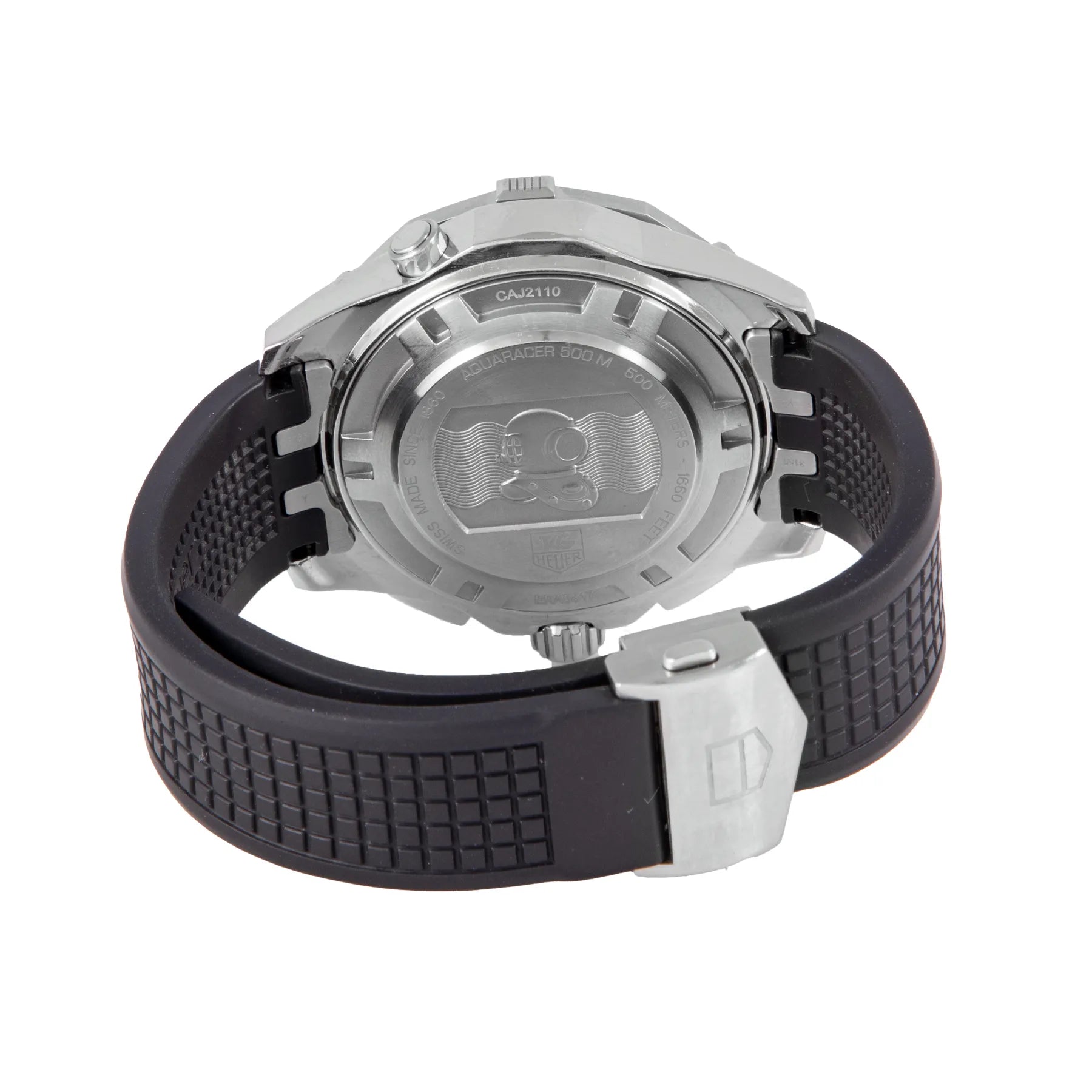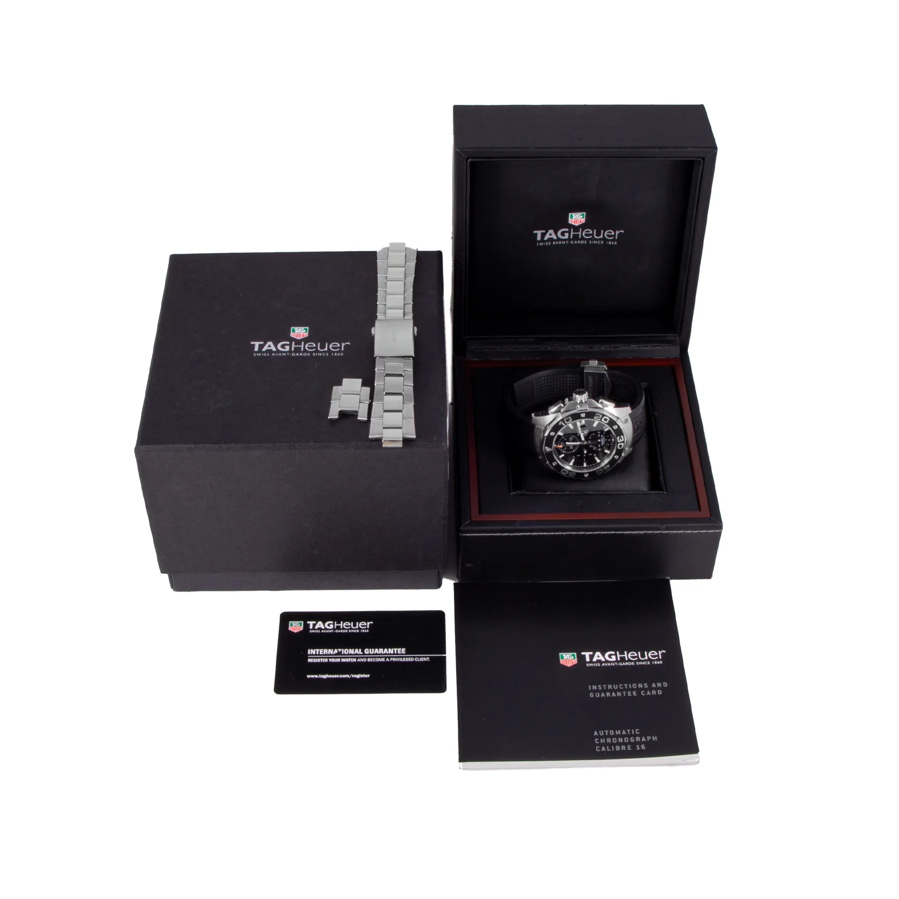 This Pre-owned Tag Heuer Aquaracer 500M 44mm, steel case, black dial, steel bezel and black rubber strap is in very good condition. Mechanised by Tag Heuer calibre 16 / 7750 automatic movement. Includes box, extra steel bracelet, sales warranty card dated October 2012, and 2 years Timepiece360 warranty.