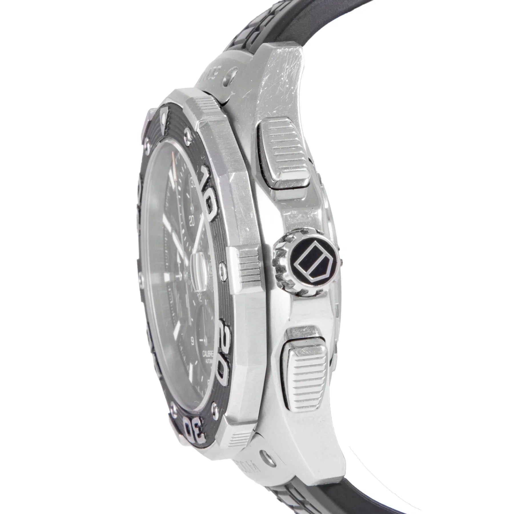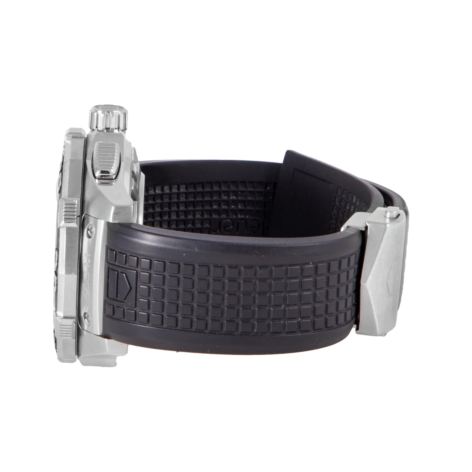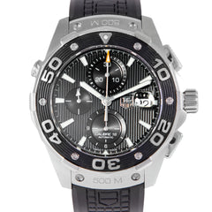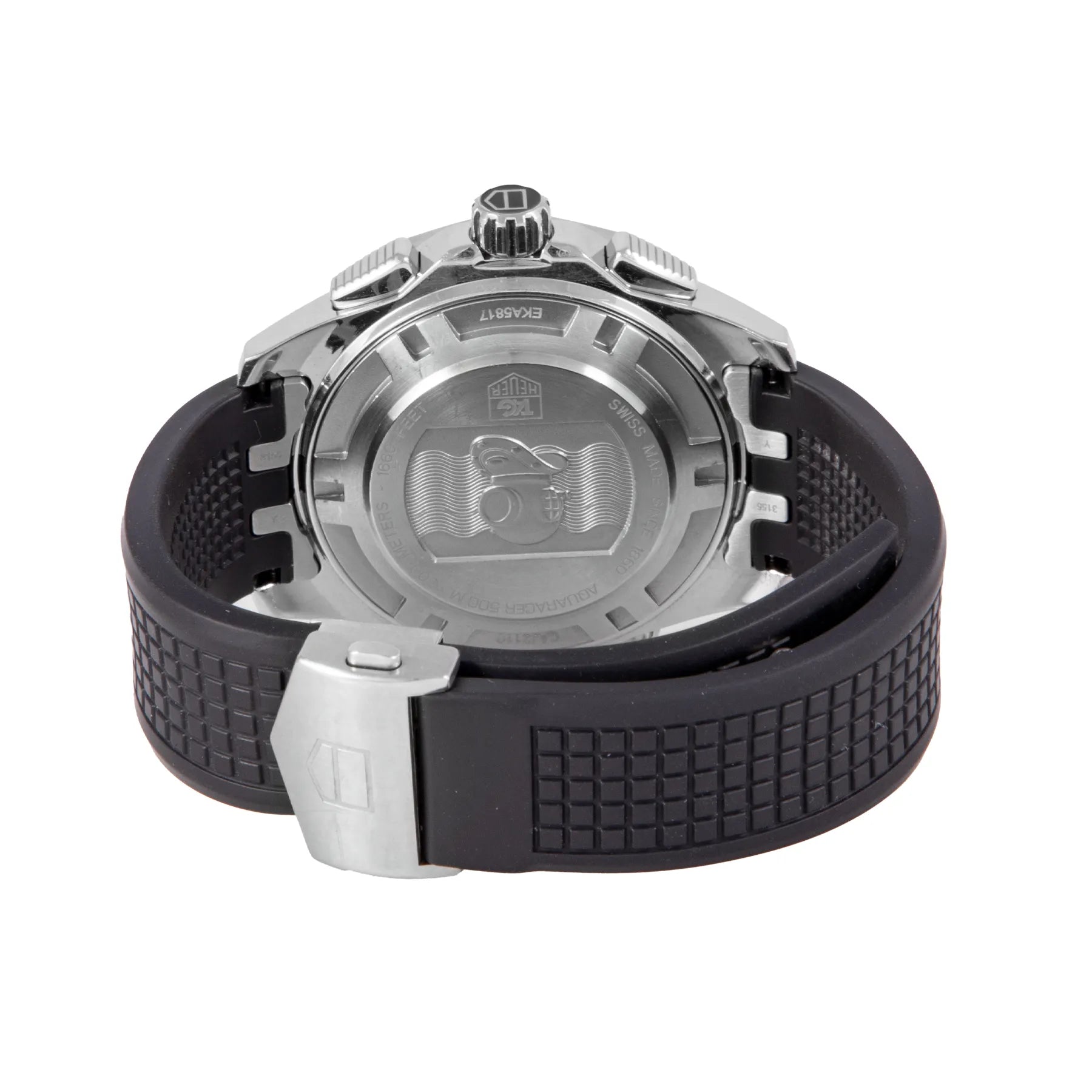 This Pre-owned Tag Heuer Aquaracer 500M 44mm, steel case, black dial, steel bezel and black rubber strap is in very good condition. Mechanised by Tag Heuer calibre 16 / 7750 automatic movement. Includes box, extra steel bracelet, sales warranty card dated October 2012, and 2 years Timepiece360 warranty.