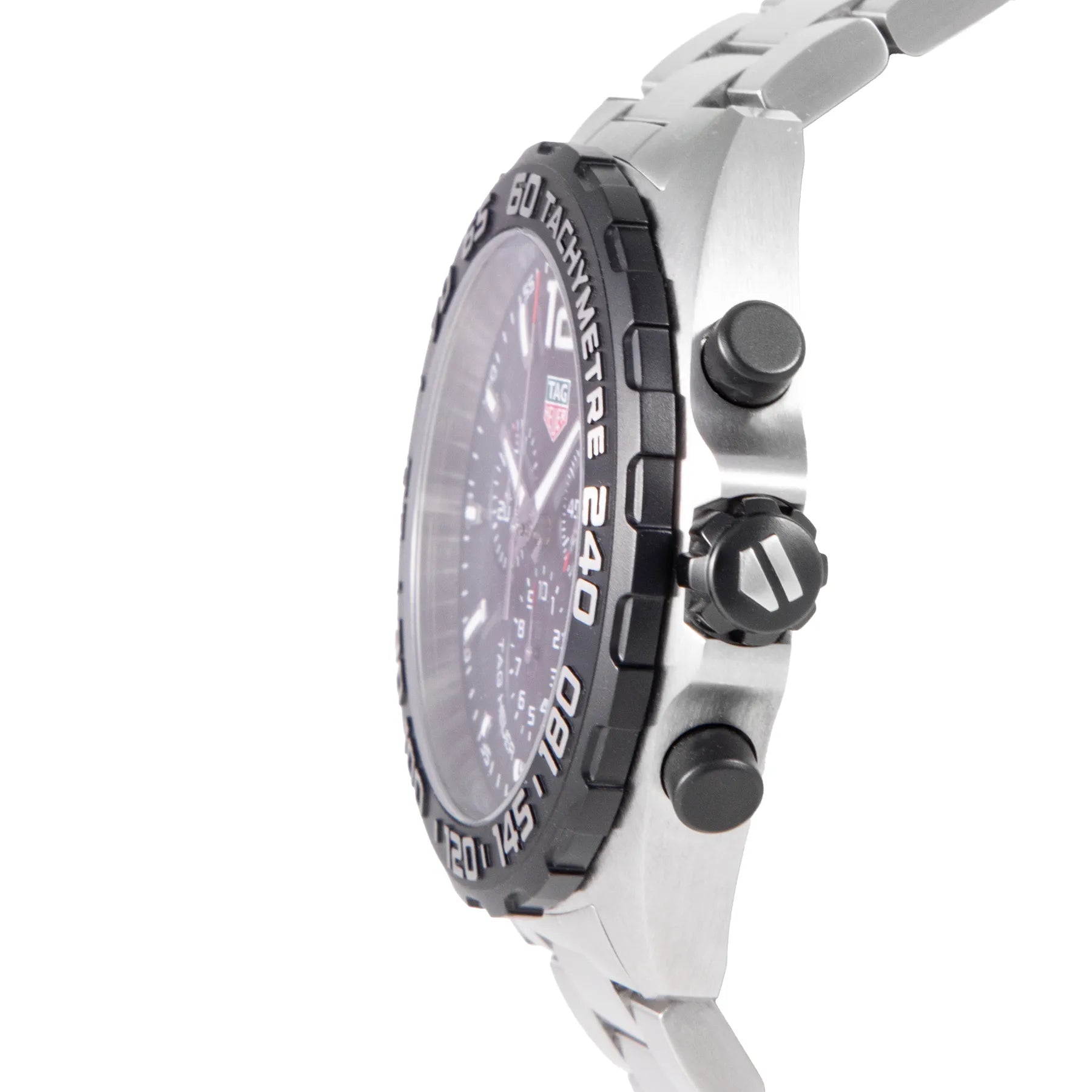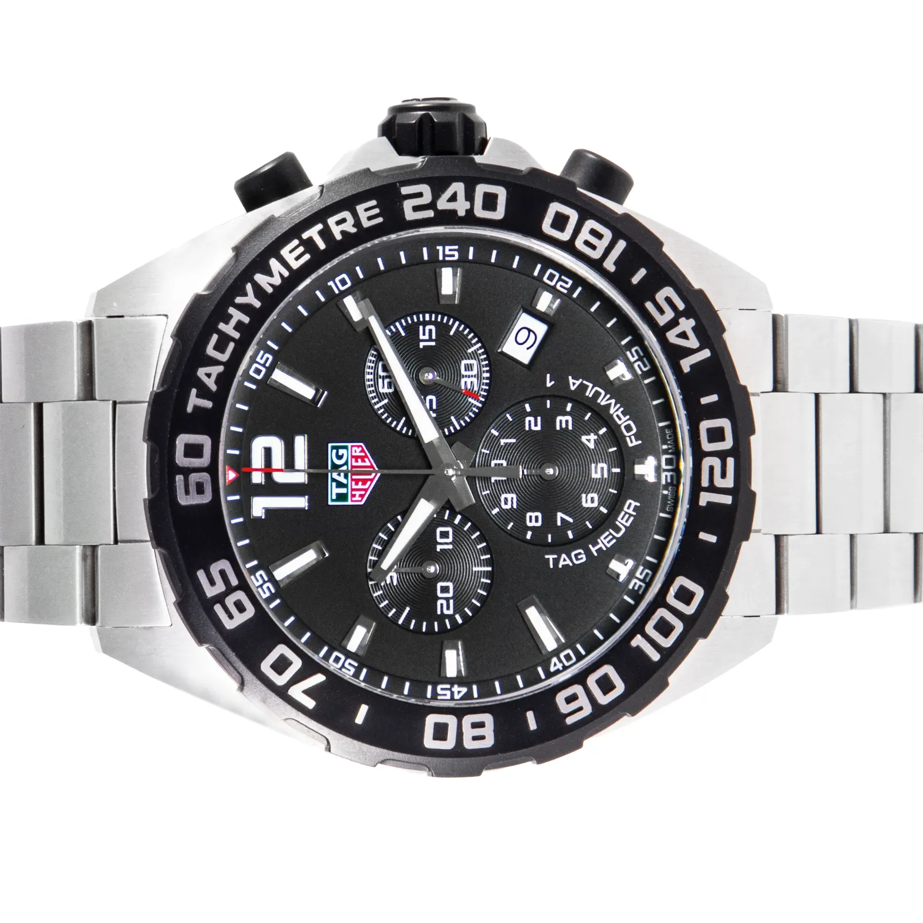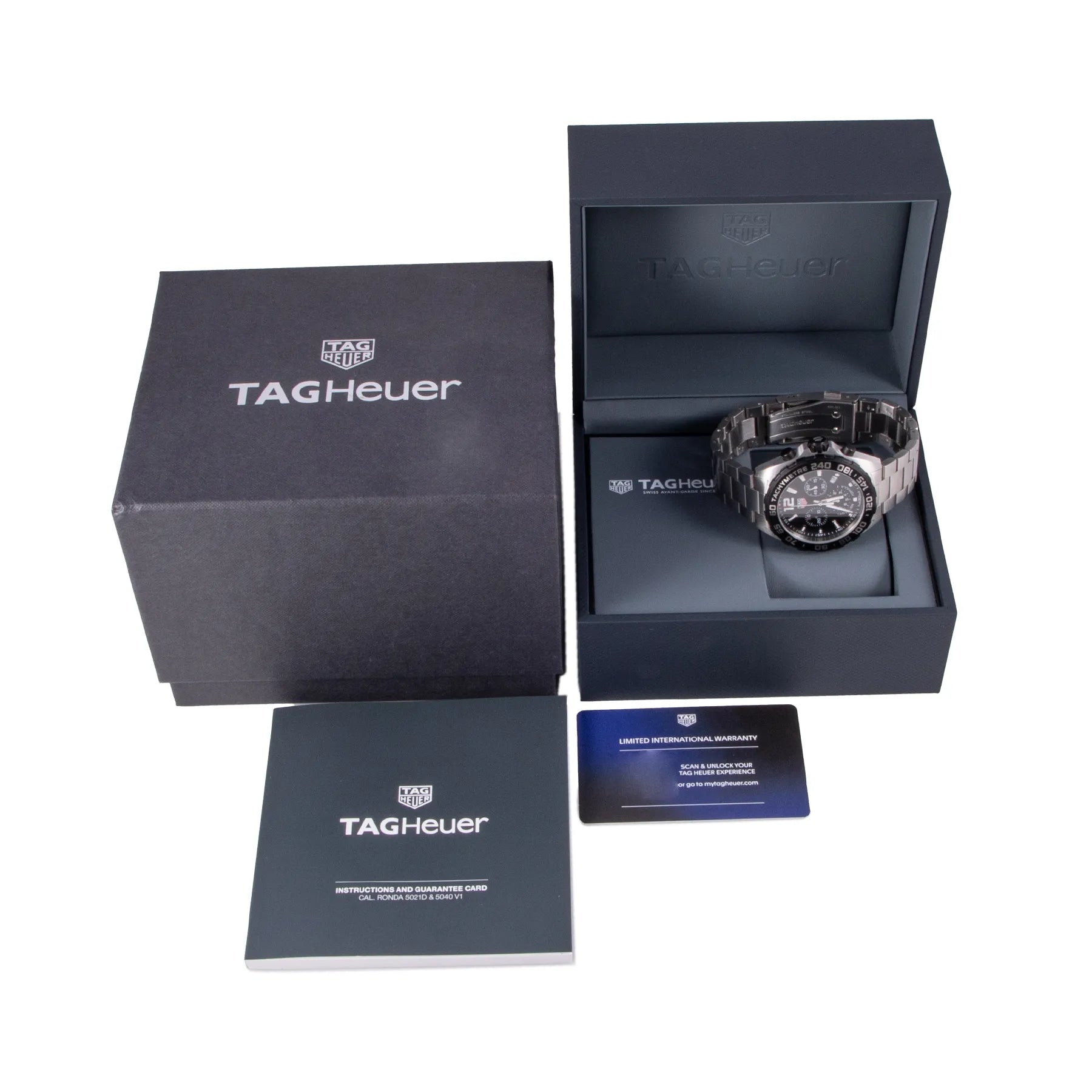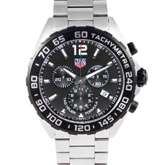 This Pre-owned TAG Heuer Formula 1 Chronograph 43mm, steel case, black dial, steel black PVD bezel and steel bracelet with 17 links in very good condition. Mechanised by TAG Heuer calibre quartz movement. Includes box, blank sales warranty card, TAG Heuer sales invoice dated September 2023, and 2 years Timepiece360 warranty.