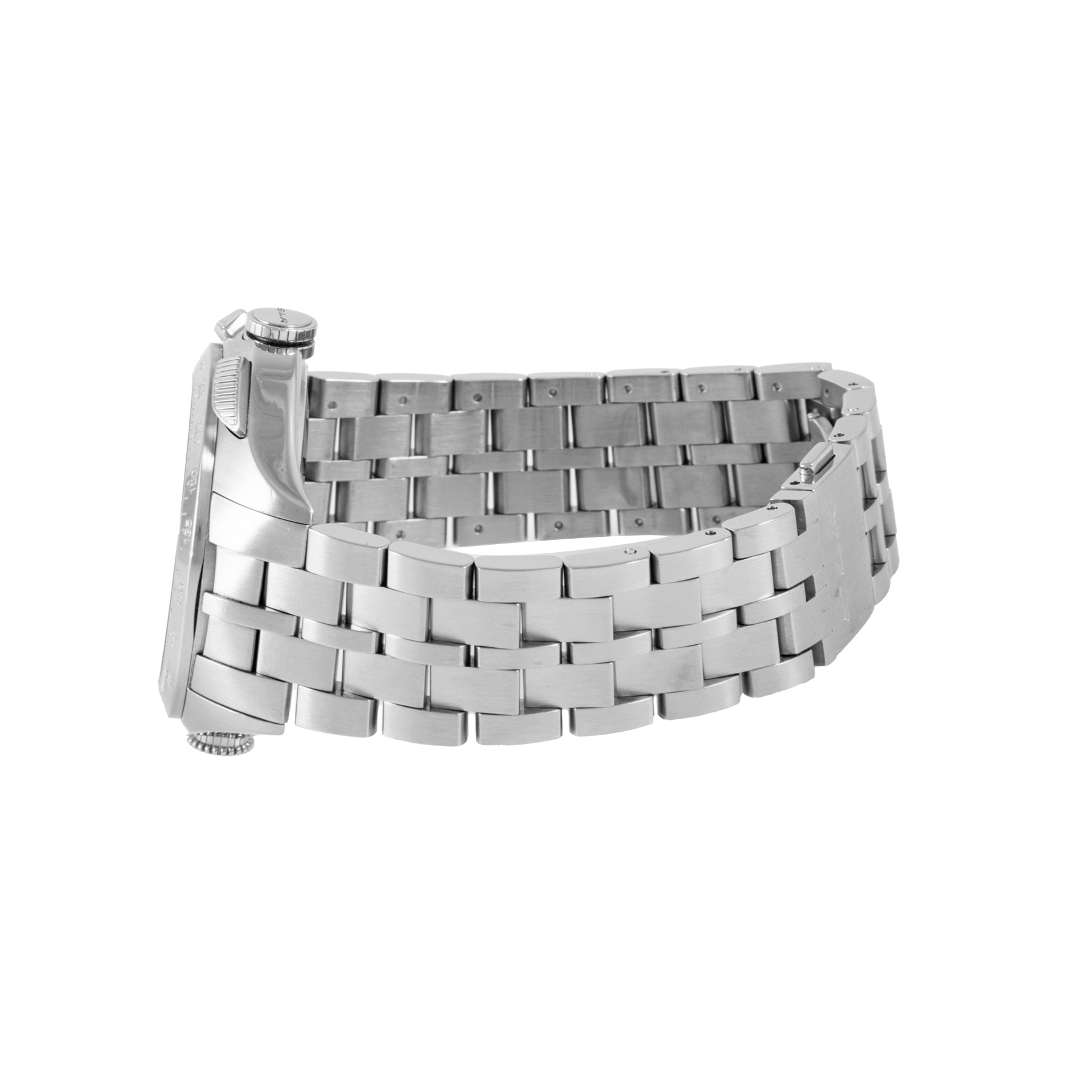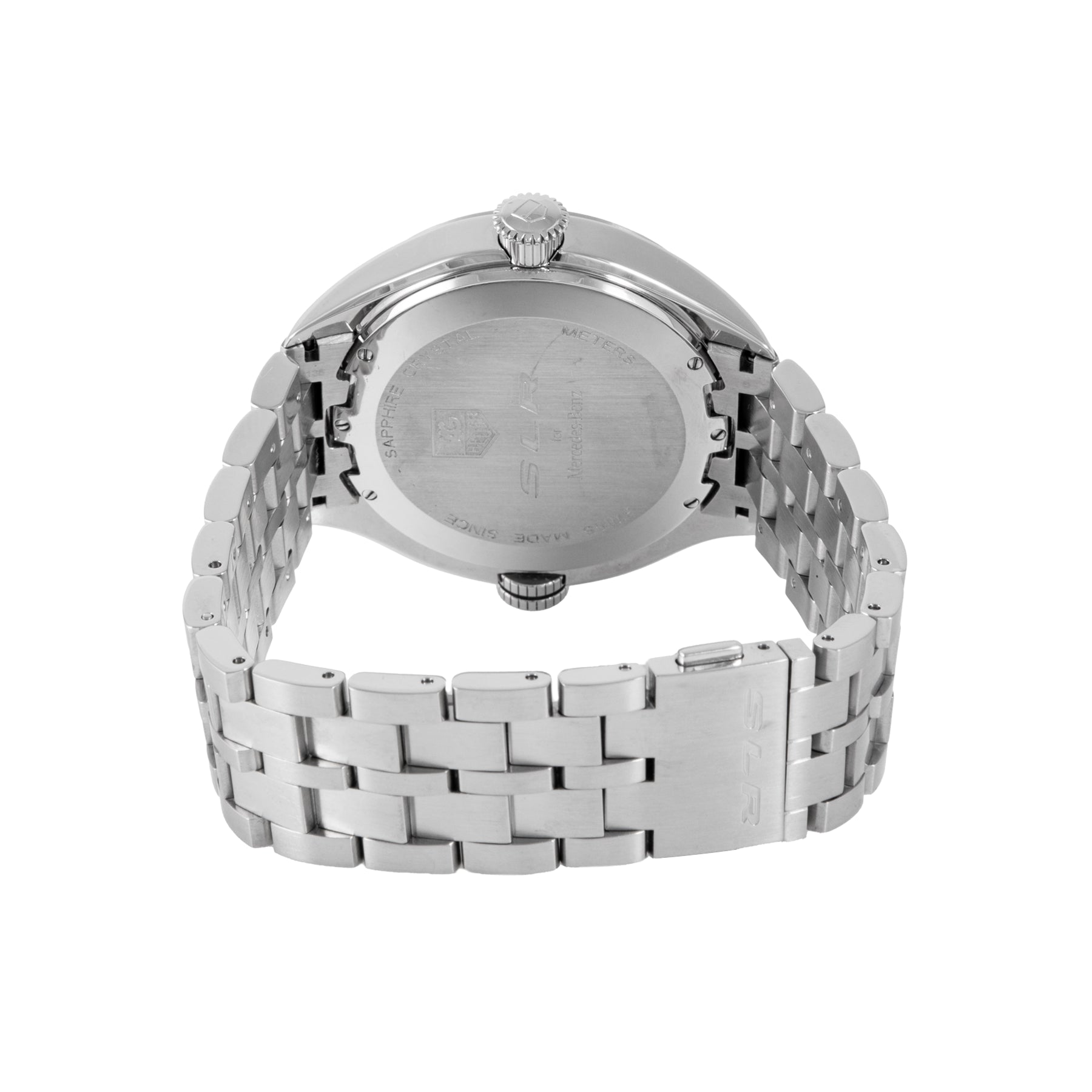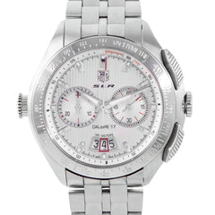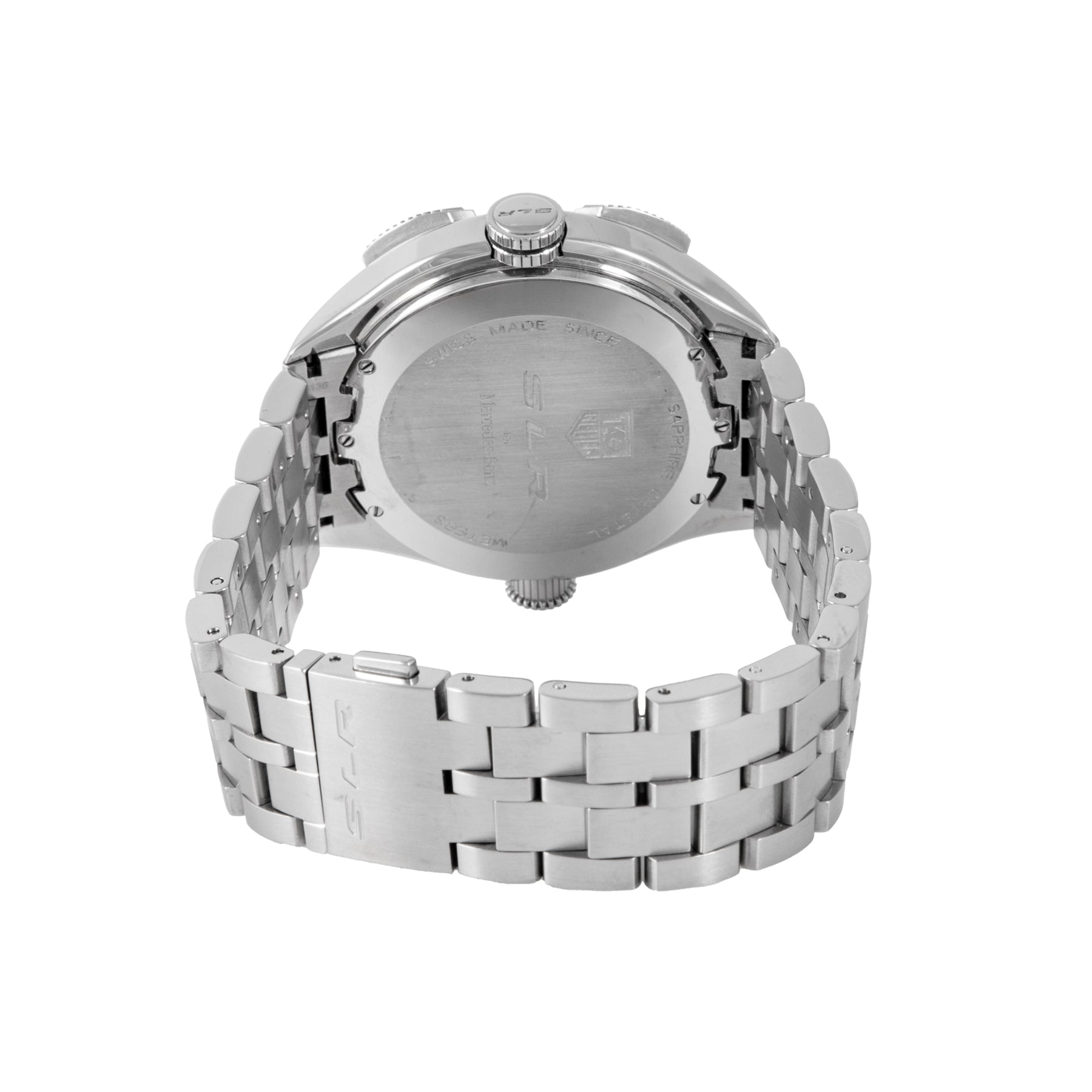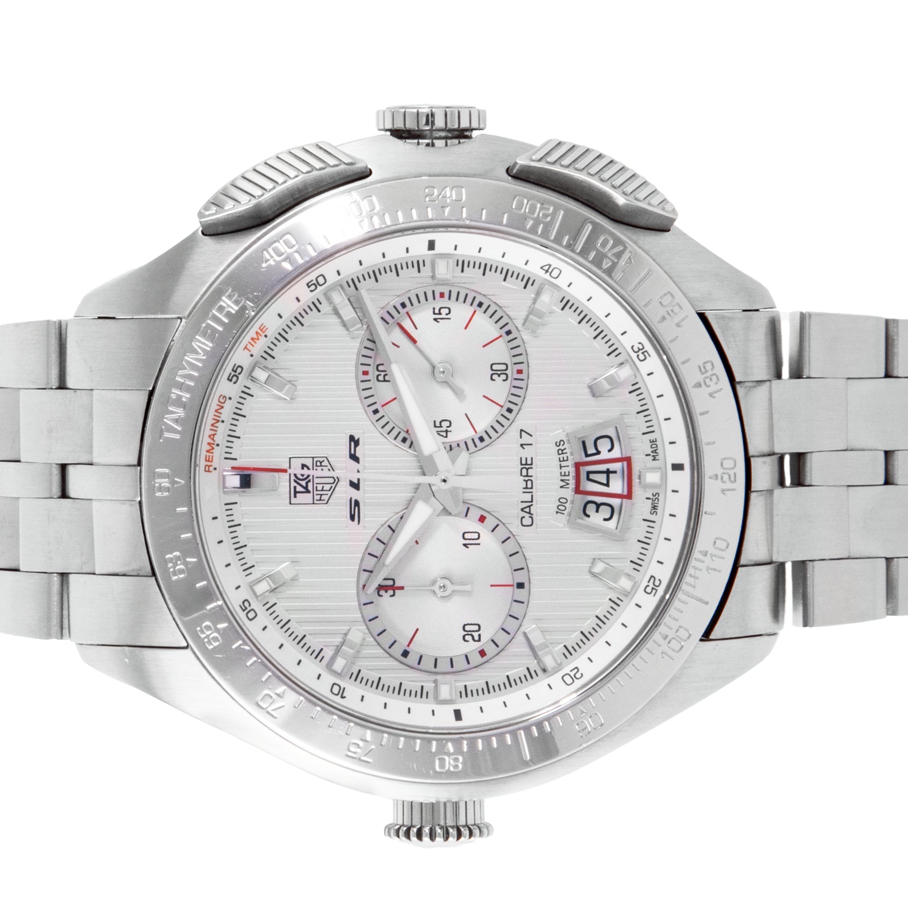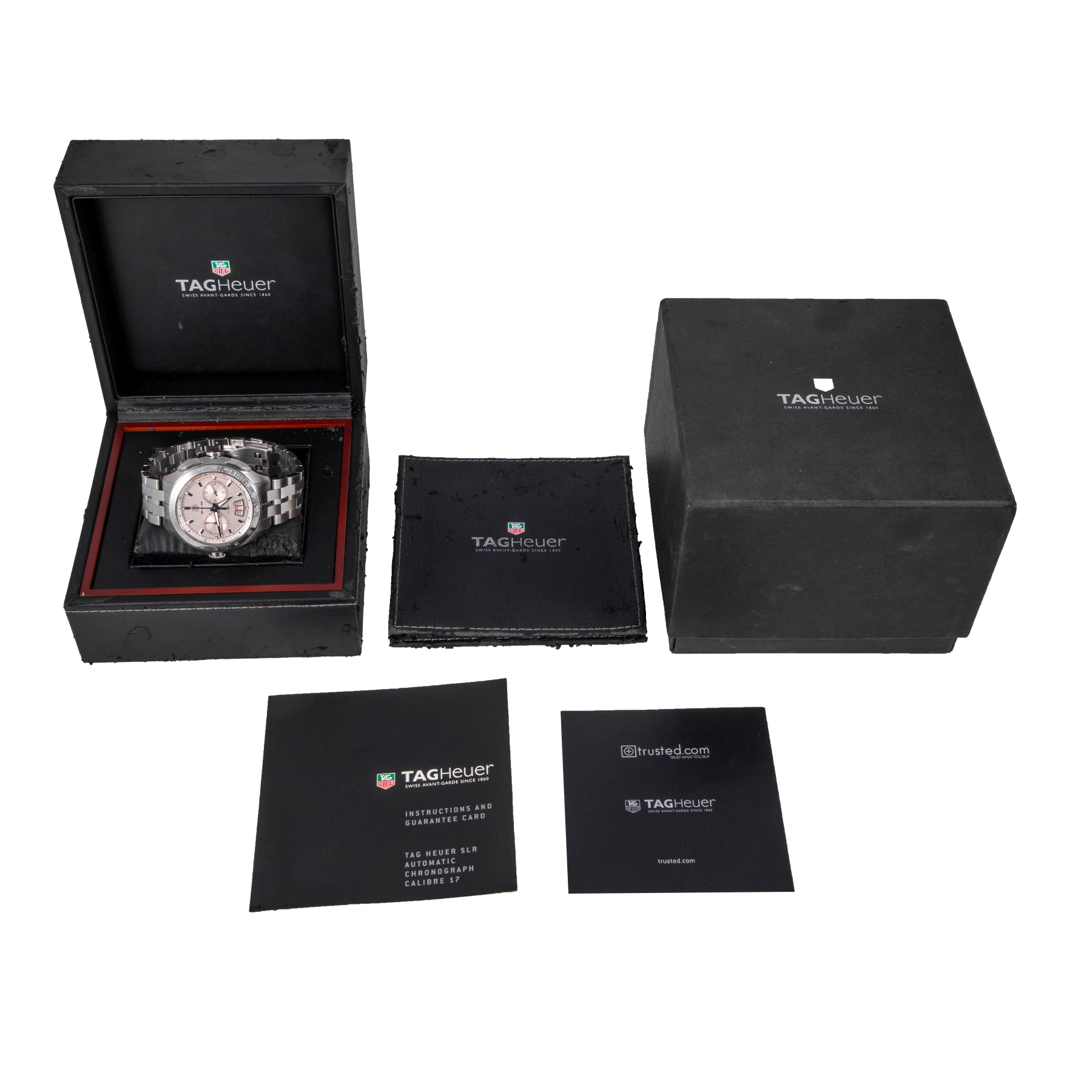 This Pre-owned TAG Heuer SLR Chronograph 47mm, steel case, silver dial, steel bezel and steel bracelet with 16 links is in excellent condition. Mechanised by TAG Heuer calibre 2894-2 automatic movement. Includes box, sales warranty card dated July 2012, and 2 years Timepiece360 warranty.