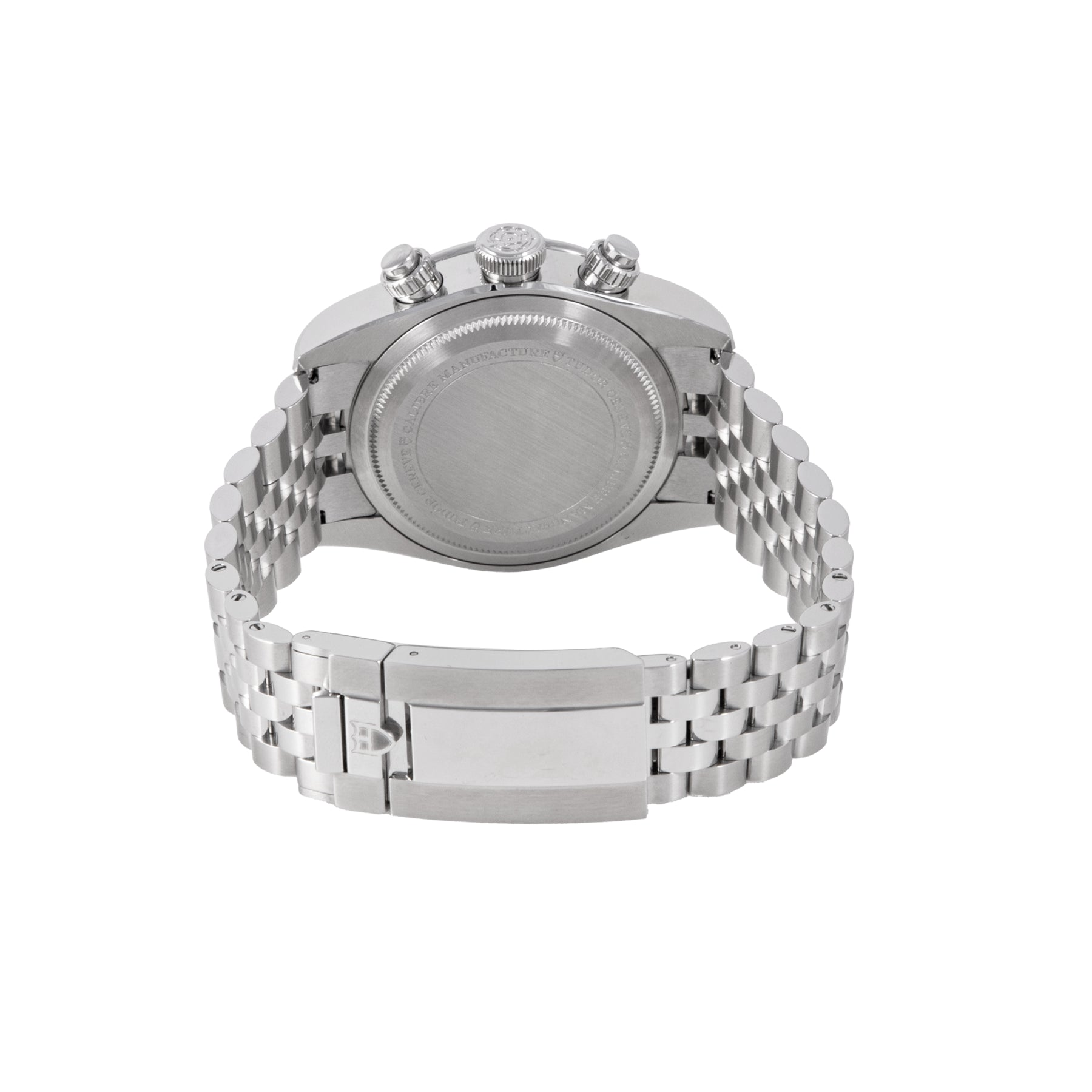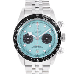 This Pre-owned Tudor Black Bay Chrono 41mm, steel case, turquoise dial, aluminium bezel and steel bracelet with 18 links is in excellent condition. Mechanised by Tudor calibre MT5813 (COSC) automatic movement. Includes box and Tudor sales warranty card dated May 2025.
