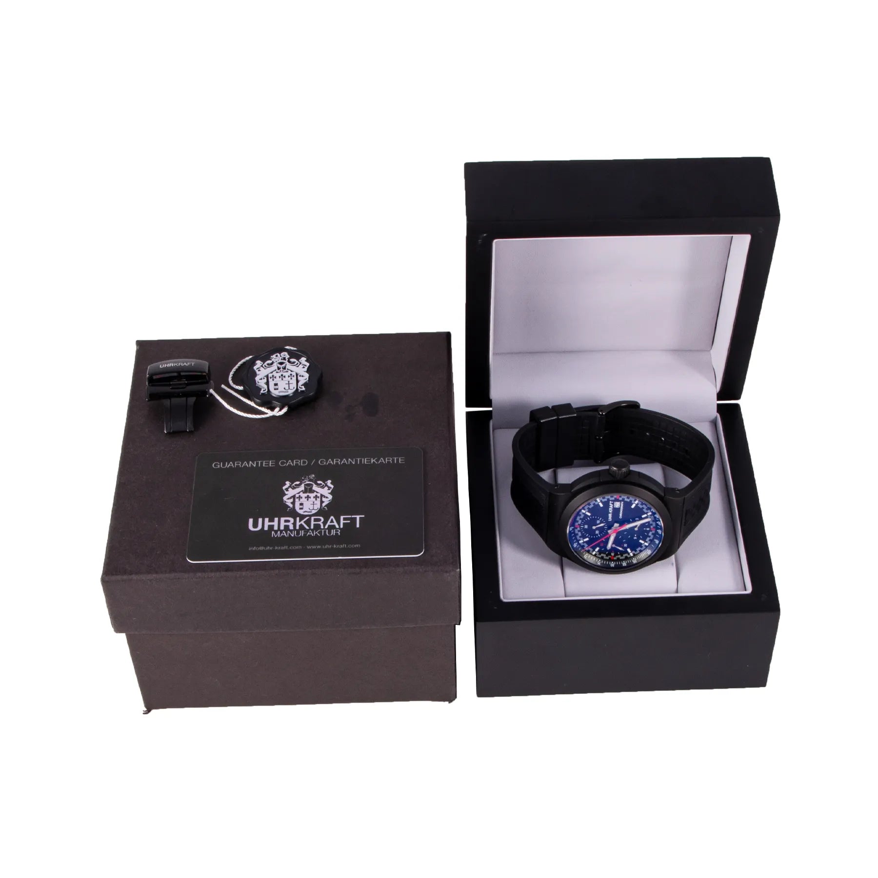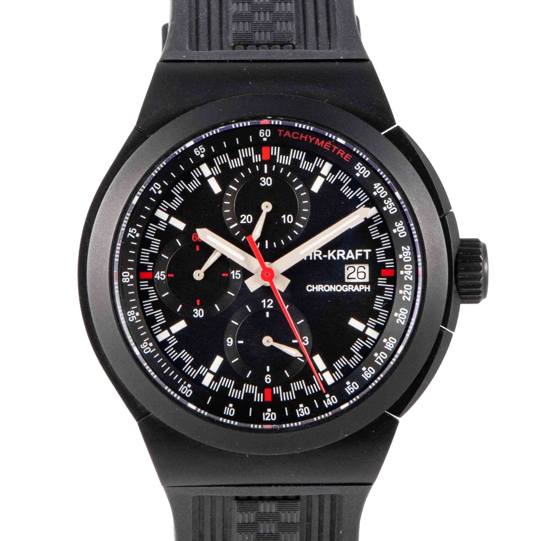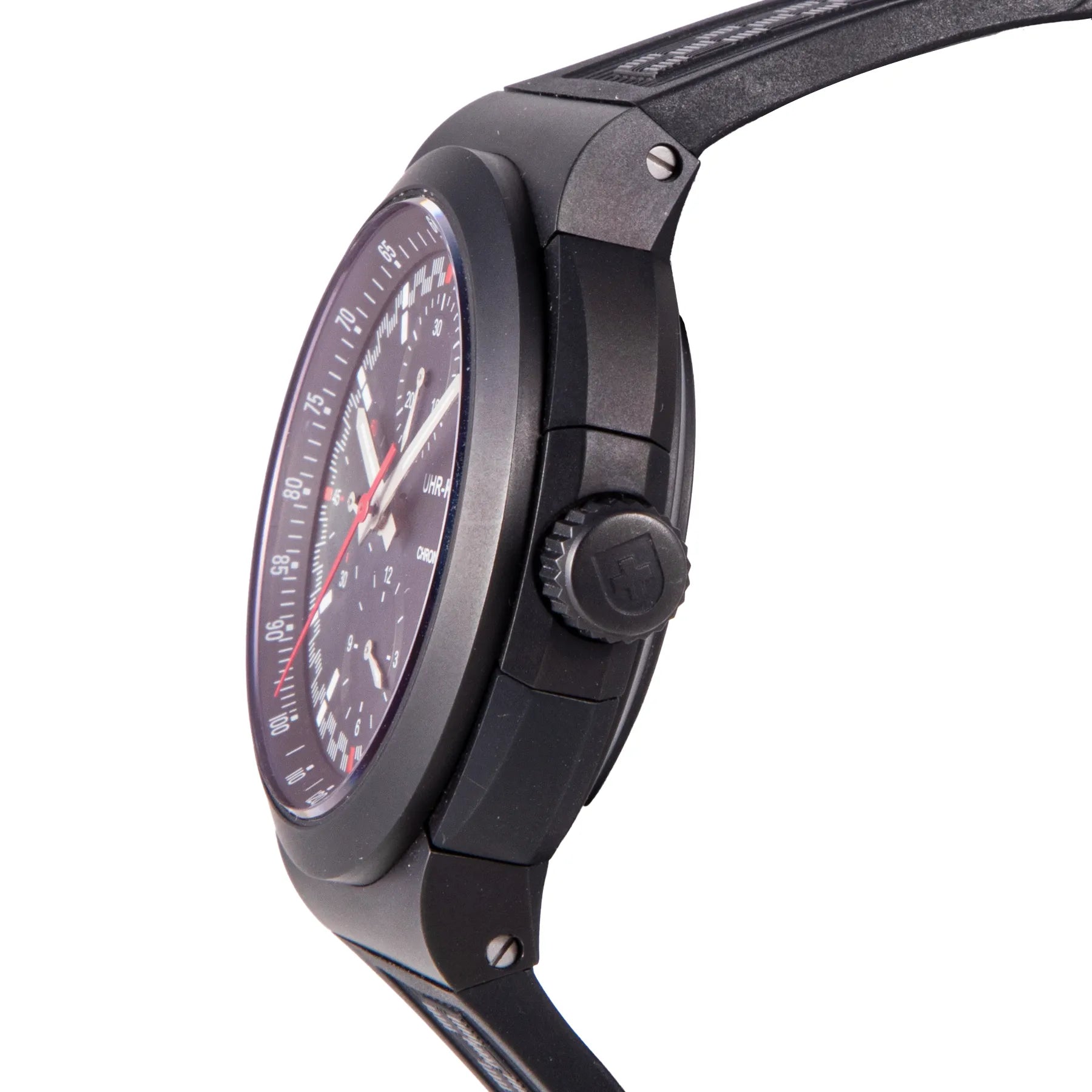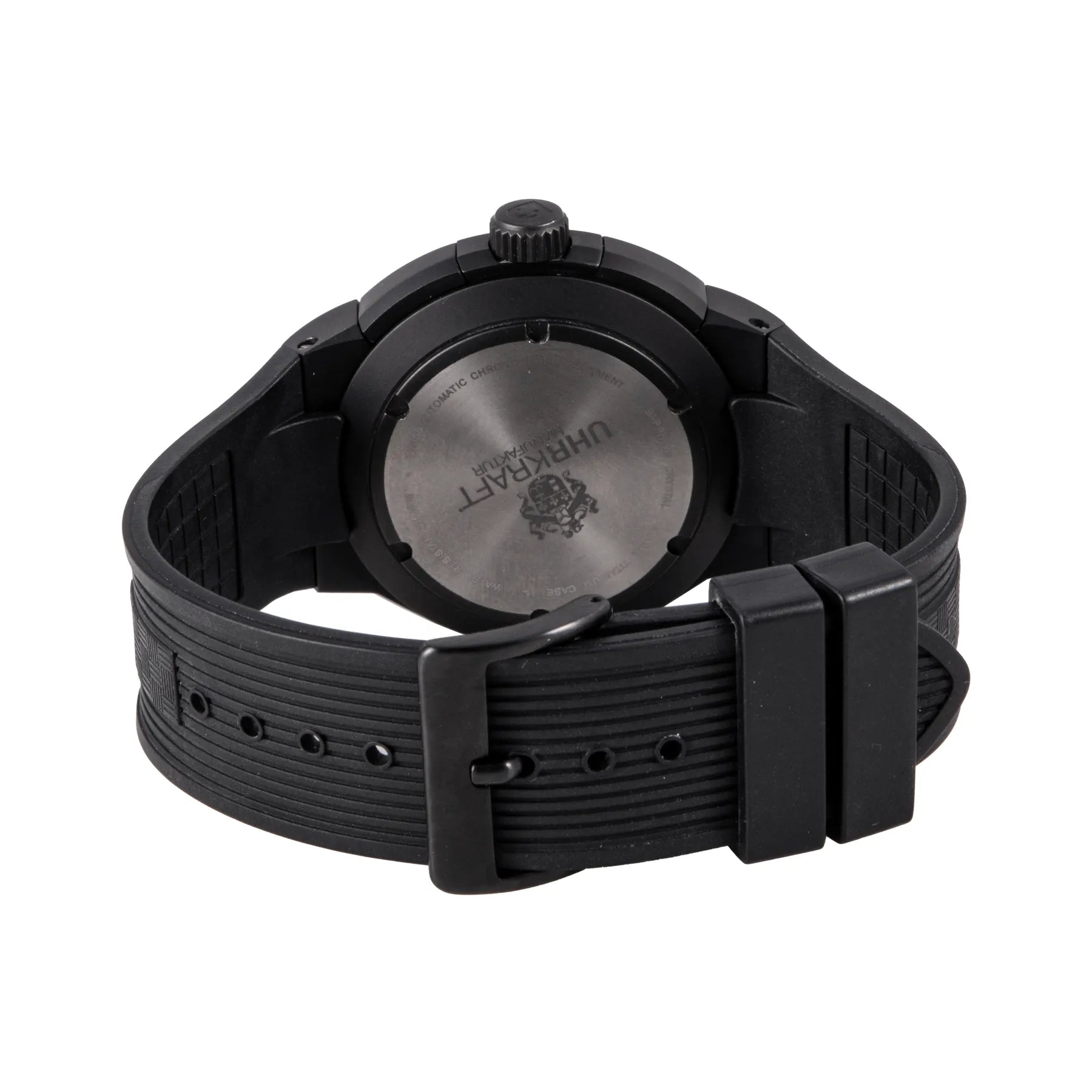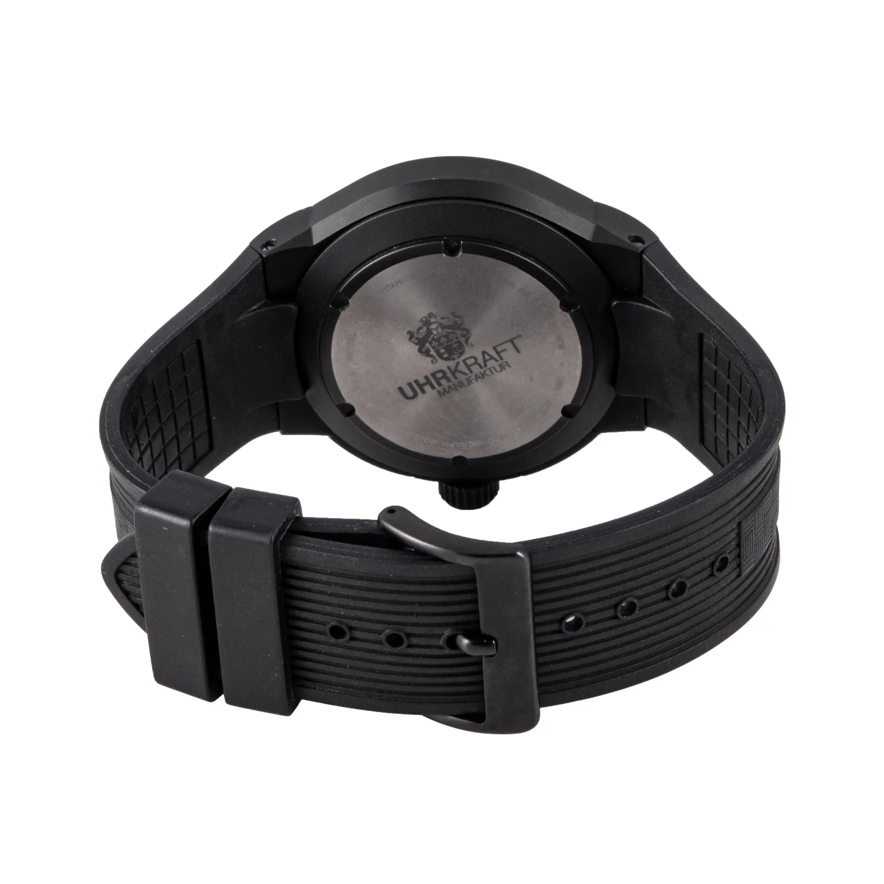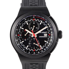 This UHR Kraft Titan Chronograph 46mm, titanium case, black dial, titanium bezel and black rubber strap is in excellent condition. Mechanised by UHR Kraft calibre 7750 automatic movement. Includes box, extra buckle, sales warranty card dated April 2022, and 2 years Timepiece360 warranty.