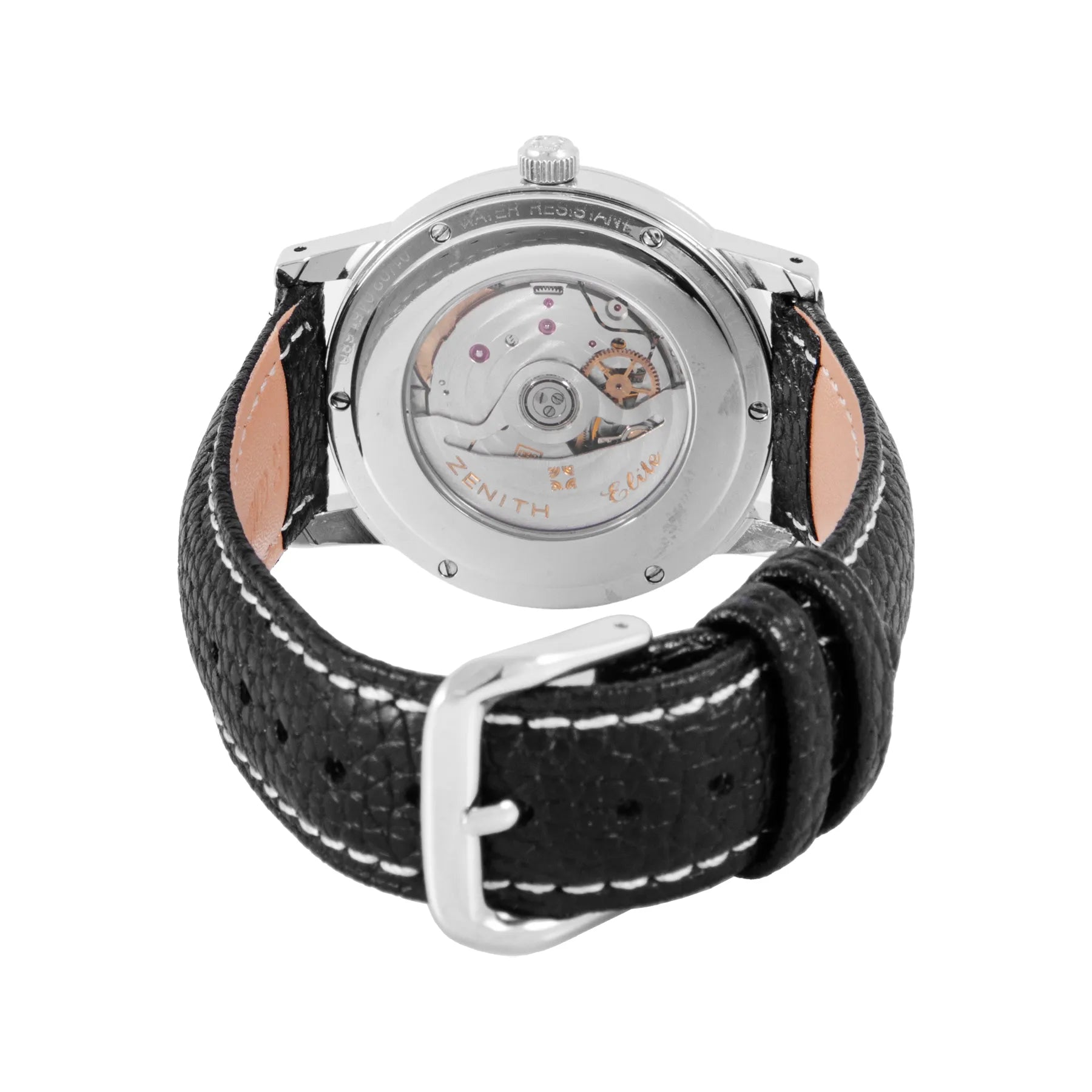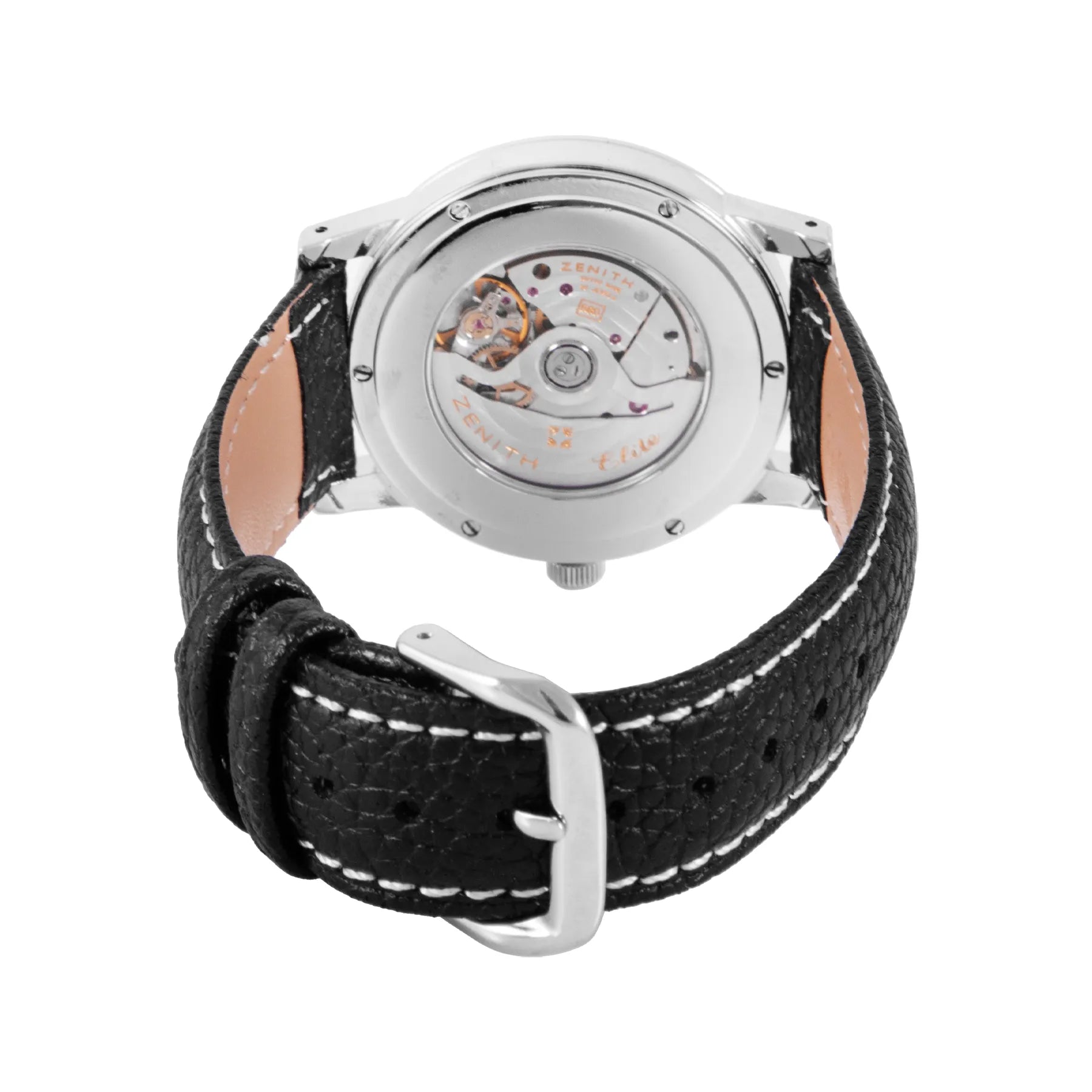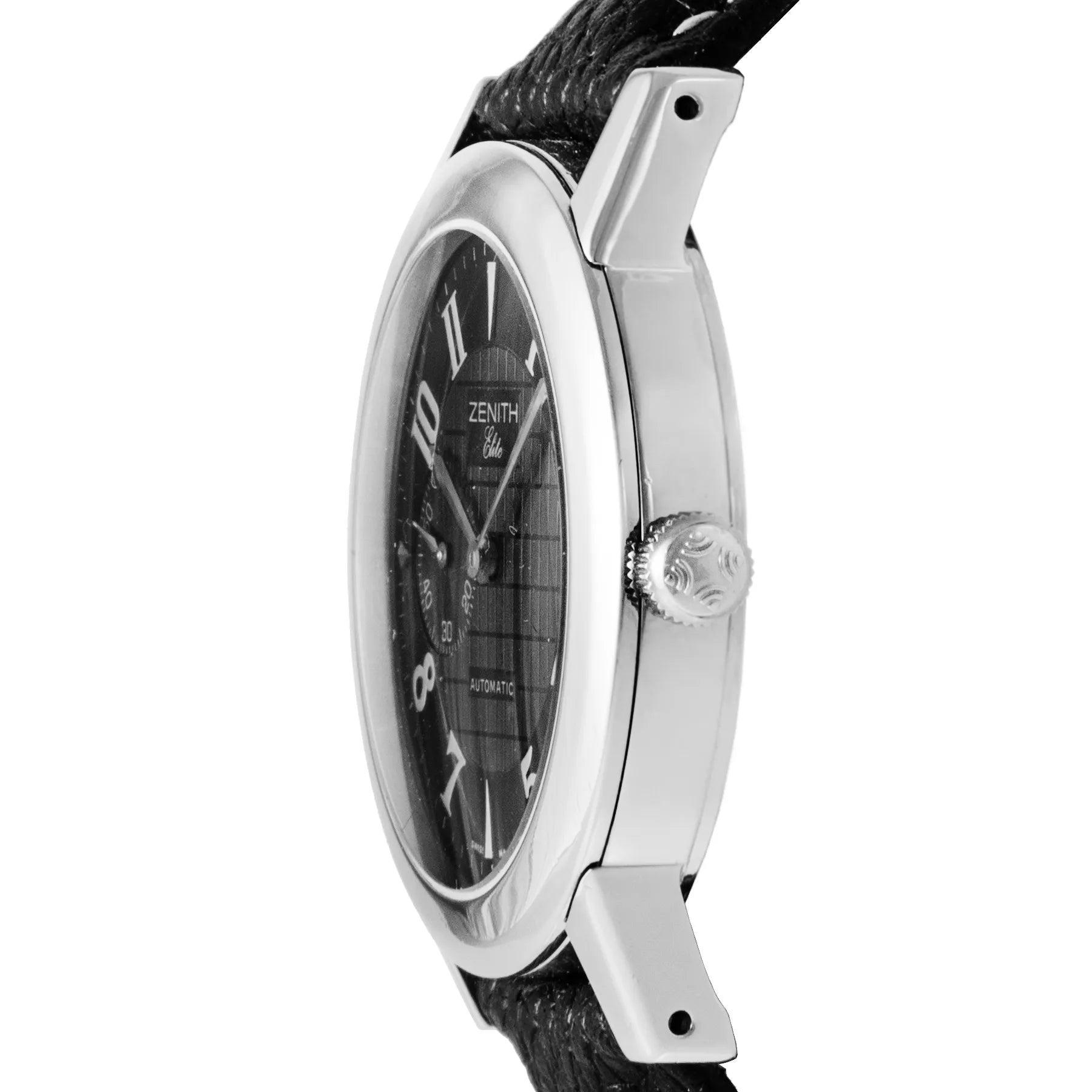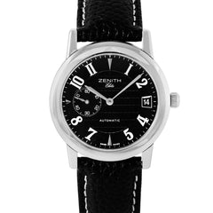 This Pre-owned Zenith Elite "Port Royal" 37mm, steel case, black dial, steel bezel and black aftermarket leather strap is in very good condition. Mechanised by Zenith calibre 680 automatic movement. Includes extra Zenith strap, travel pouch, sales warranty card dated February 2002, and 2 years Timepiece360 warranty.