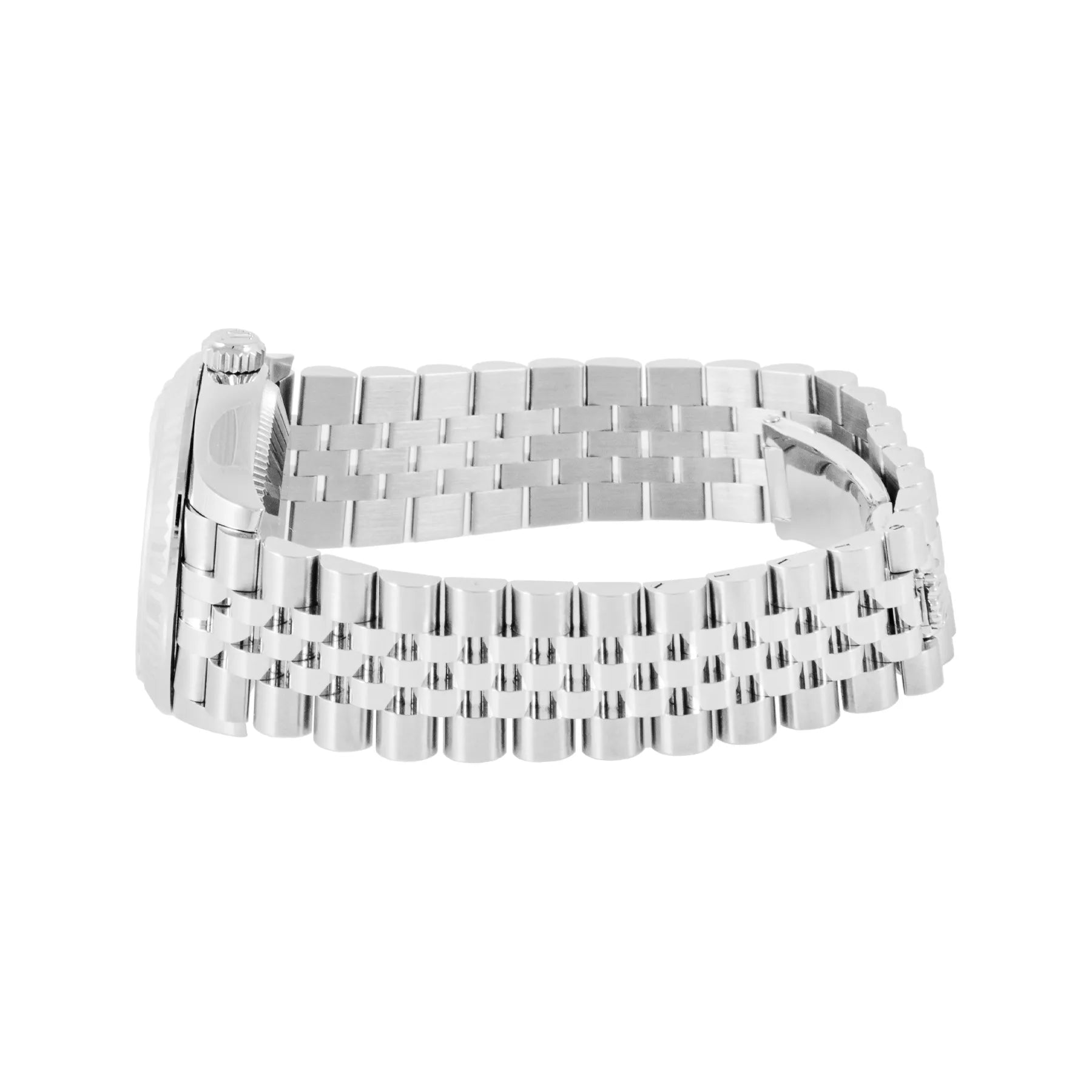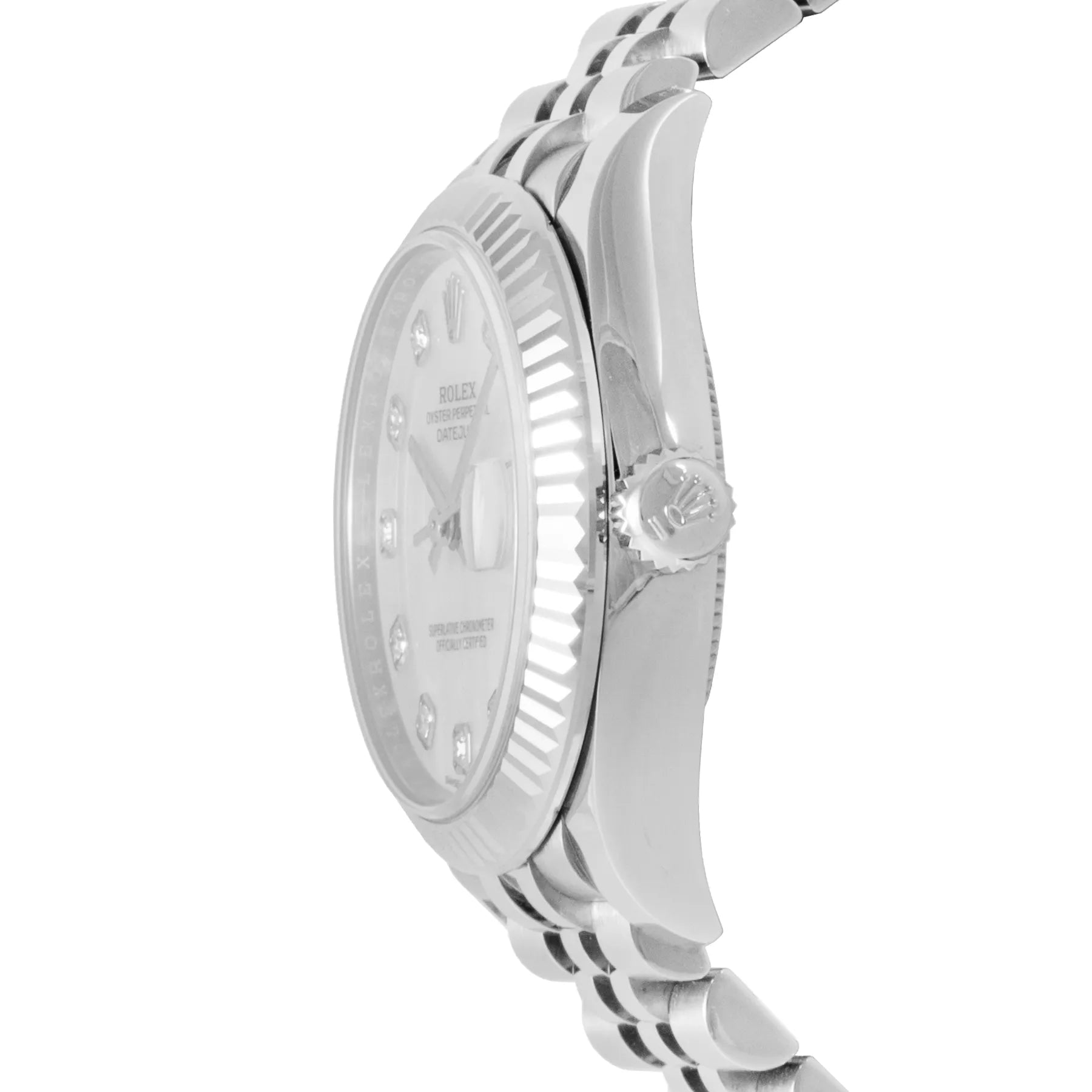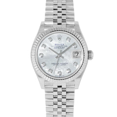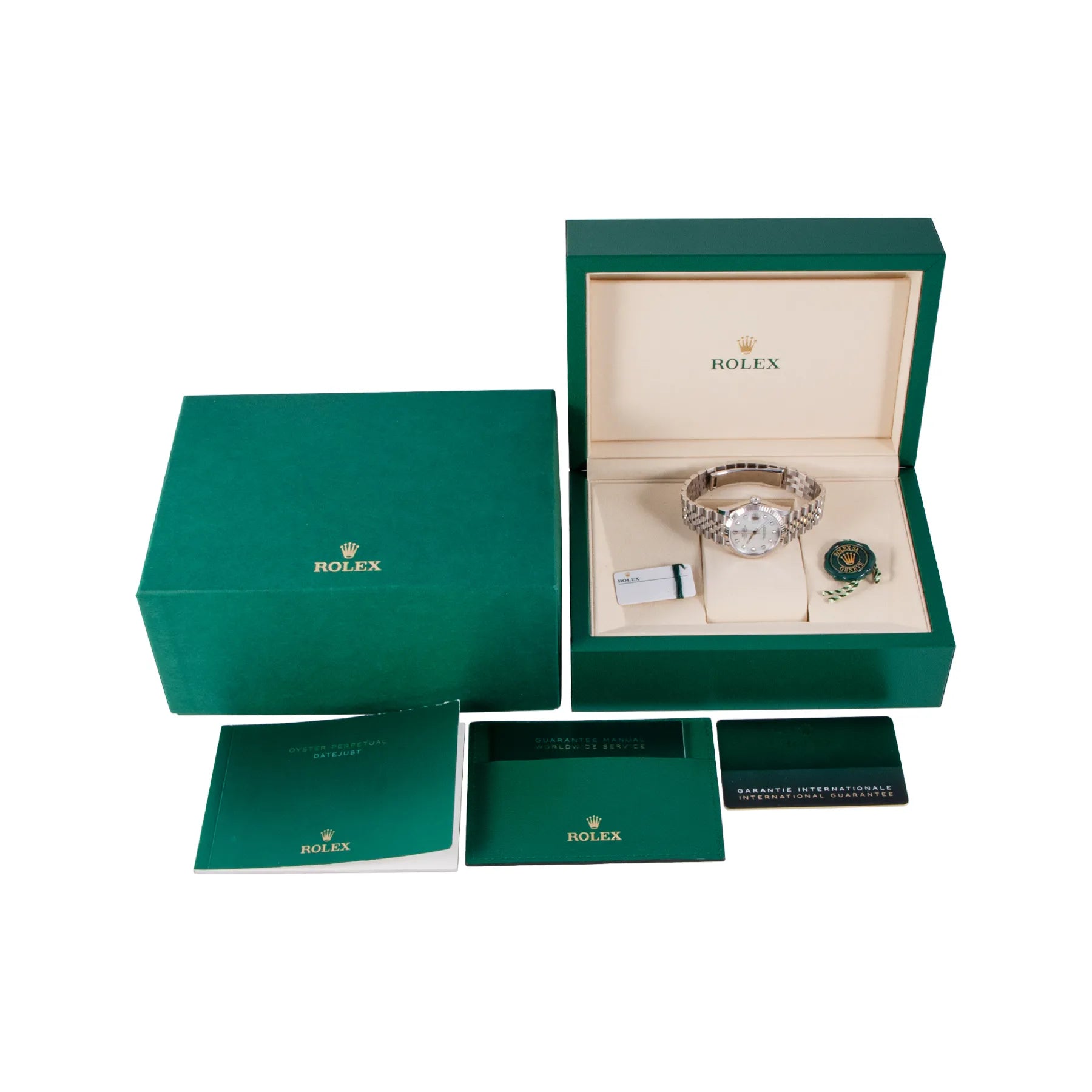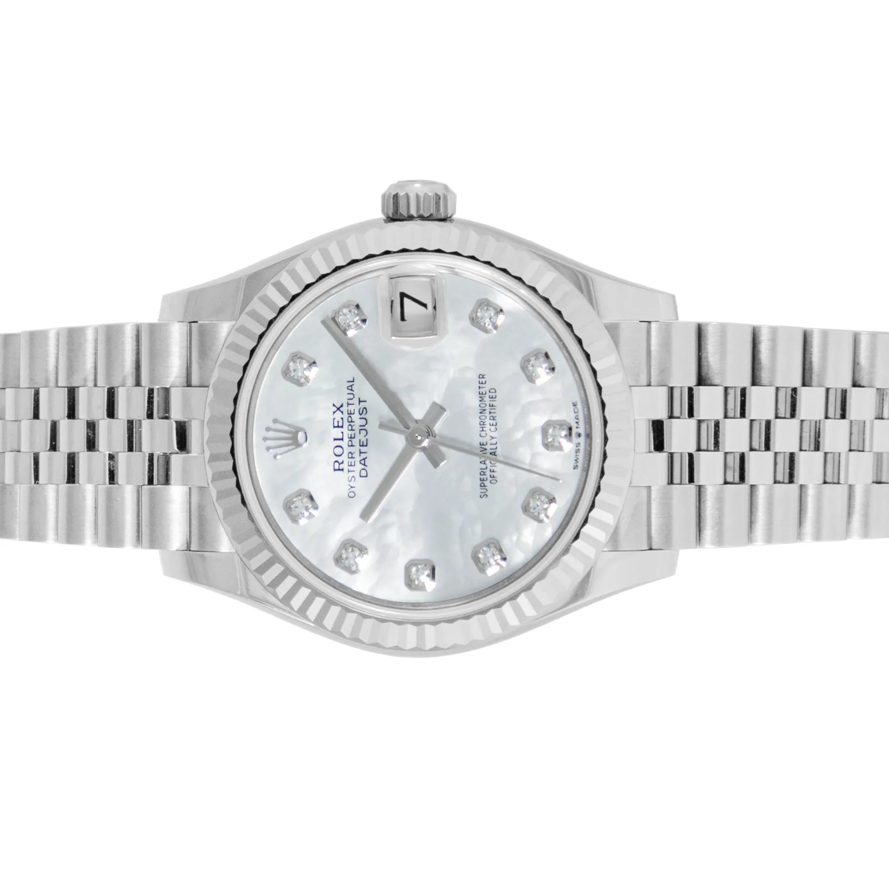 This Pre-owned Rolex Datejust 31mm, steel case, mother of pearl diamond dial, white gold bezel and steel jubilee bracelet with 24 links in very good condition. Mechanised by Rolex calibre 2236 automatic movement. Includes box and Rolex sales warranty card dated November 2025.
