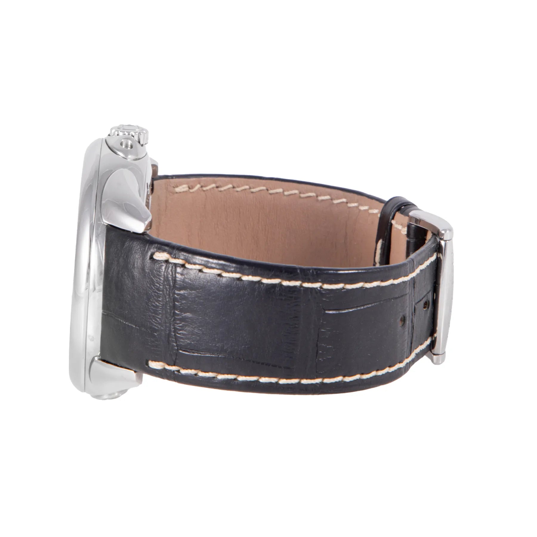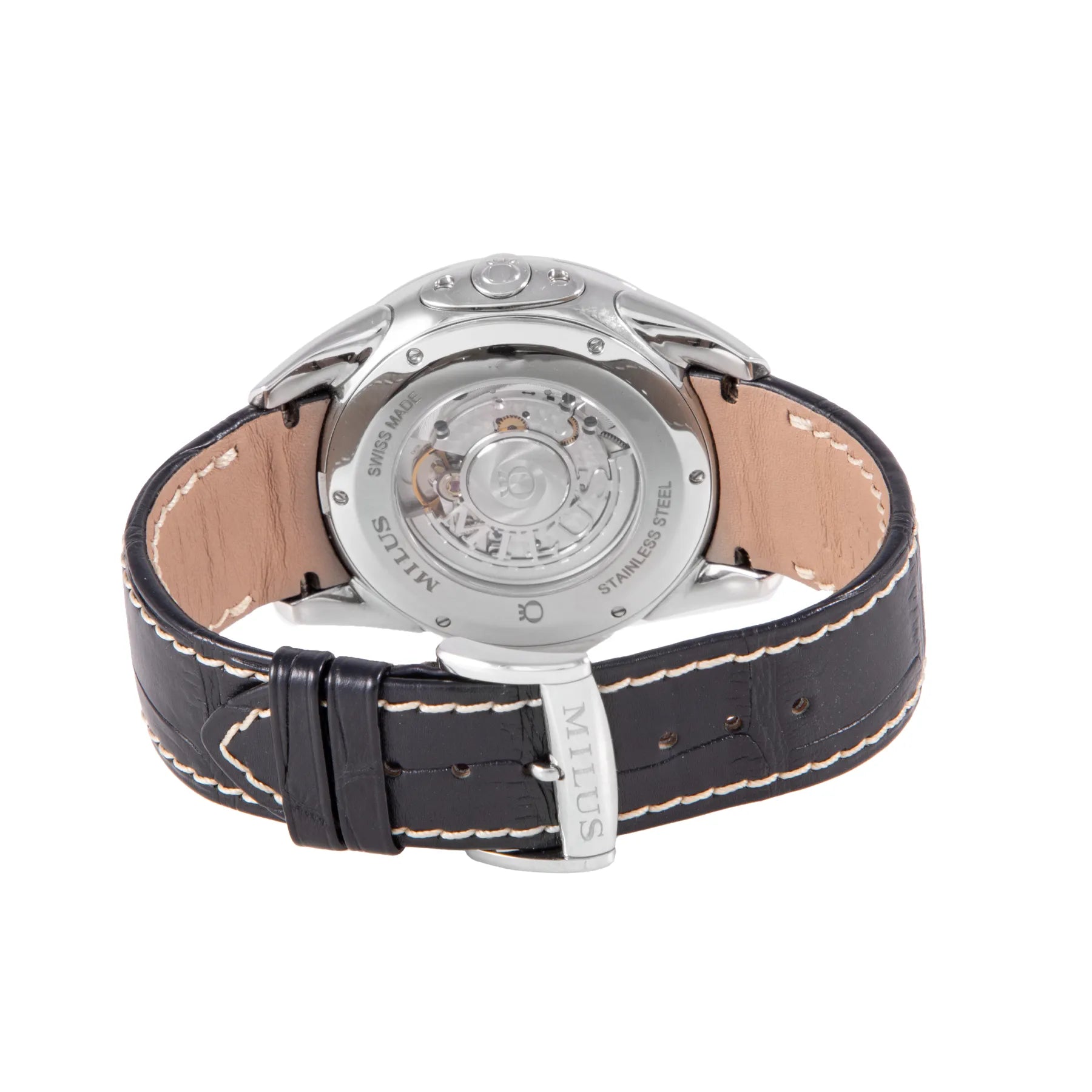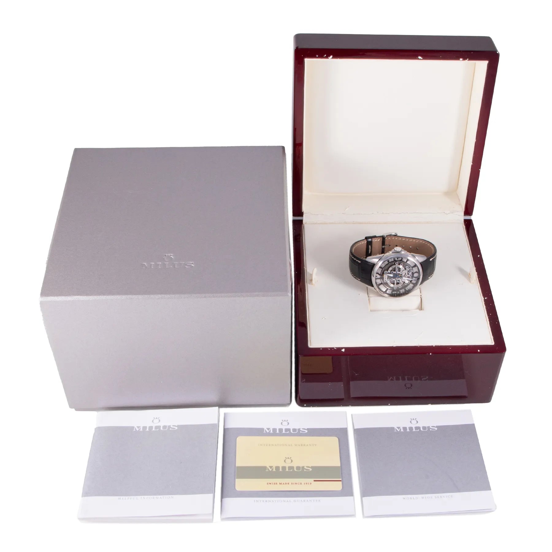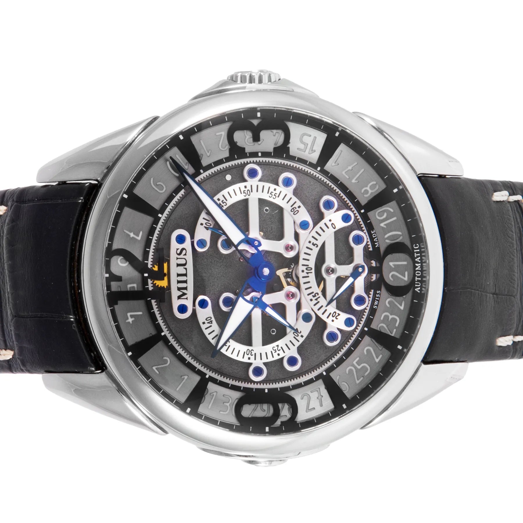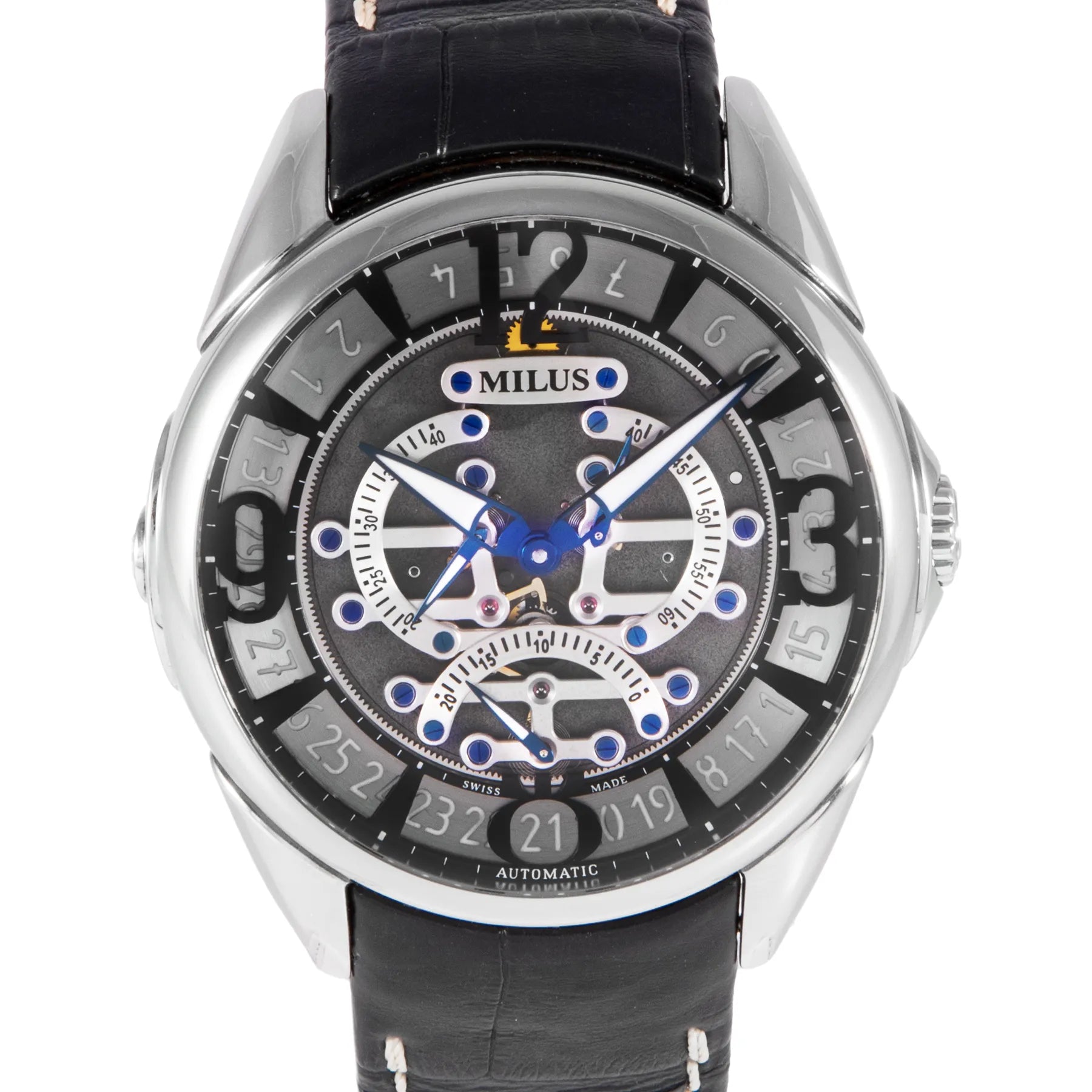 This Pre-owned Milus Tri Retrograde 45mm, steel case, grey dial, steel bezel and black leather strap is in excellent condition. Mechanised by Milus calibre 2892 A2 automatic movement. Includes box, sales warranty card dated May 2010 and 2 years Timepiece360 warranty.