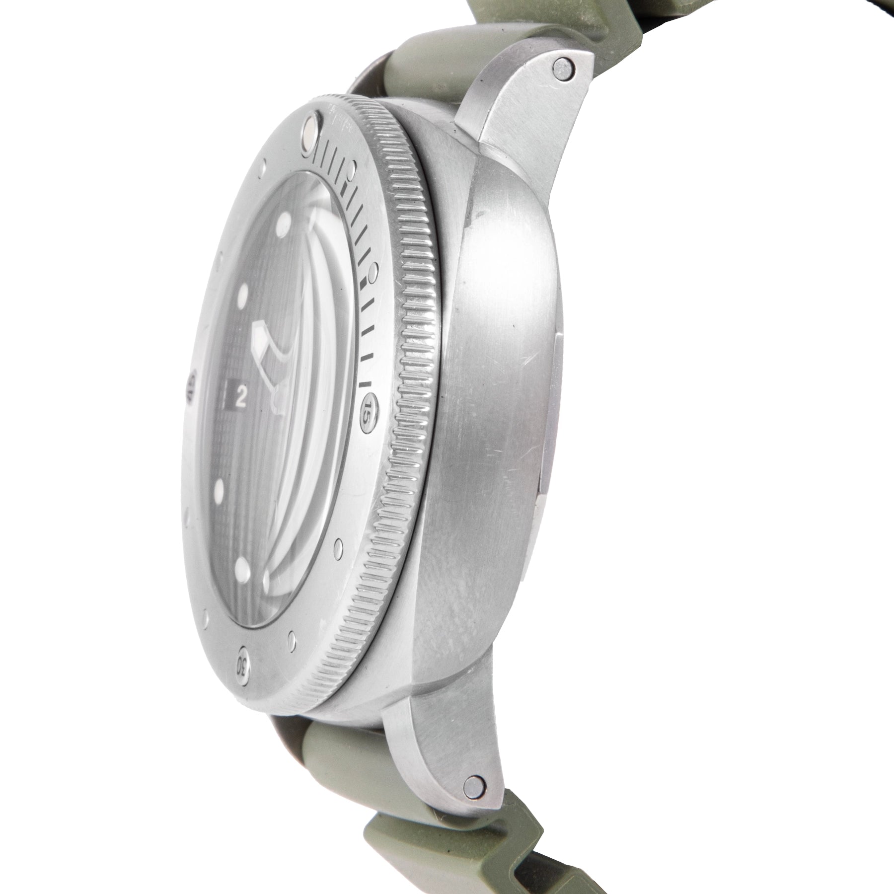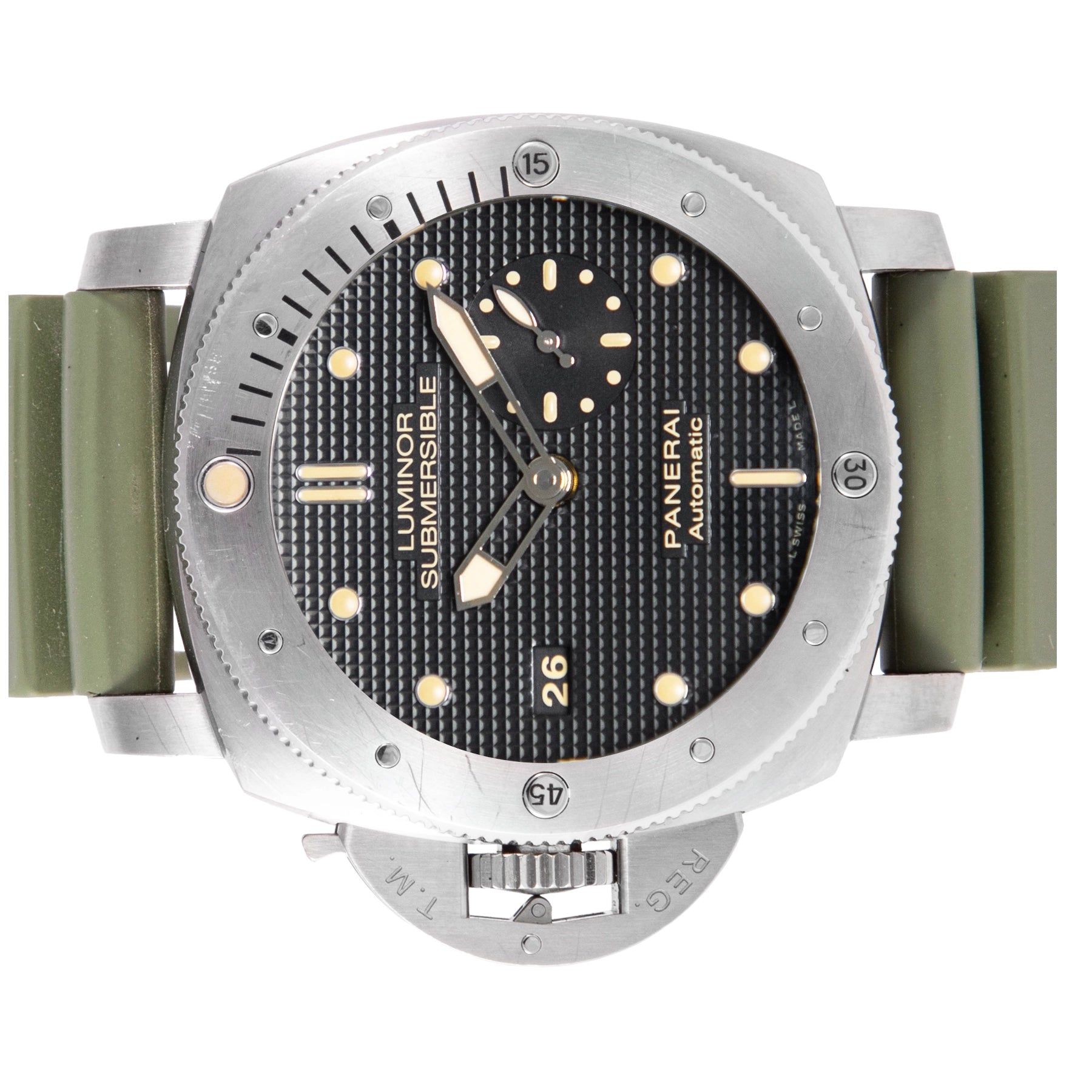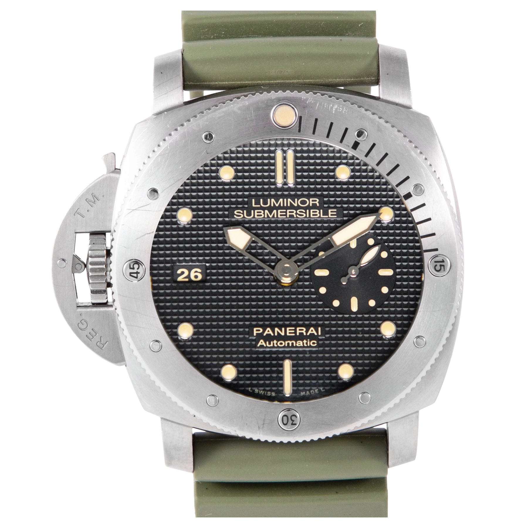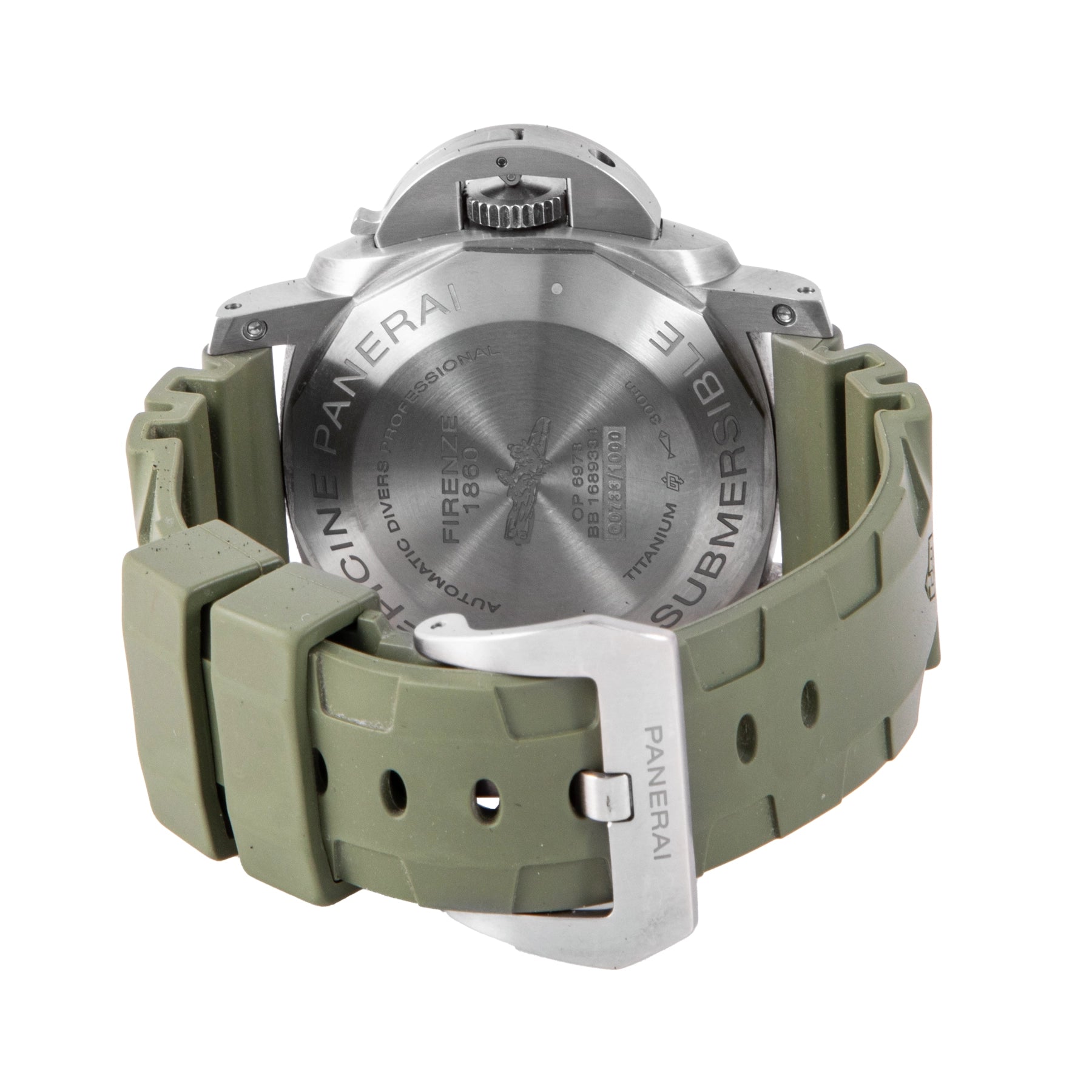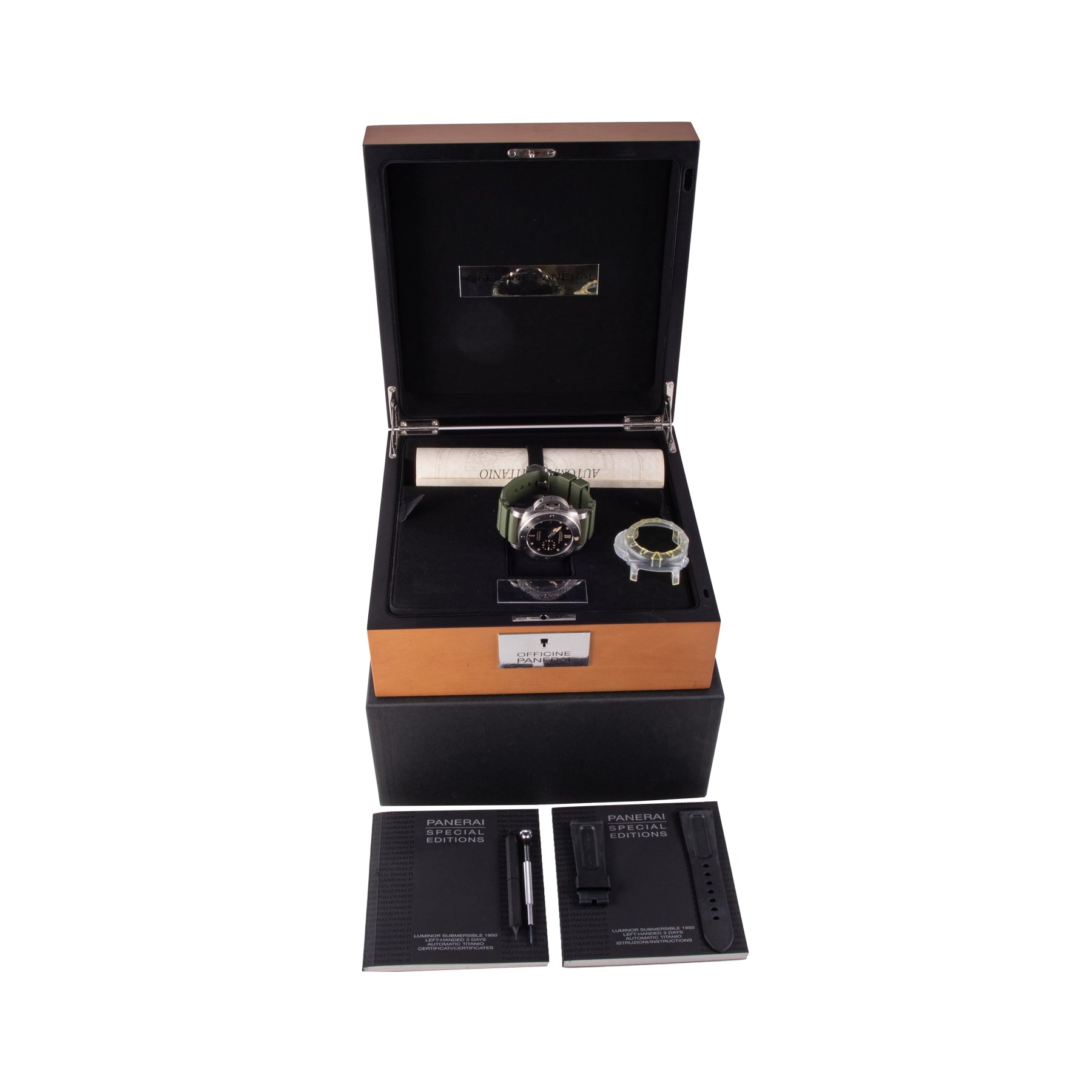 This Pre-owned Officine Panerai Luminor Submersible 1950 Left-Handed 3 Days 47mm, titanium case, black dial, titanium bezel and green rubber strap is in very good condition. Mechanised by Officine Panerai calibre P.9000 automatic movement. This watch is limited to 1000 pieces only. Includes box, extra rubber strap, sales warranty card dated December 2011 and 2 years Timepiece360 warranty. Global Average Retail Price: AED 39,270/-