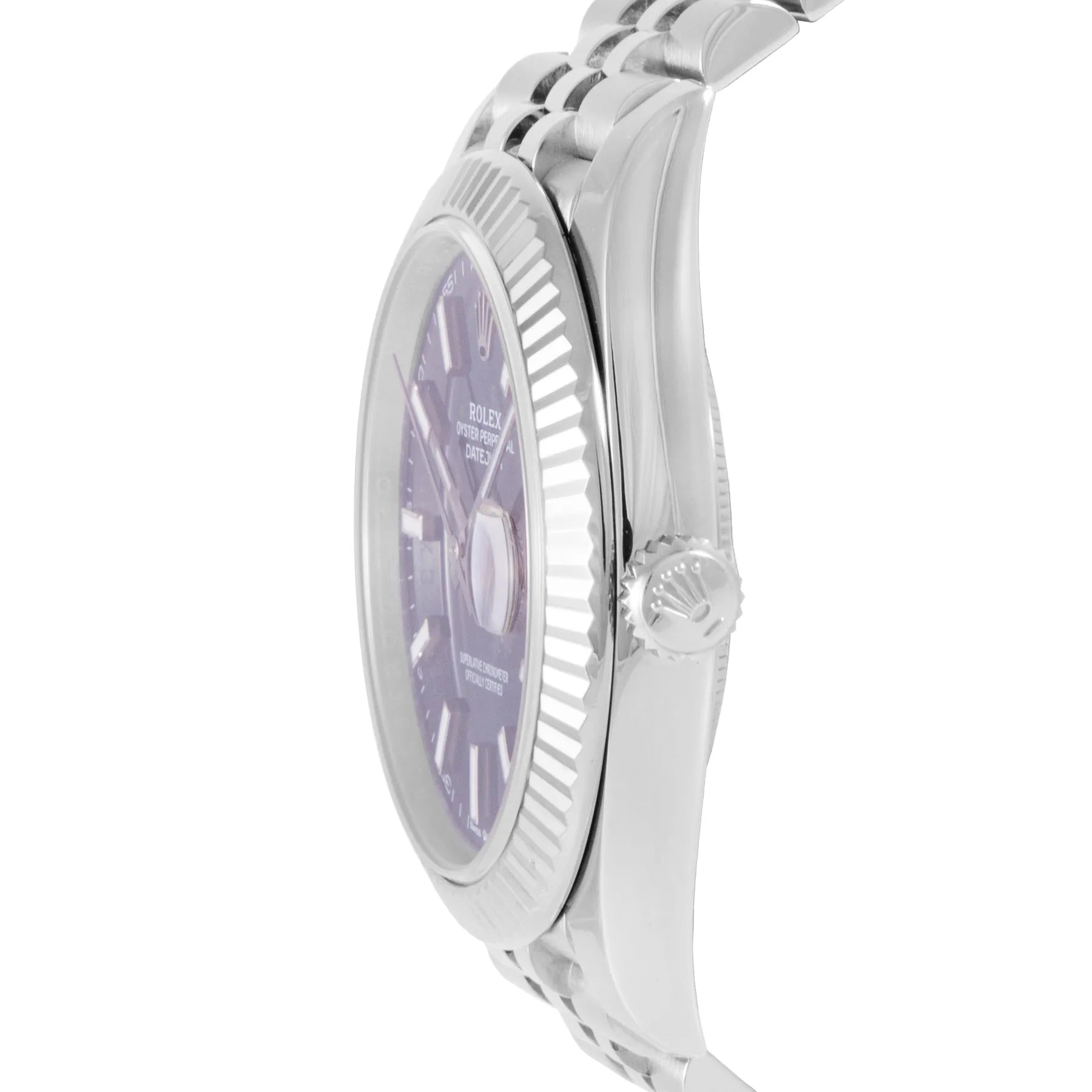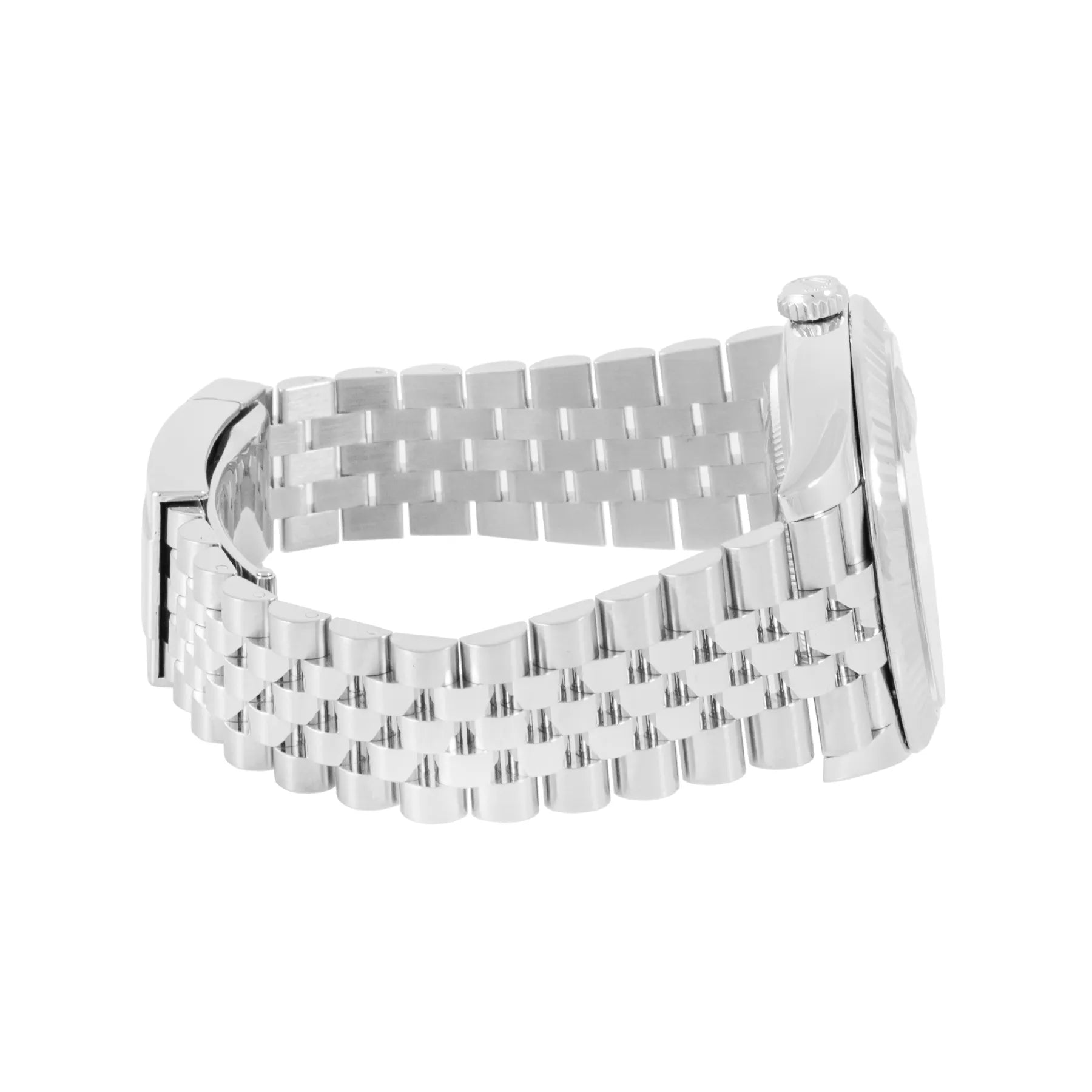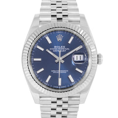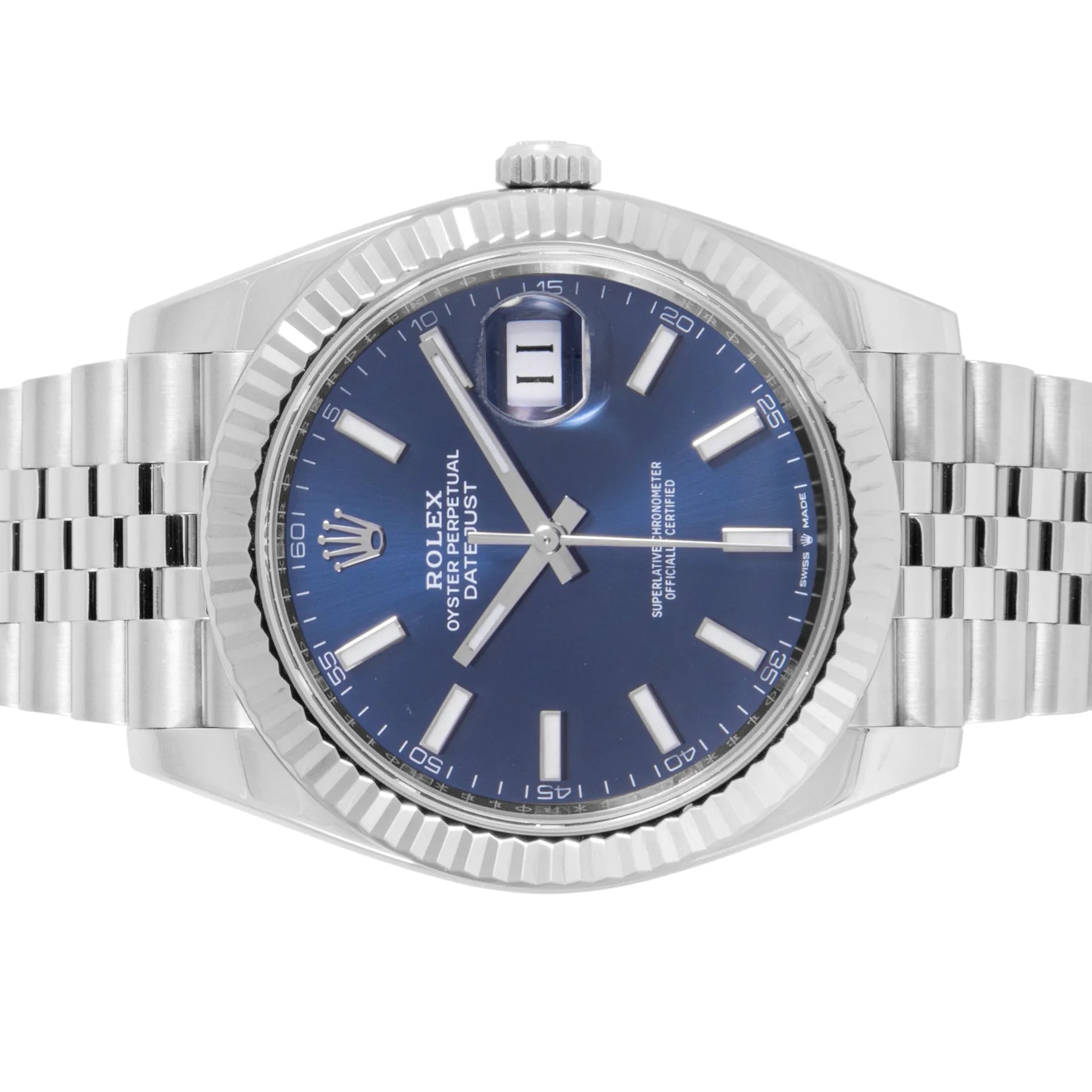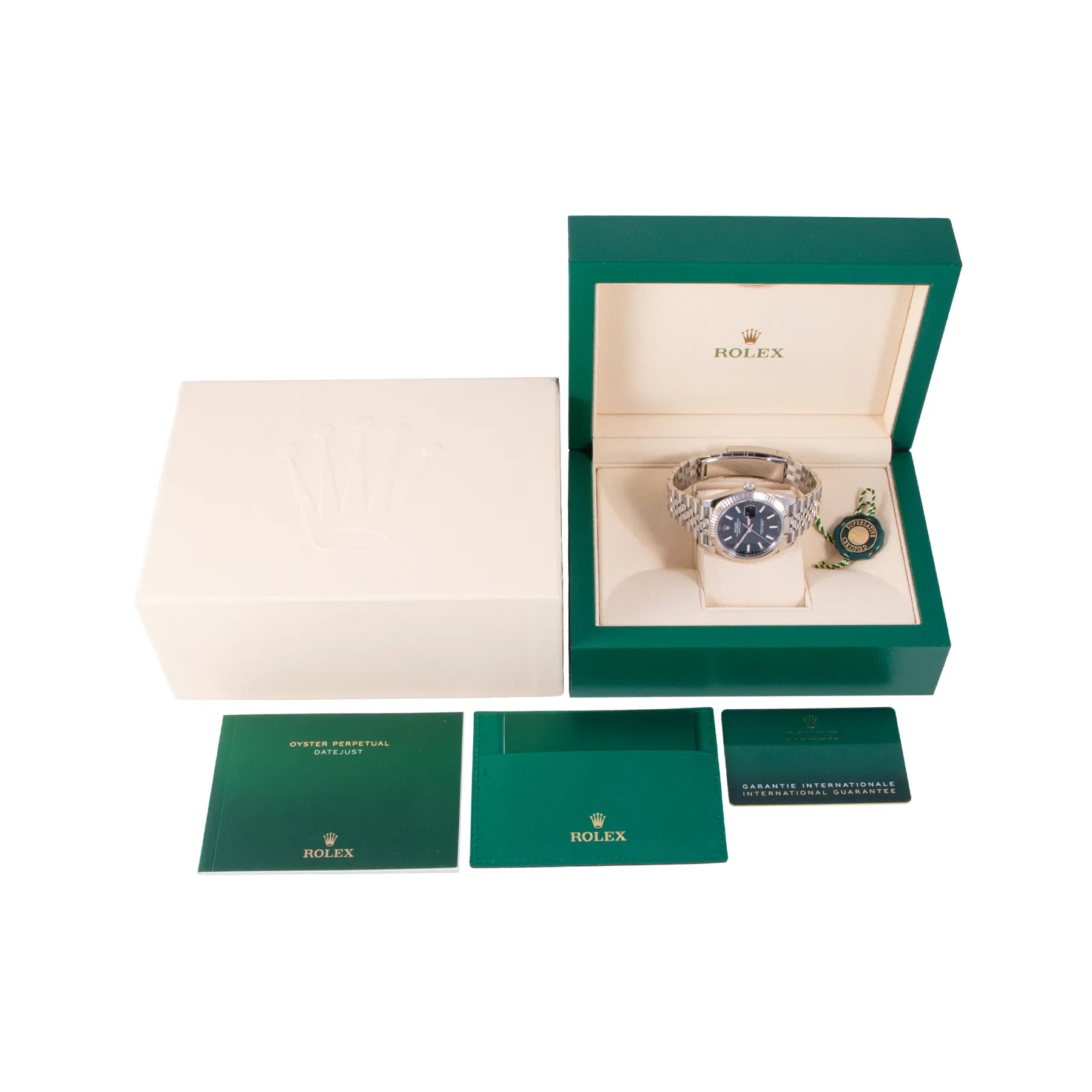 This Pre-owned Rolex Datejust 41mm steel case, blue dial, white gold fluted bezel and steel jubilee bracelet with 20 links is in very good condition. Mechanised by Rolex calibre 3235 automatic movement. Includes box and sales warranty card dated September 2023.