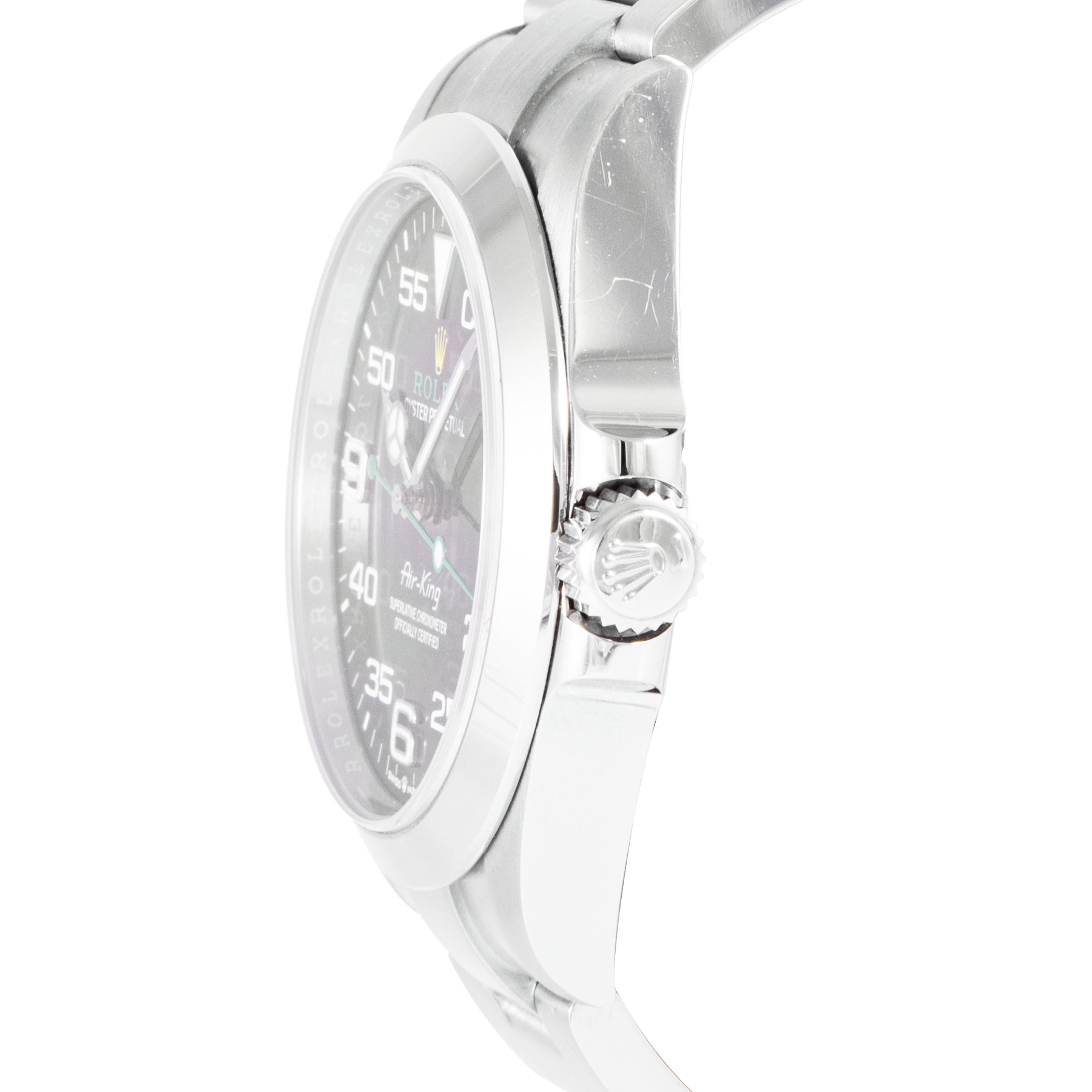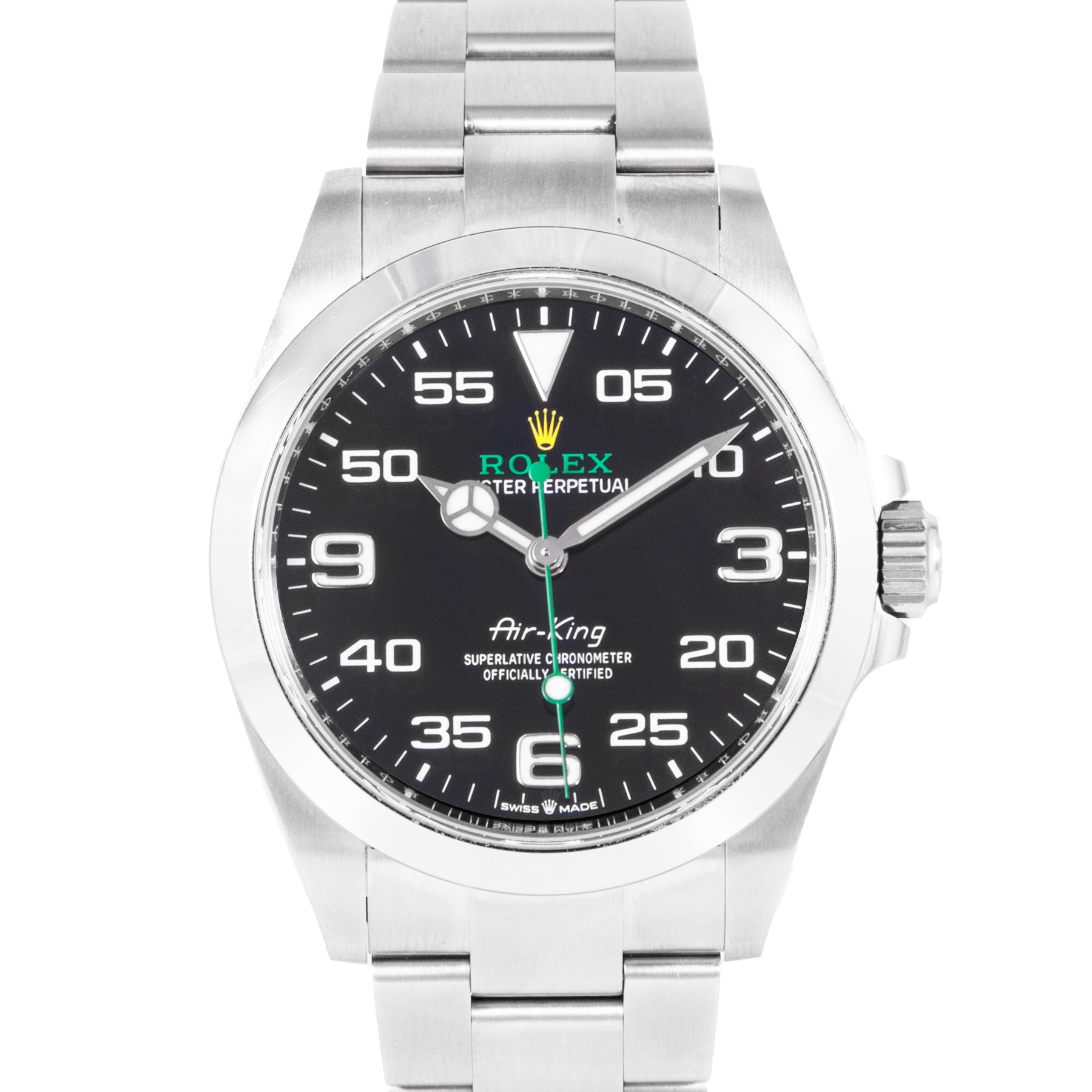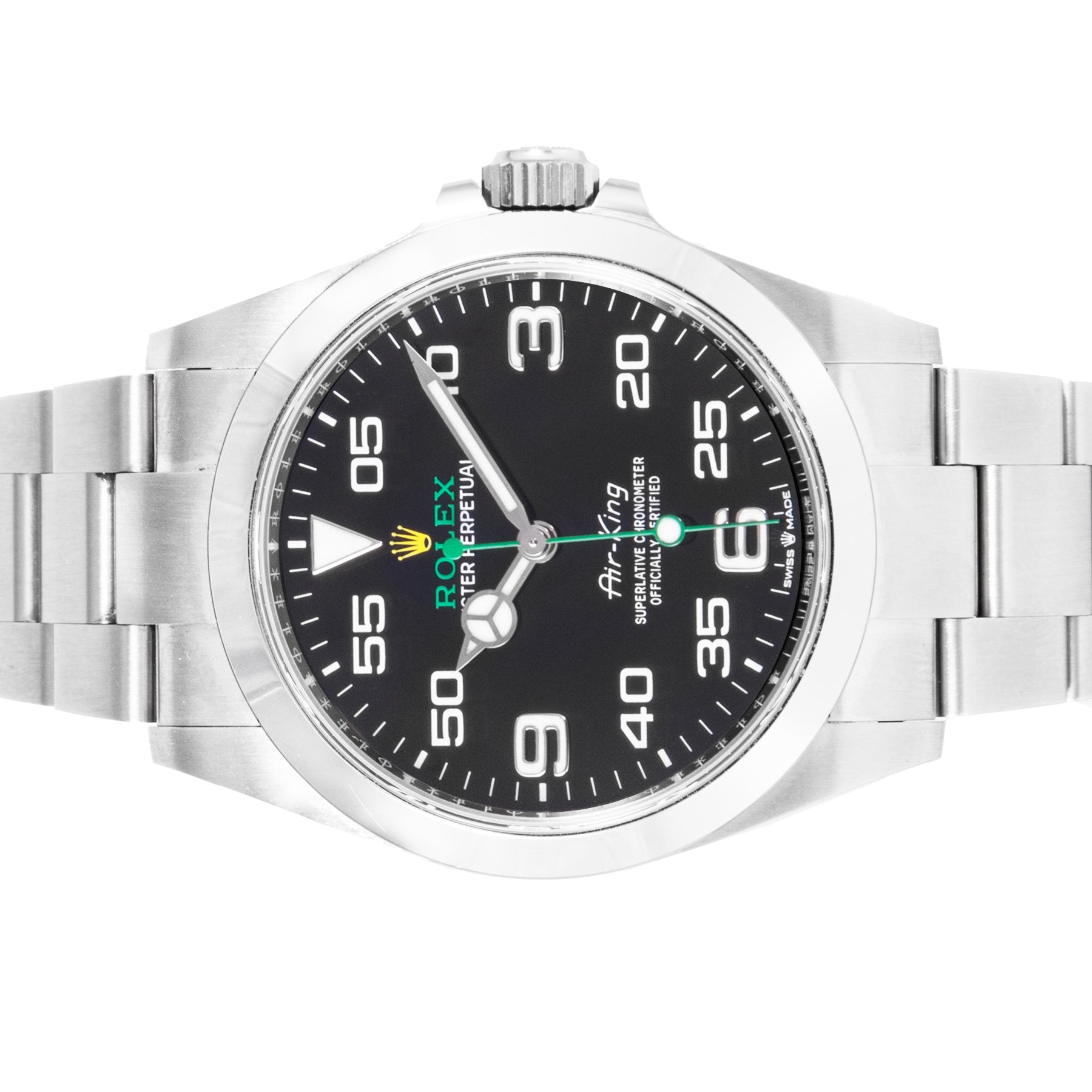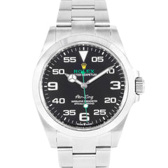 This Rolex Air-King 40mm, steel case, black dial steel bezel and steel oyster bracelet with 12 links is in excellent condition. Mechanised by Rolex calibre 3230 automatic movement. Includes box and sales warranty card dated August 2022.