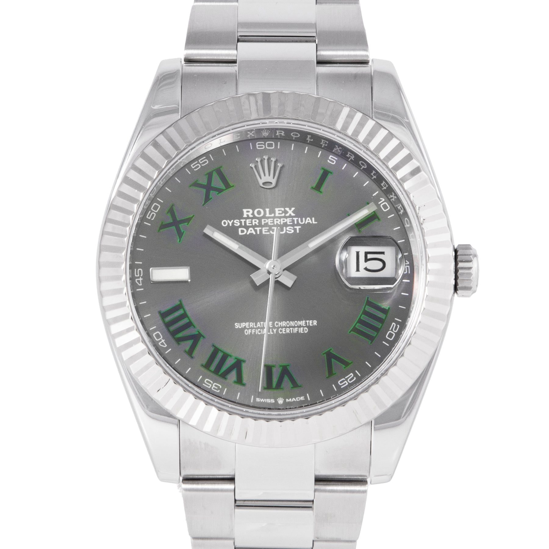 This Pre-owned Rolex Datejust 41mm, steel case, "Wimbledon" slate grey dial, white gold fluted bezel and steel oyster bracelet with 12 links is in excellent condition. Mechanised by Rolex calibre 3235 automatic movement. Includes box, Rolex sales warranty card dated June 2019 and 2 years Timepiece360 warranty.
